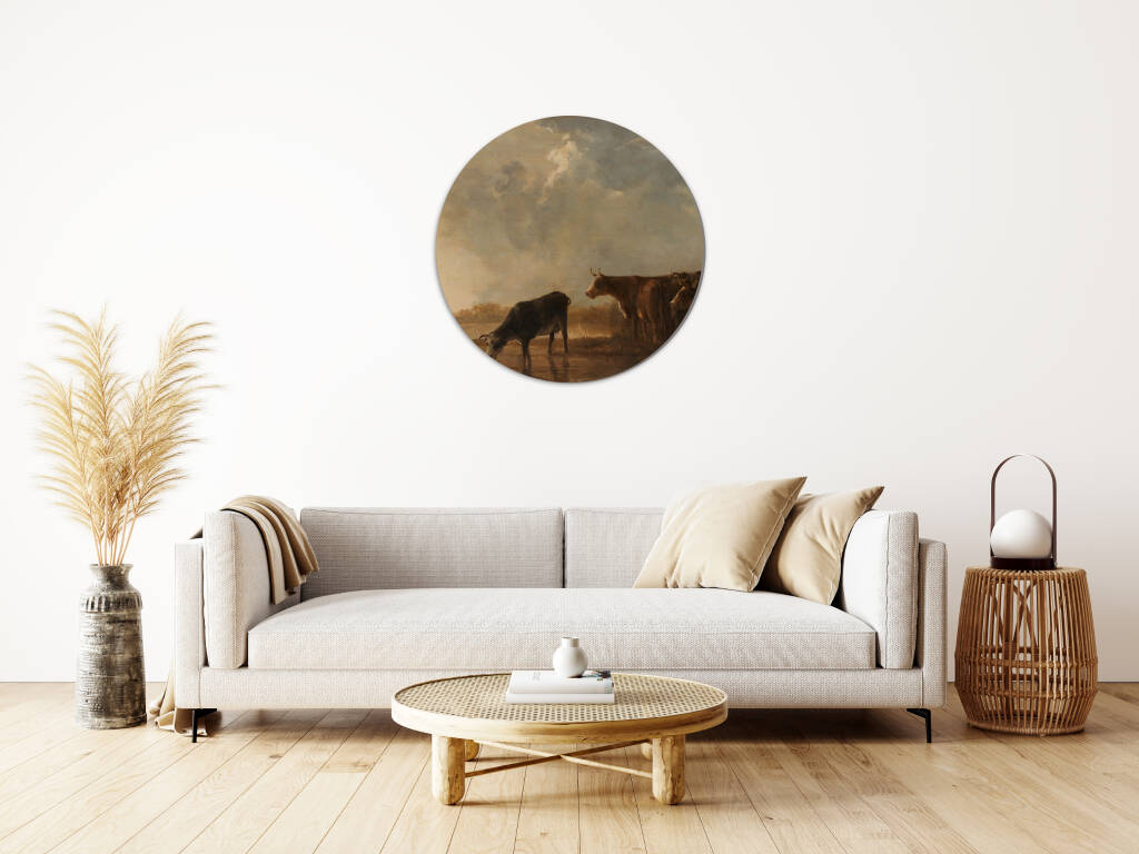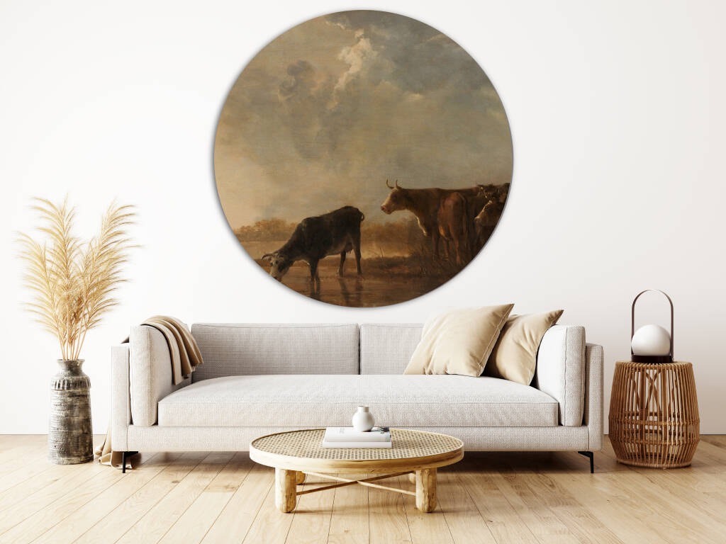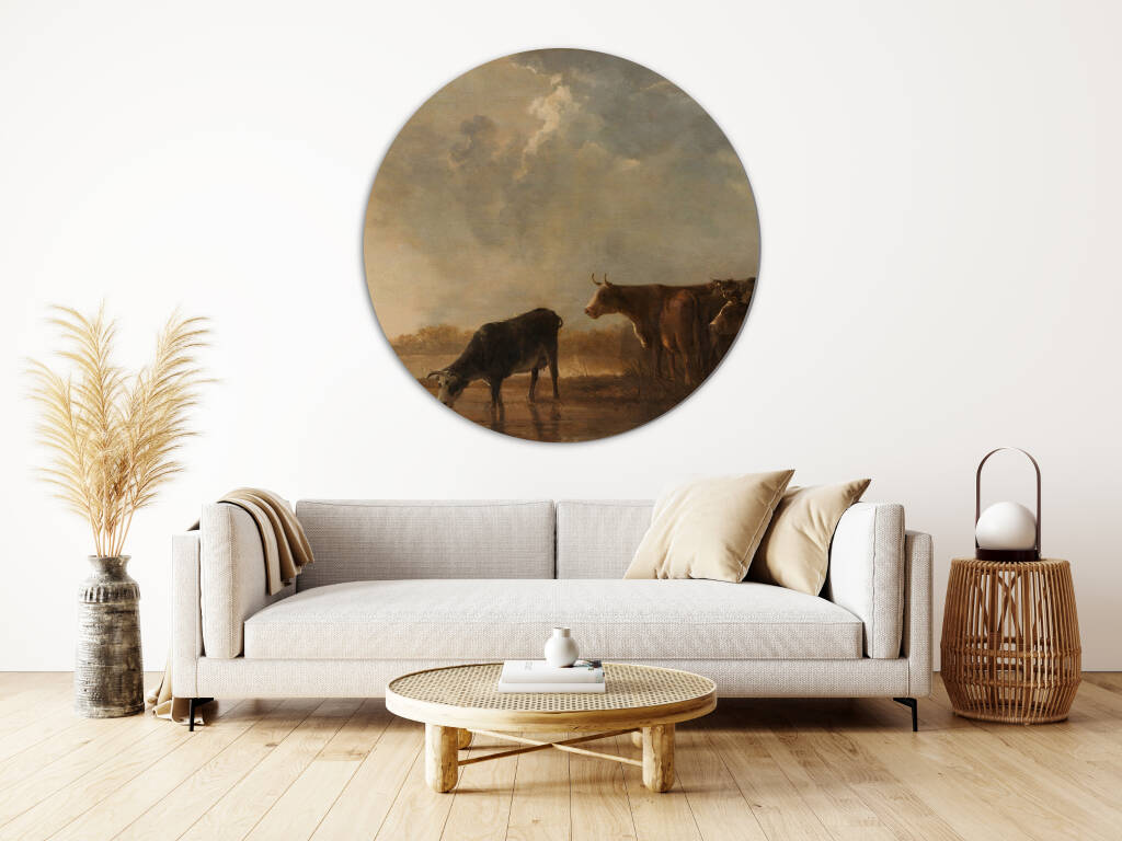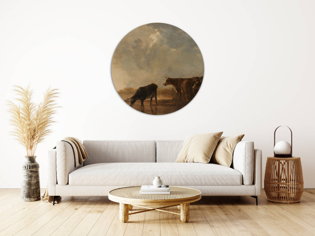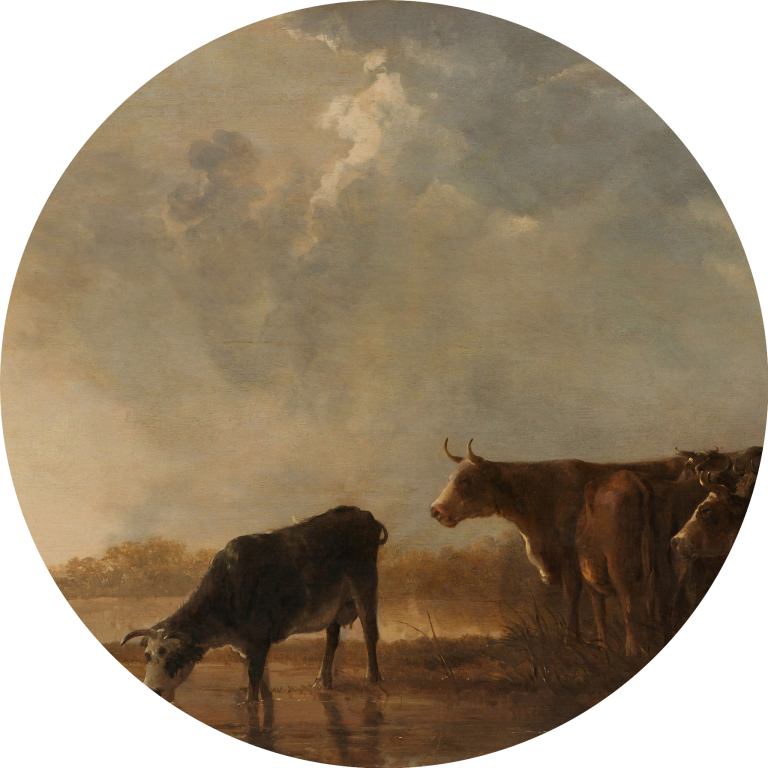 Rivierlandschap met Koeien belichaamt de tijdloze schoonheid van het Nederlandse polderlandschap. In het zachte licht van de late namiddag drinken koeien aan de oever van een kalme rivier, terwijl dramatische wolkenpartijen zich spiegelen in het water. De warme, gouden tinten van het zonlicht contrasteren prachtig met de dreigende lucht, wat een sfeer van verwachting creëert. Dit pastorale tafereel uit de Gouden Eeuw vangt de essentie van het landelijke leven, waar mens en dier in harmonie leven met de natuur. De meesterlijke weergave van licht en atmosfeer, kenmerkend voor de Nederlandse landschapsschilderkunst, maakt dit tot een werk dat zowel rust als grandeur uitstraalt. Een ode aan de eenvoudige schoonheid van het Nederlandse platteland.
