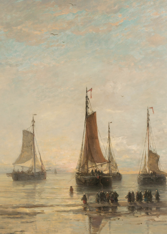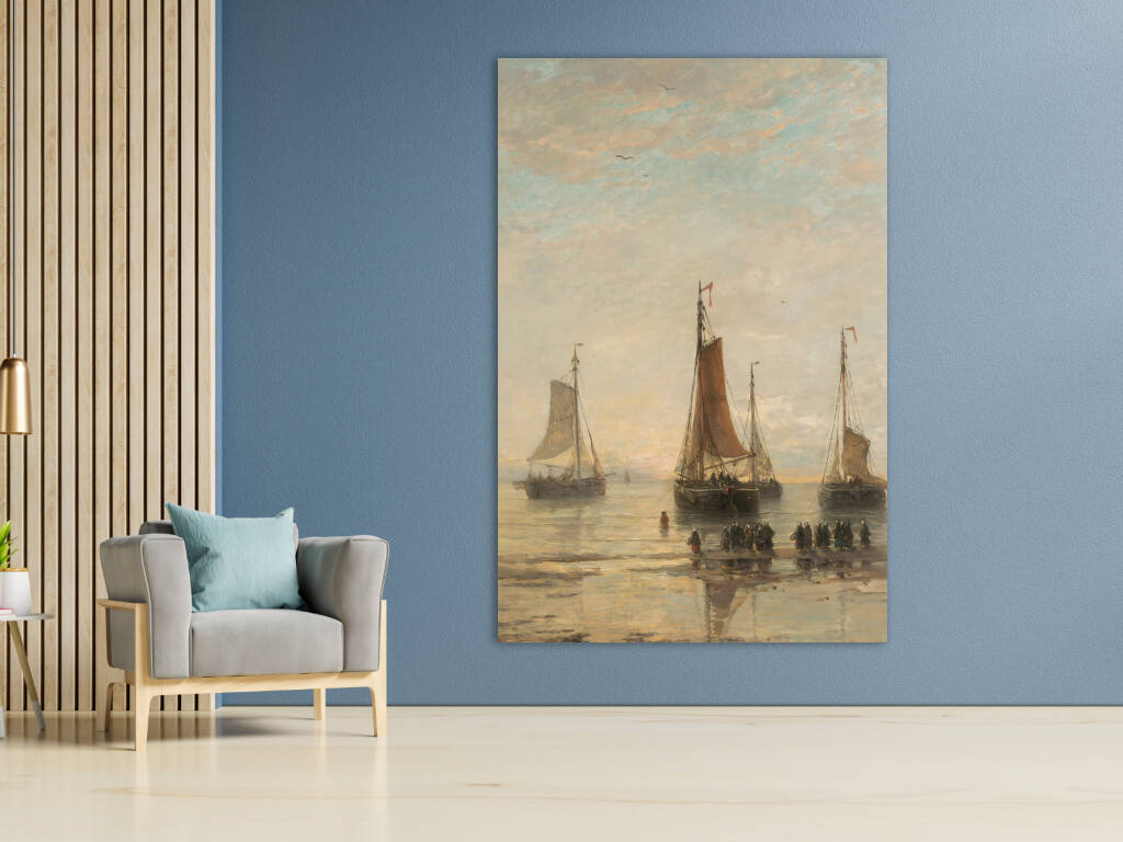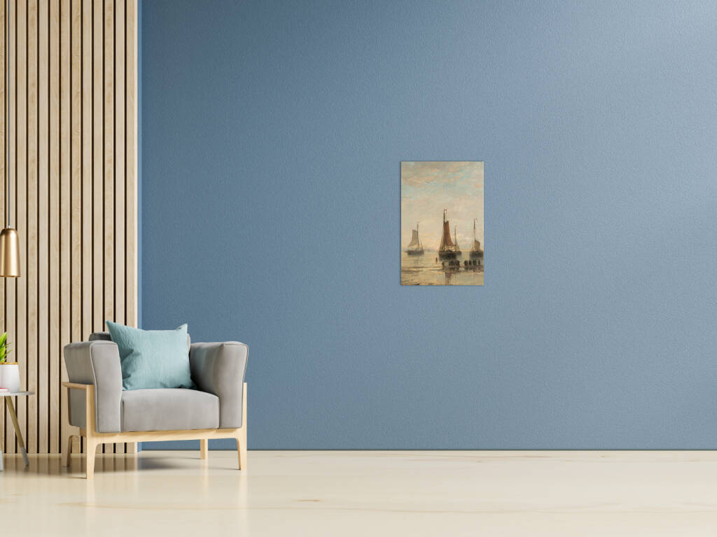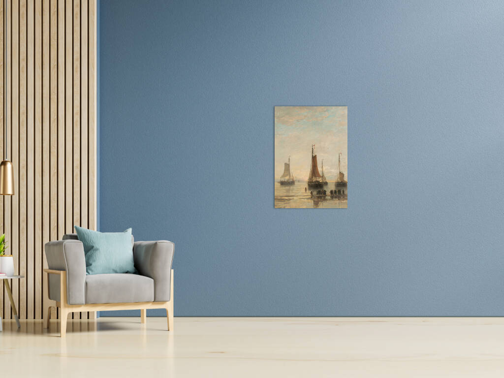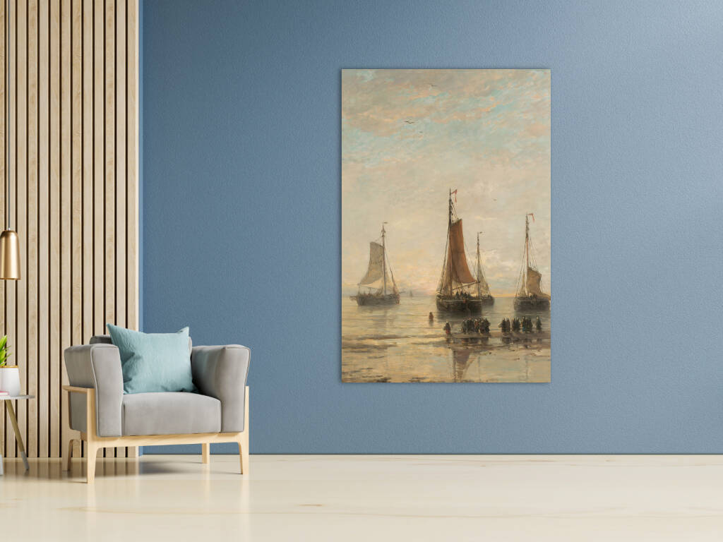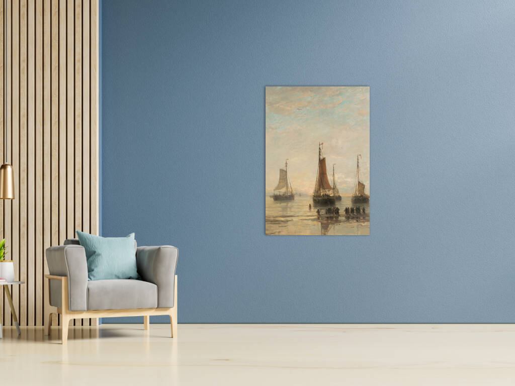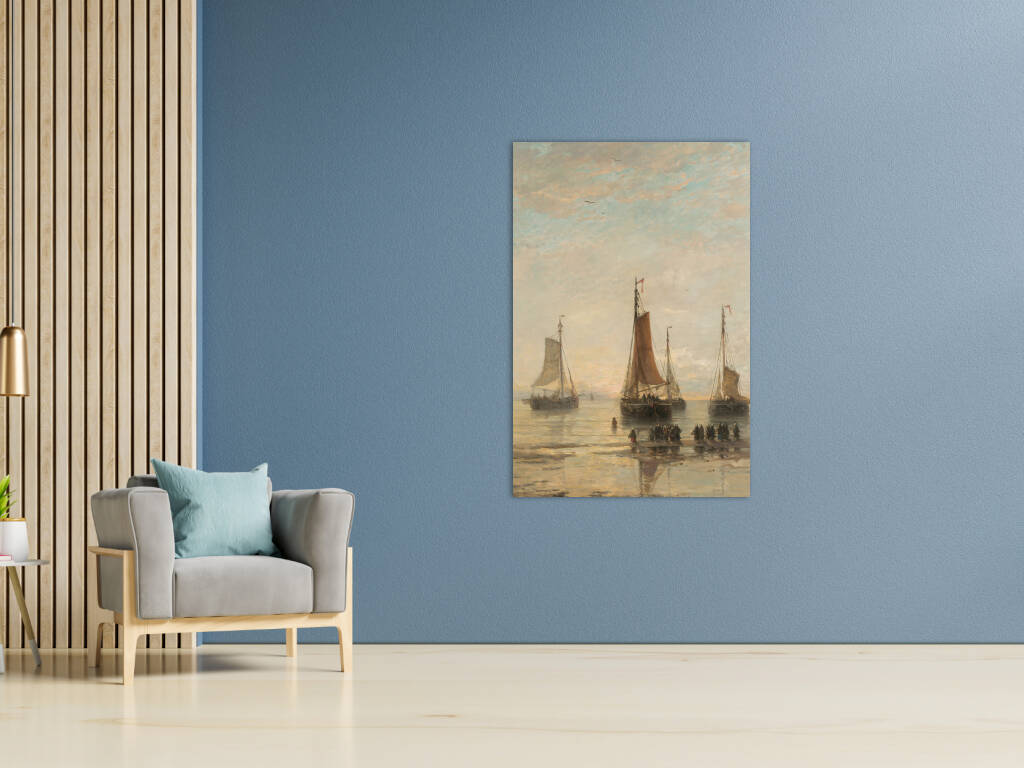 Scheveningse Bommen voor Anker vangt een vredige scène van vissersschepen voor de kust van Scheveningen. De karakteristieke bommen - platte vissersvaartuigen - liggen voor anker in kalm water, hun zeilen gestreken na een dag op zee. Het zachte ochtend- of avondlicht baadt het tafereel in warme gouden tinten, terwijl figuren op het strand wachten op de terugkeer van de vloot. De subtiele weerspiegeling van de schepen in het ondiepe water creëert een gevoel van sereniteit en tijdloosheid. Dit maritieme meesterwerk documenteert een belangrijk aspect van de Nederlandse visserijgeschiedenis, waarbij de bommen essentieel waren voor de kustvisserij. Het werk straalt een nostalgische schoonheid uit die het harde bestaan van de vissers romantiseert zonder de waardigheid van hun arbeid te verliezen.