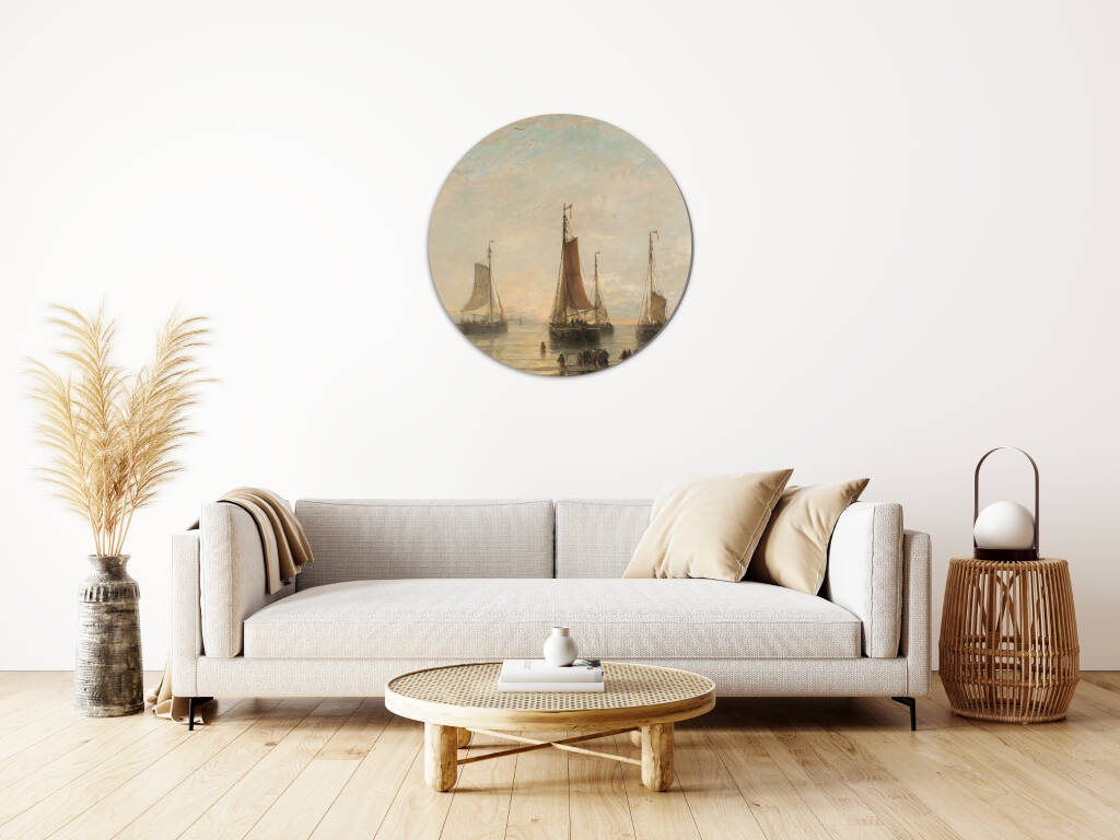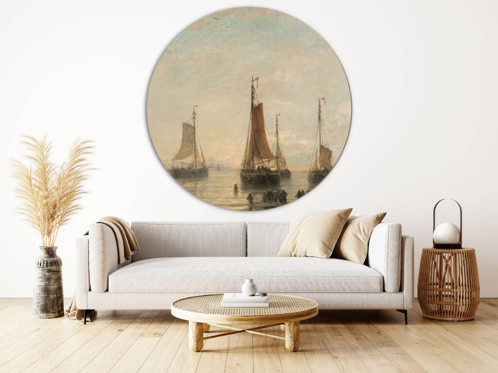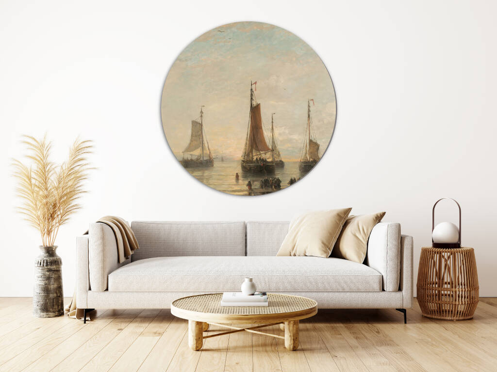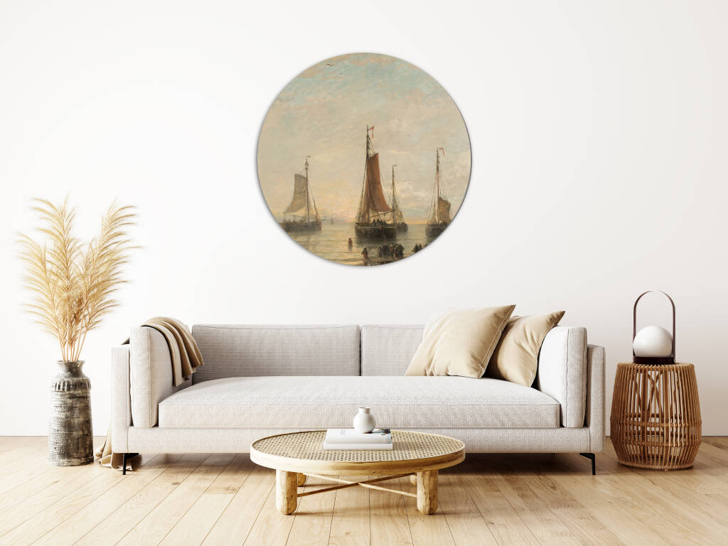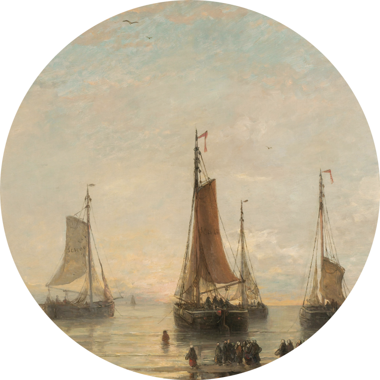Scheveningse Bommen voor Anker vangt een vredige scène van vissersschepen voor de kust van Scheveningen. De karakteristieke bommen - platte vissersvaartuigen - liggen voor anker in kalm water, hun zeilen gestreken na een dag op zee. Het zachte ochtend- of avondlicht baadt het tafereel in warme gouden tinten, terwijl figuren op het strand wachten op de terugkeer van de vloot. De subtiele weerspiegeling van de schepen in het ondiepe water creëert een gevoel van sereniteit en tijdloosheid. Dit maritieme meesterwerk documenteert een belangrijk aspect van de Nederlandse visserijgeschiedenis, waarbij de bommen essentieel waren voor de kustvisserij. Het werk straalt een nostalgische schoonheid uit die het harde bestaan van de vissers romantiseert zonder de waardigheid van hun arbeid te verliezen.