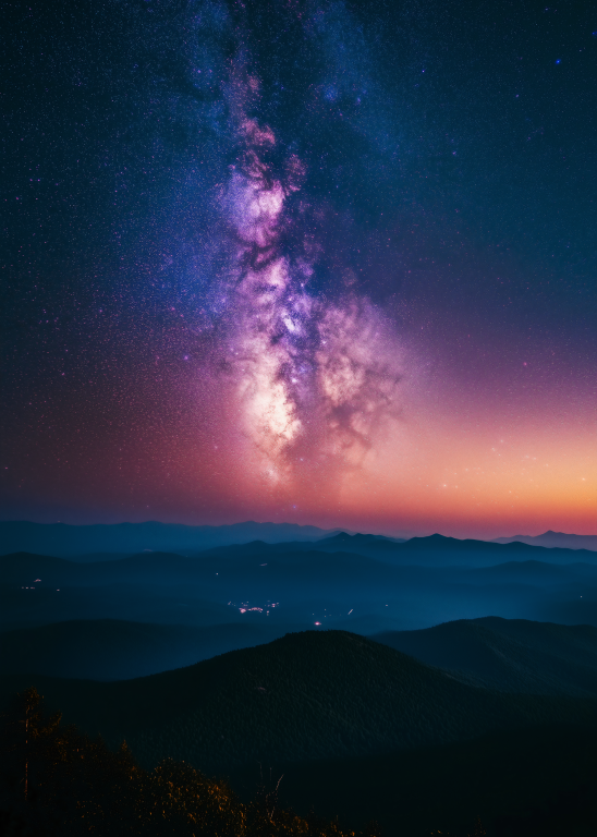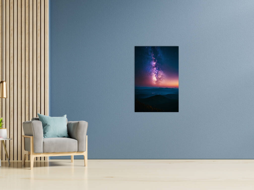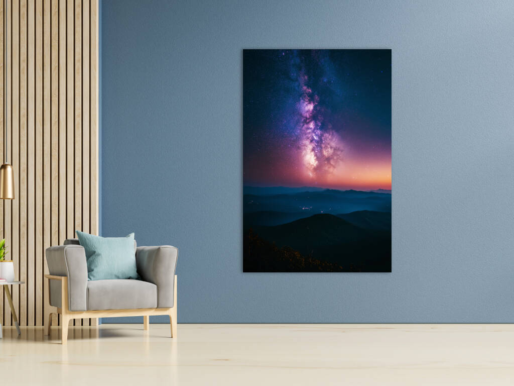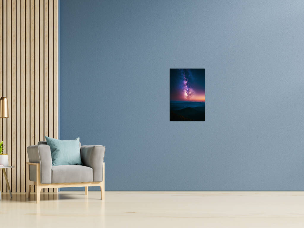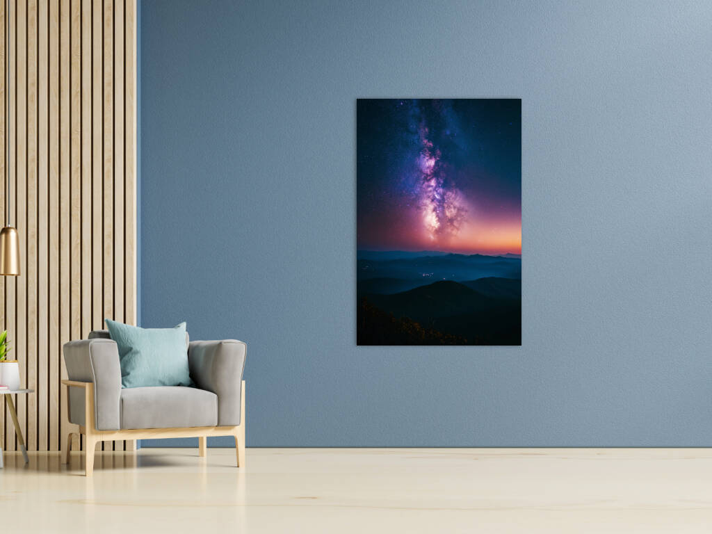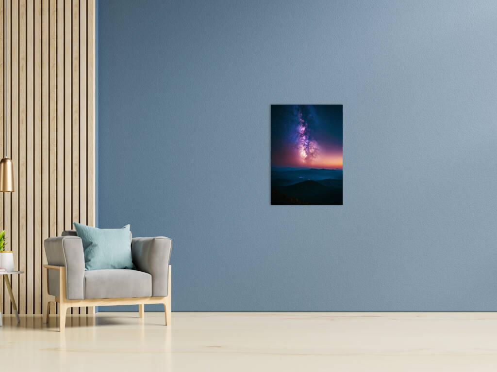 Milky Way toont een adembenemend nachtlandschap waarin de galactische kern van onze melkweg zich in al zijn pracht ontvouwt boven een serene bergenreeks. De warme paarse en roze tinten van de sterrennevels contrasteren prachtig met het koele blauw van de schemering, terwijl miljoenen sterren als diamanten fonkelen in de kosmische dans. De vredige aardse landschap vormt een perfecte tegenhanger tot de grandeur van het universum erboven. Dit inspirerende kunstwerk brengt de oneindige schoonheid van de kosmos en ons plaats daarin direct in je leefruimte.