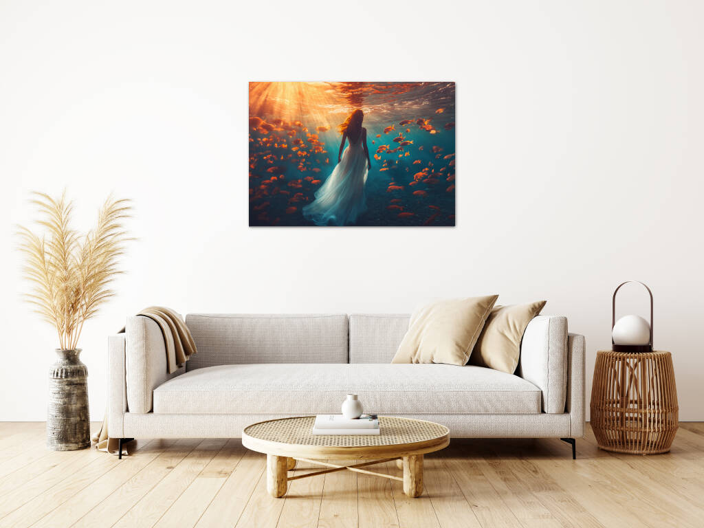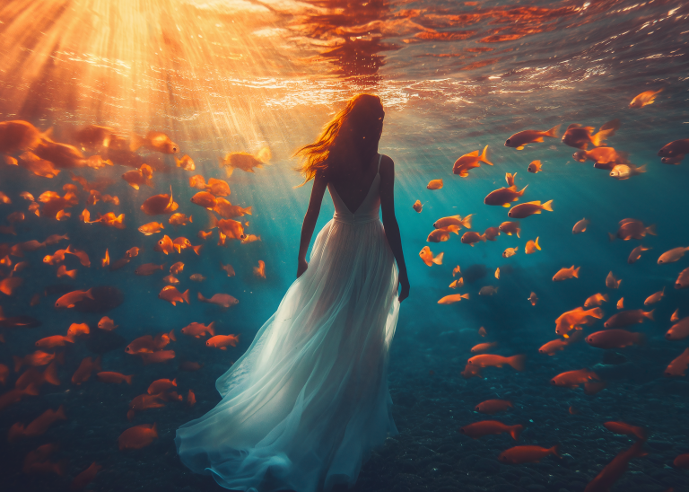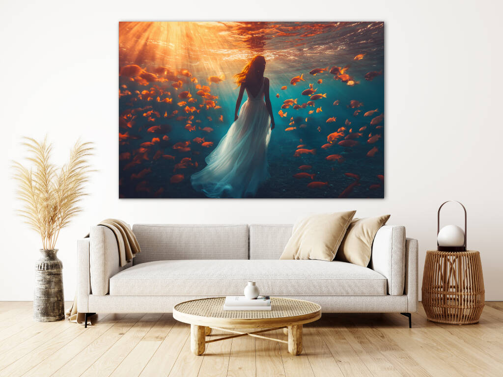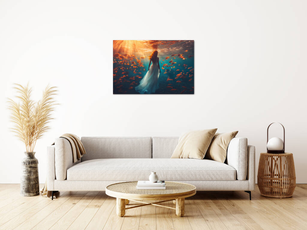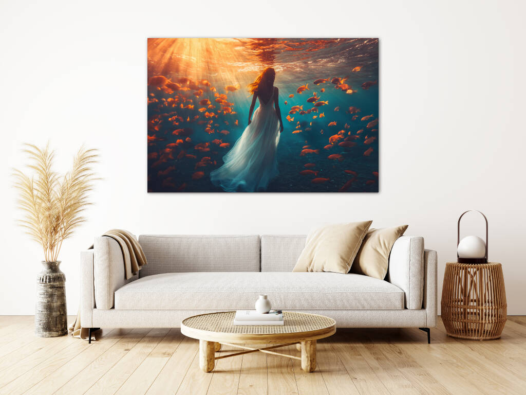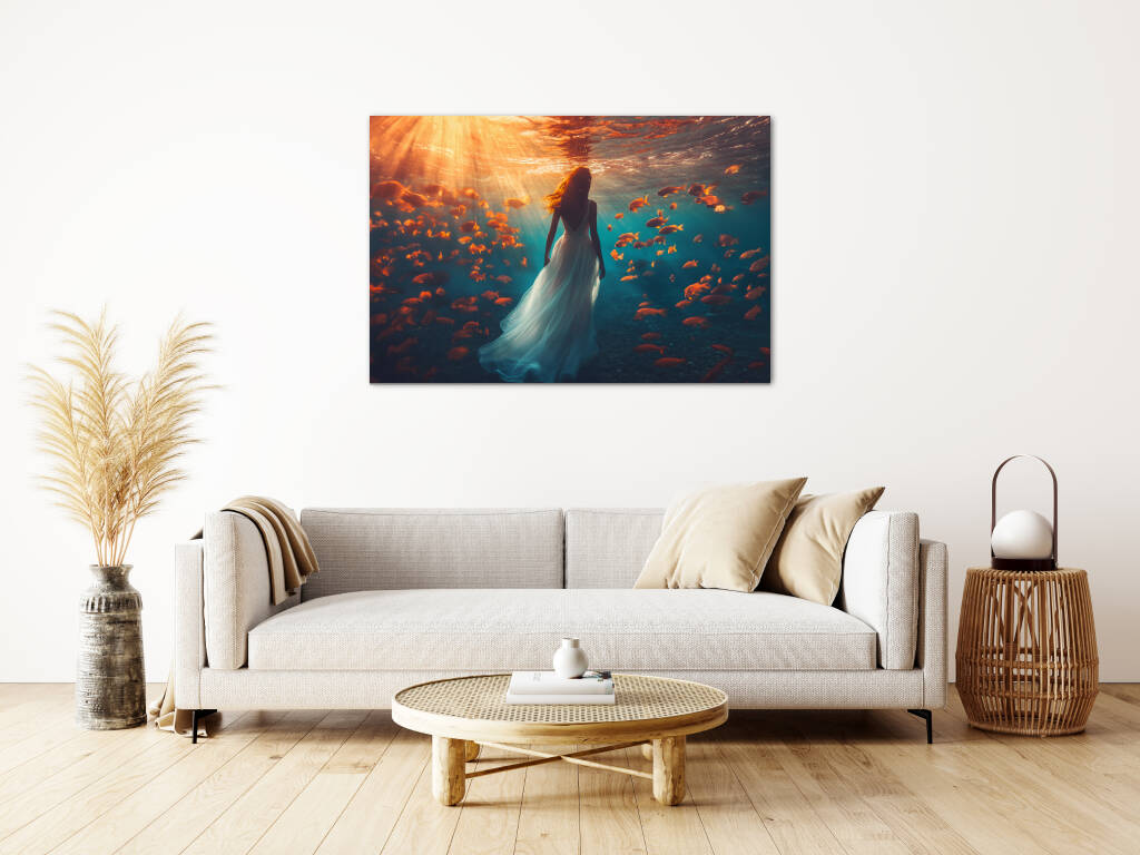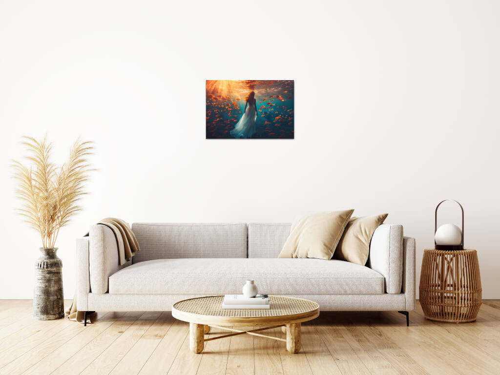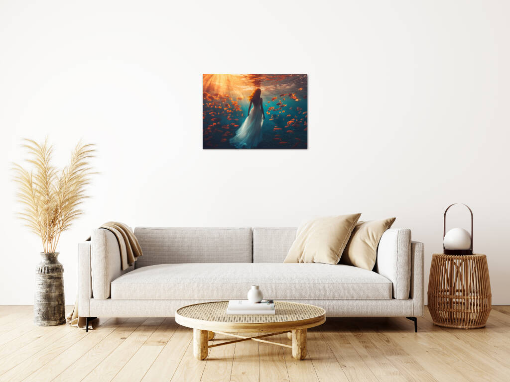 Underwater Walk toont een magische onderwaterscène waarin een elegante vrouw in een wijduitlopende jurk sereen wandelt door de diepten van de oceaan. Gouden zonnestralen doordringen het turquoise water en verlichten een school van oranje tropische vissen die graceus om haar heen zwemmen. De surrealistische scène creëert een dromerige atmosfeer waarin de grenzen tussen realiteit en fantasie vervagen. Dit betoverende kunstwerk symboliseert vrede, gratie en de harmonie tussen mens en natuur in een wereld vol wonderen.