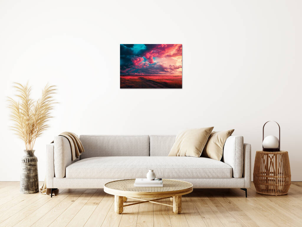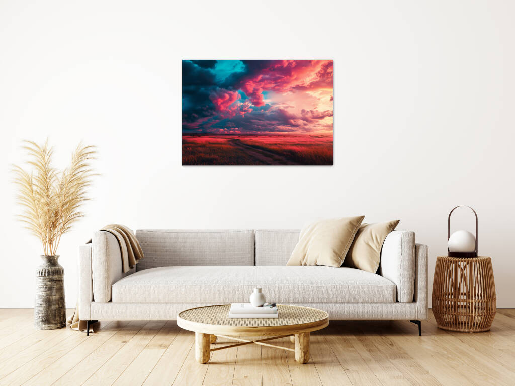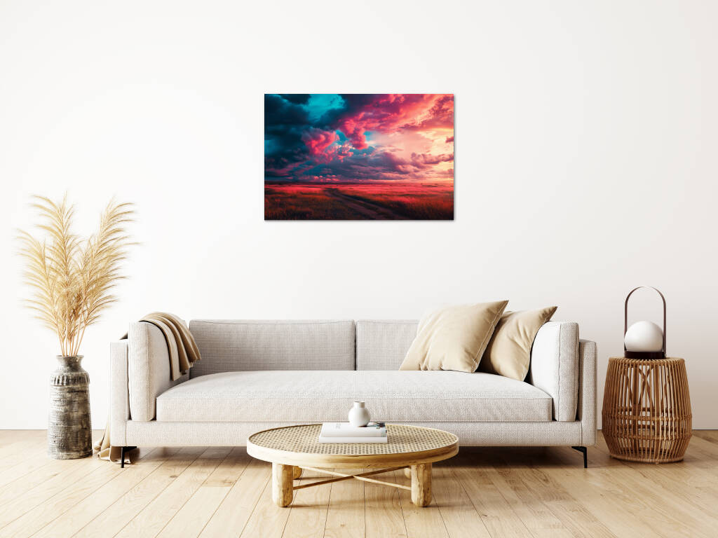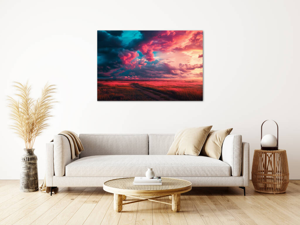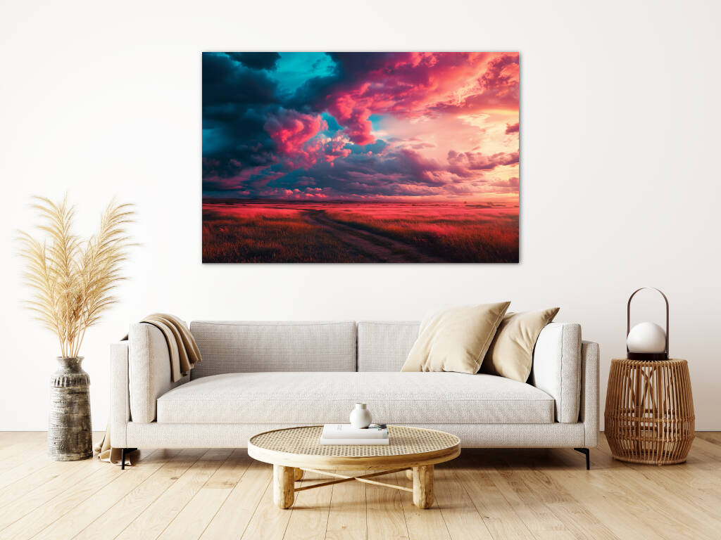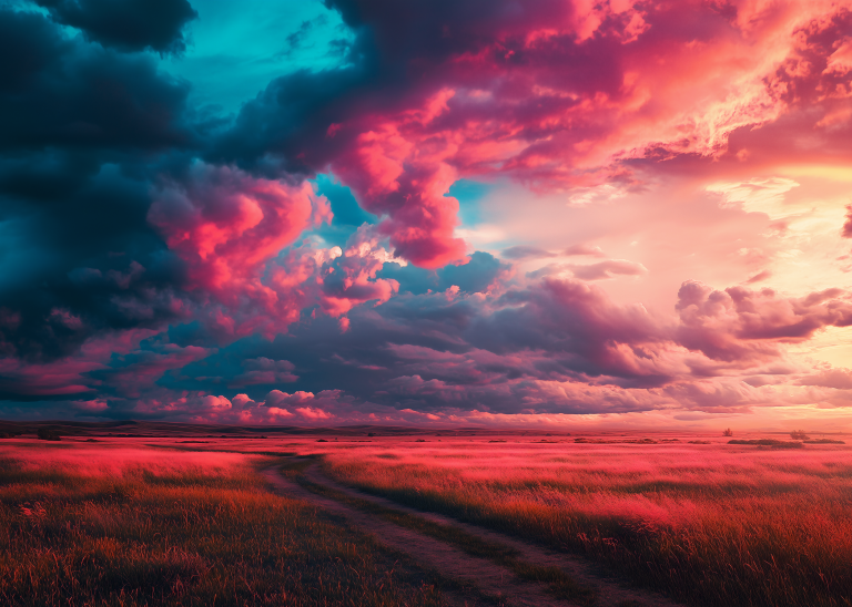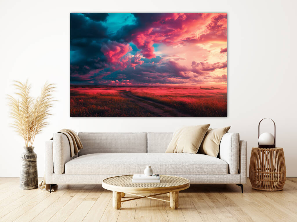 Sundown Meadow vangt een spectaculair moment waarbij dramatische wolkenformaties in vurige tinten van roze, oranje en turquoise de hemel vullen boven gouden graslanden. Het smalle pad dat door het landschap slingert nodigt uit tot contemplatie en avontuur. Dit adembenemende natuurschouwspel toont de grootsheid van de natuur in al haar theatrale glorie. Perfect voor wie verlangt naar de oneindige schoonheid van wijde landschappen en dramatische hemelluchten.