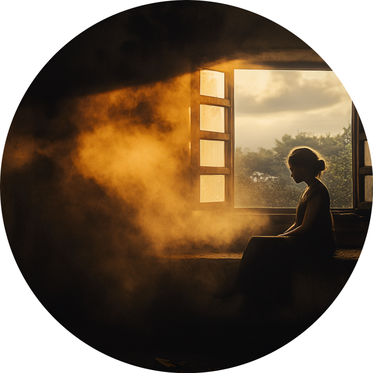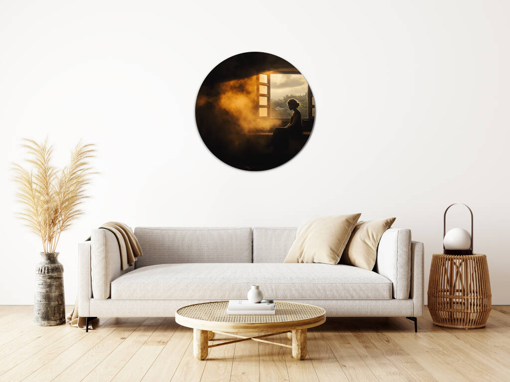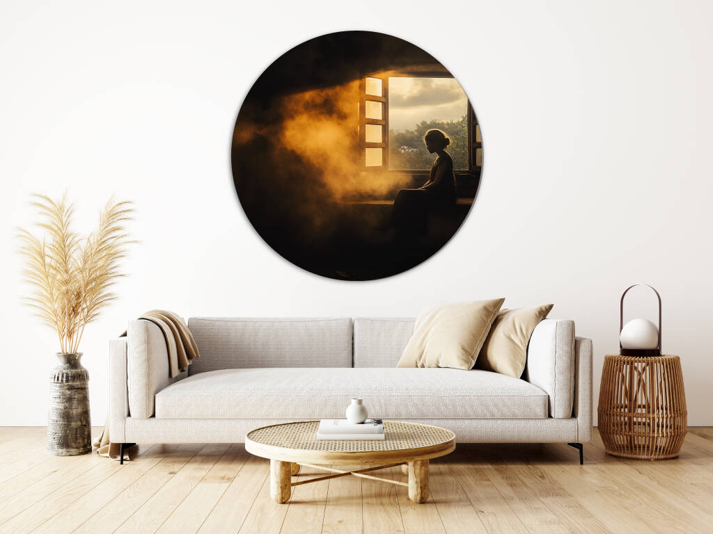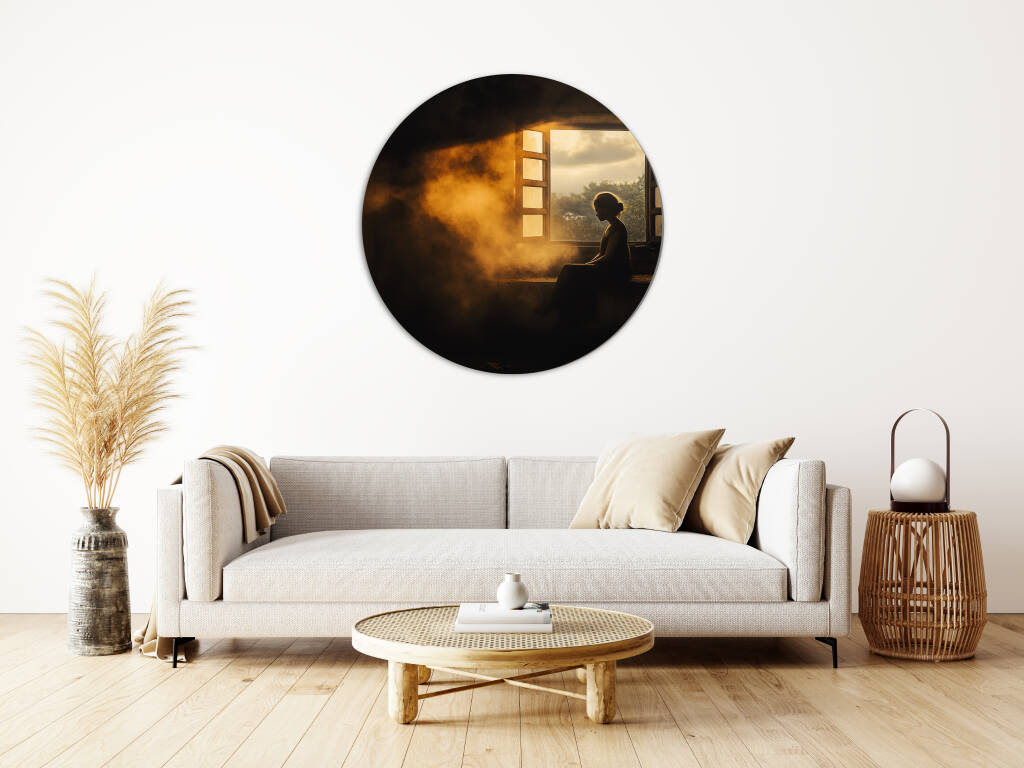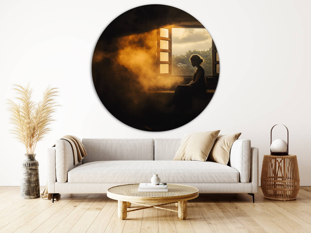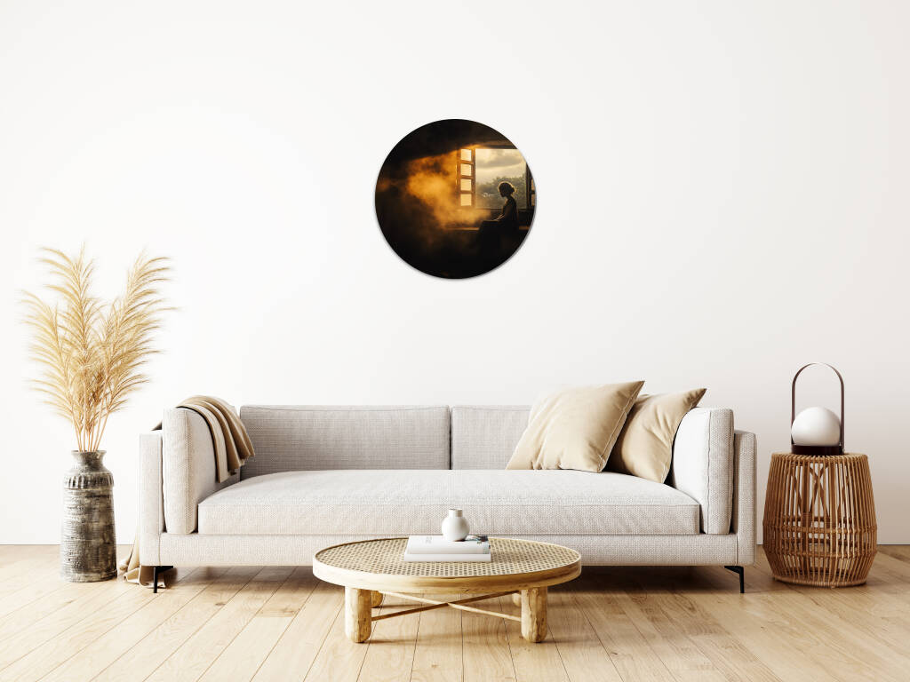 Early Rise vangt het magische moment van de vroege ochtend waarbij zonnestralen door een open raam naar binnen stromen en een vrouw in silhouet hullen. Het warme, gouden licht creëert een atmosferische nevel die de hele scène in een dromerige gloed zet, terwijl de rustige houding van de figuur een gevoel van vredelievende contemplatie uitstraalt. De contrasten tussen licht en schaduw, tussen binnen en buiten, vertellen een verhaal van nieuwe mogelijkheden. Dit intiems kunstwerk brengt de rust van de vroege morgen direct in je interieur.