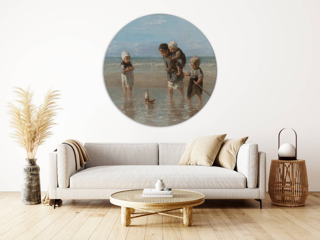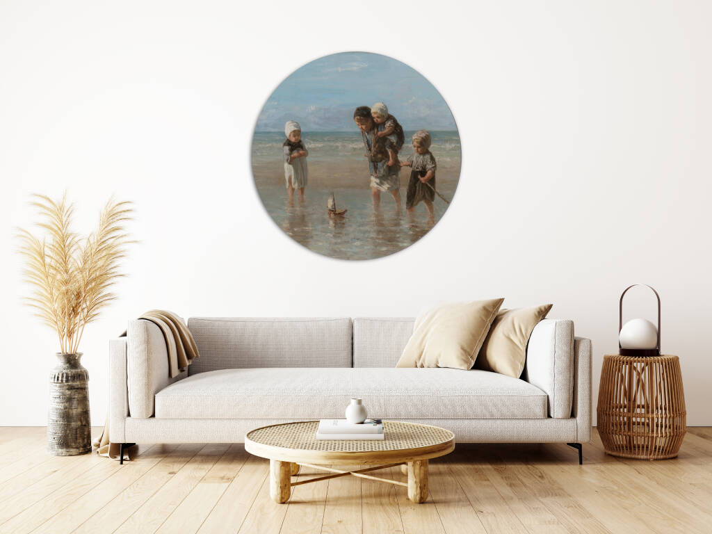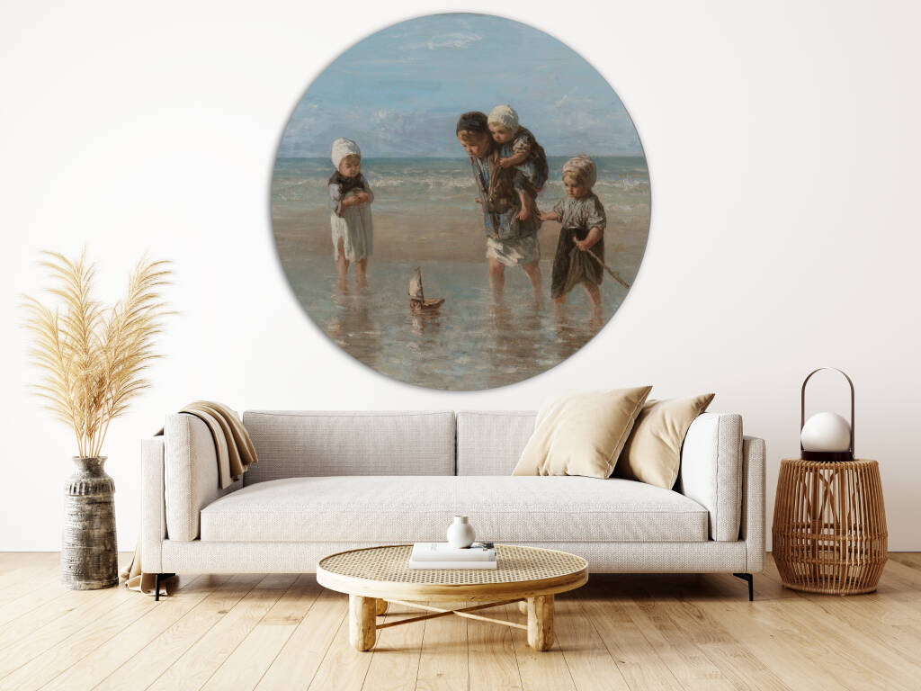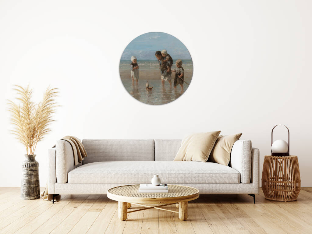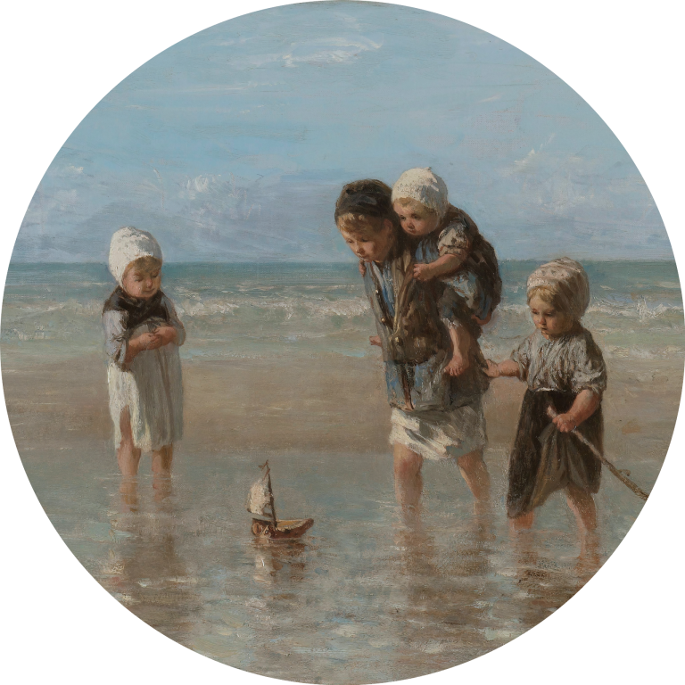 Kinderen der zee vangt een ontroerend moment van kinderlijke onschuld aan het strand. Visserskinderen in traditionele klederdracht spelen met een zelfgemaakt bootje in de branding, terwijl de zee haar eeuwige lied zingt. Het gedempte kleurenpalet van zachtblauwe en grijze tinten weerspiegelt de sfeer van een bewolkte dag aan de Nederlandse kust. Dit werk documenteert niet alleen het harde leven van vissersgezinnen, maar toont ook de veerkracht en vreugde die kinderen vinden in de eenvoudigste dingen. De kunstenaar heeft met grote gevoeligheid de tederheid vastgelegd waarmee de kinderen voor elkaar zorgen. Een tijdloos portret van jeugd aan zee dat universele themas van spel, zorg en gemeenschap verkent.