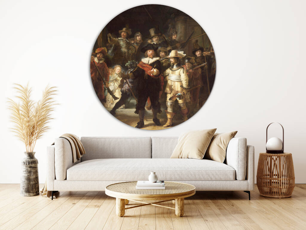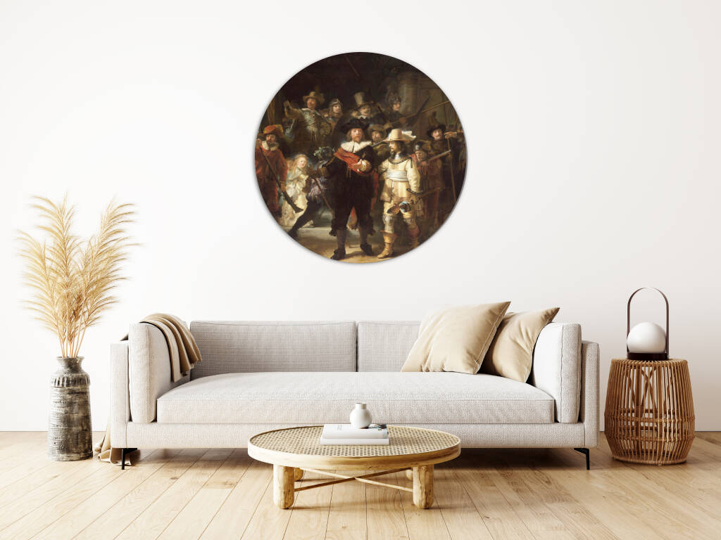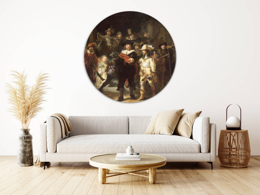 Deze indrukwekkende reproductie van De Nachtwacht brengt een van Rembrandt van Rijns meest iconische meesterwerken tot leven. Het schilderij, officieel getiteld Officieren en andere schutters van wijk II in Amsterdam onder leiding van kapitein Frans Banninck Cocq en luitenant Willem van Ruytenburch, toont een groep schutters in een dynamische compositie vol beweging, licht en schaduw. De meesterlijke techniek van Rembrandt komt tot uiting in de dramatische belichting en de levendige expressies van de afgebeelde figuren. Een tijdloos kunstwerk dat de grootsheid van de Gouden Eeuw perfect weerspiegelt.
