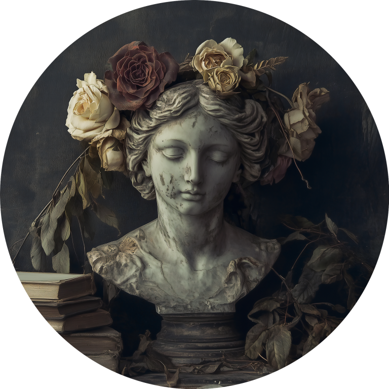Sleeping Bust is een poëtische meditatie over schoonheid, vergankelijkheid en de tijdloosheid van kunst. Het klassieke sculptuur, gekroond met verwelkende rozen, rust sereen tussen stapels antieke boeken en verdroogd gebladerte. De gesloten ogen van het beeld suggereren een eeuwige droom, terwijl de omringende elementen het verstrijken van de tijd symboliseren. Het ingetogen kleurenpalet van warme sepiatinten versterkt de nostalgische sfeer en roept herinneringen op aan verloren beschavingen en vergeten verhalen. De compositie balanceert tussen leven en stilstand, waarbij de stenen figuur omringd wordt door de vergankelijke schoonheid van de natuur. Dit werk nodigt uit tot contemplatie over de relatie tussen kunst, kennis en het menselijk verlangen naar onsterfelijkheid door creatie.