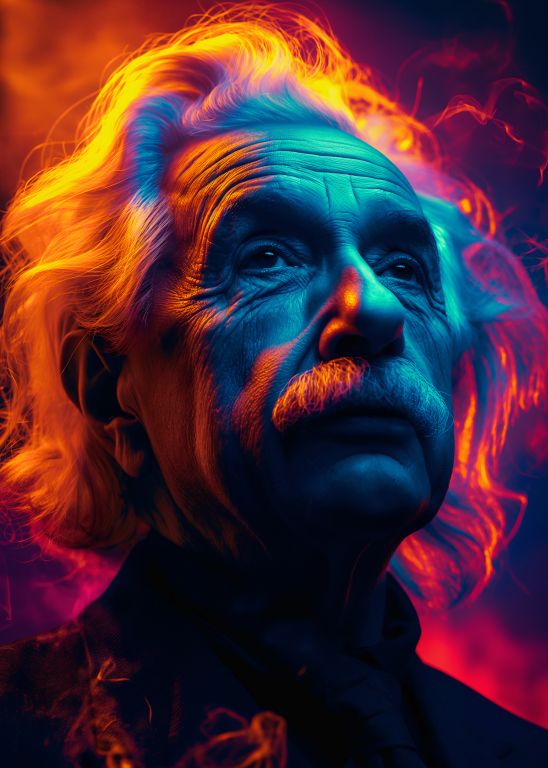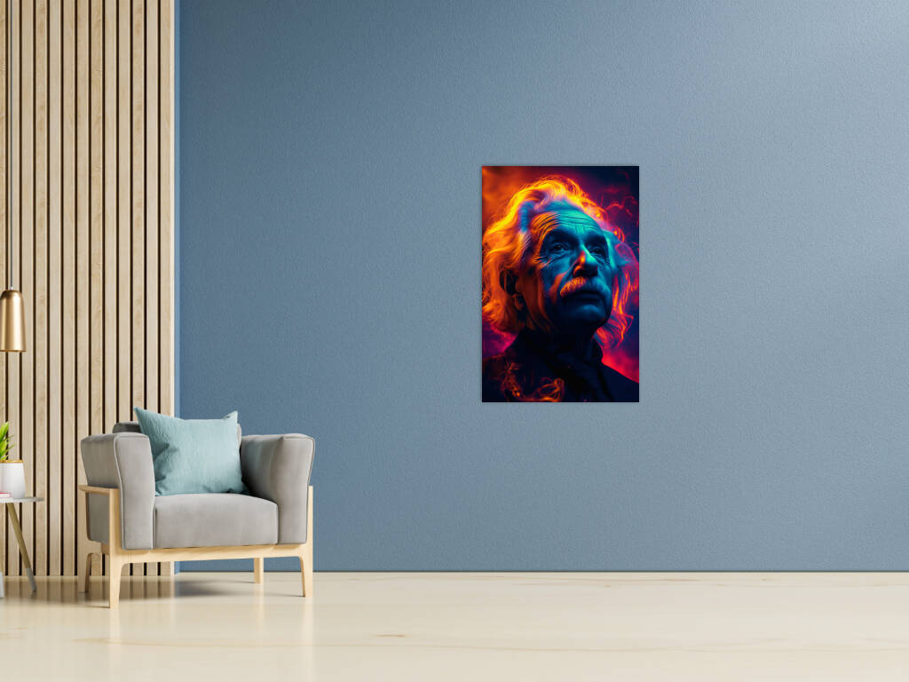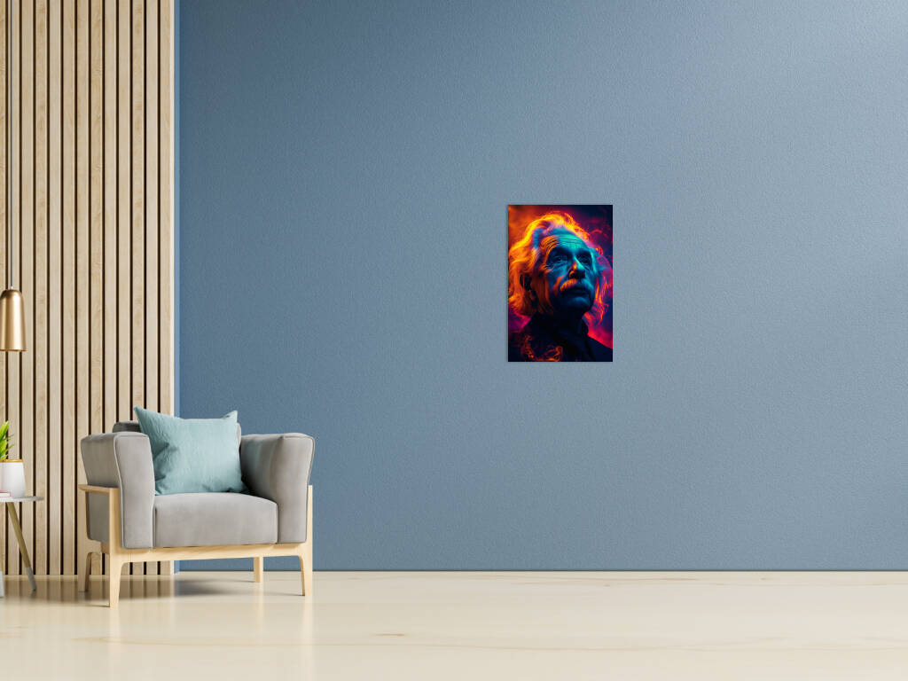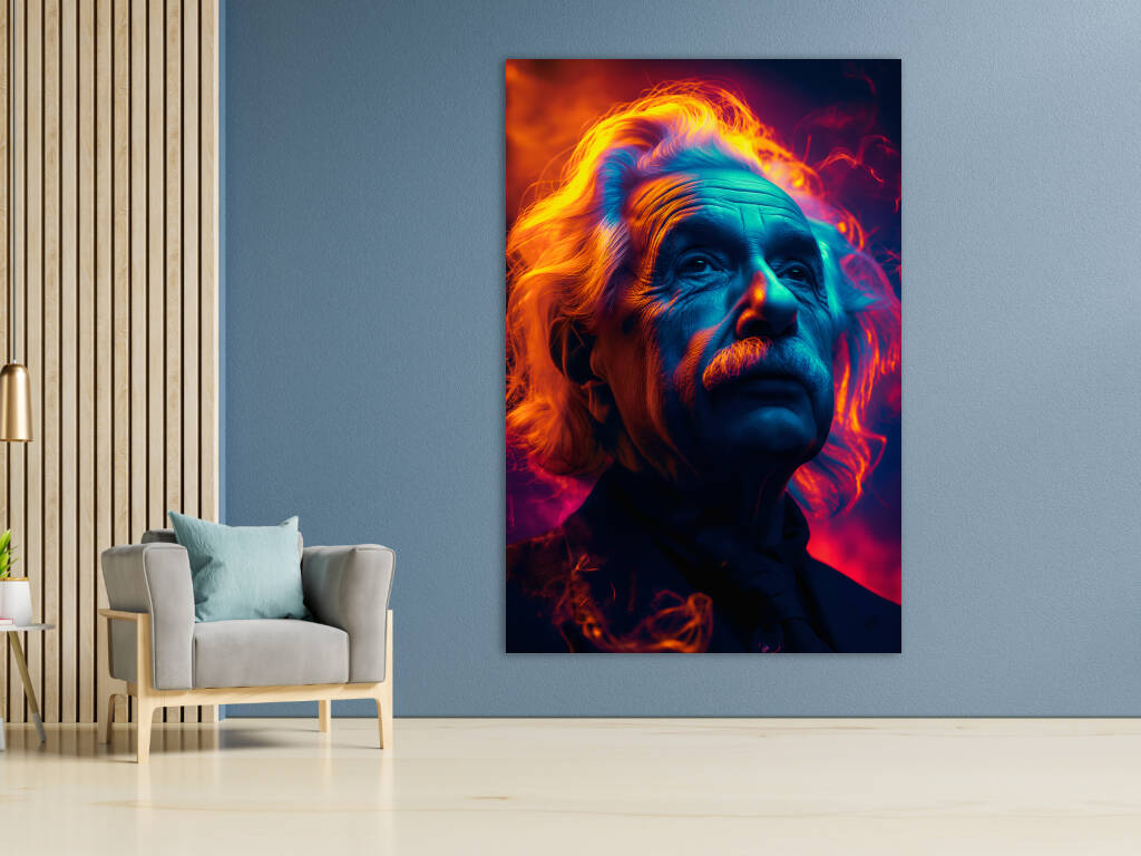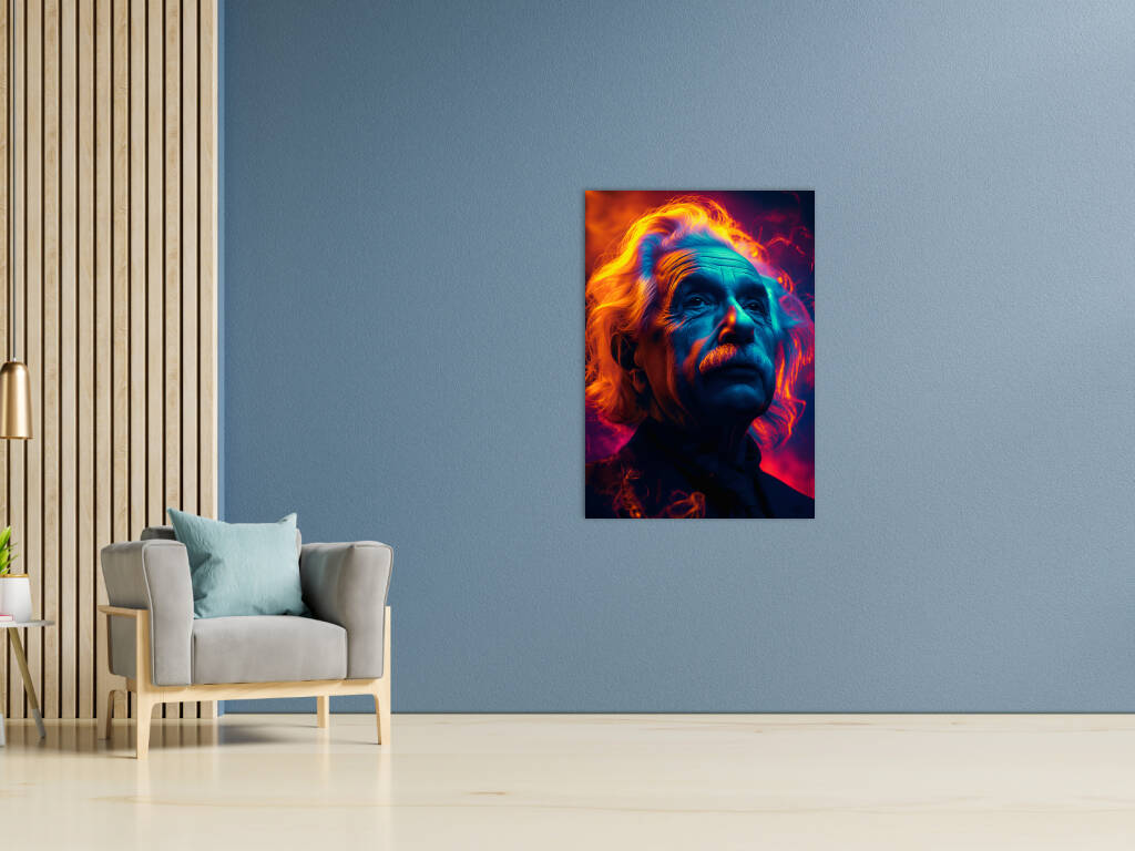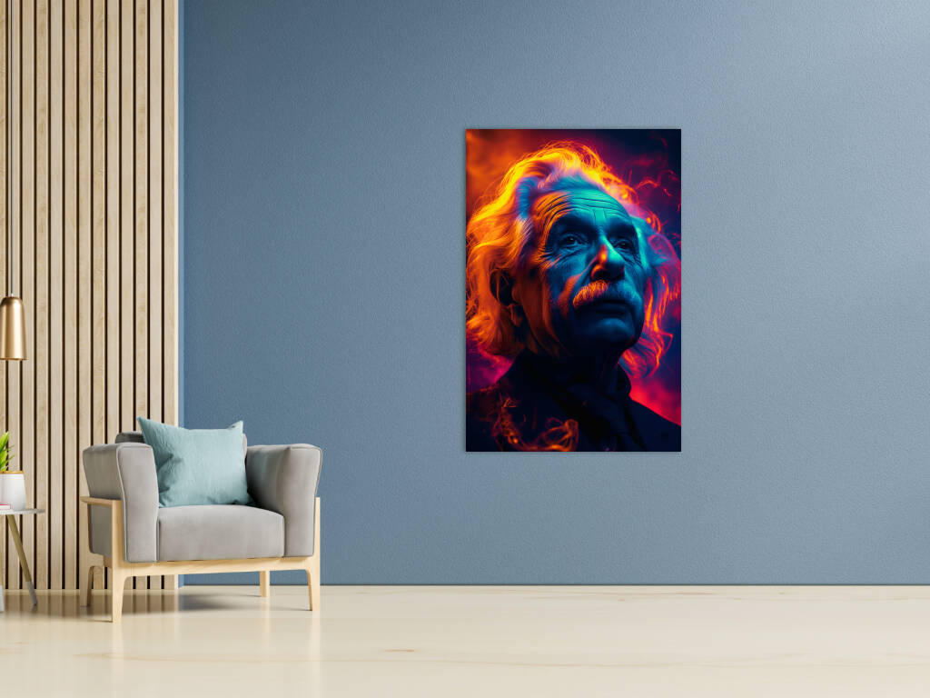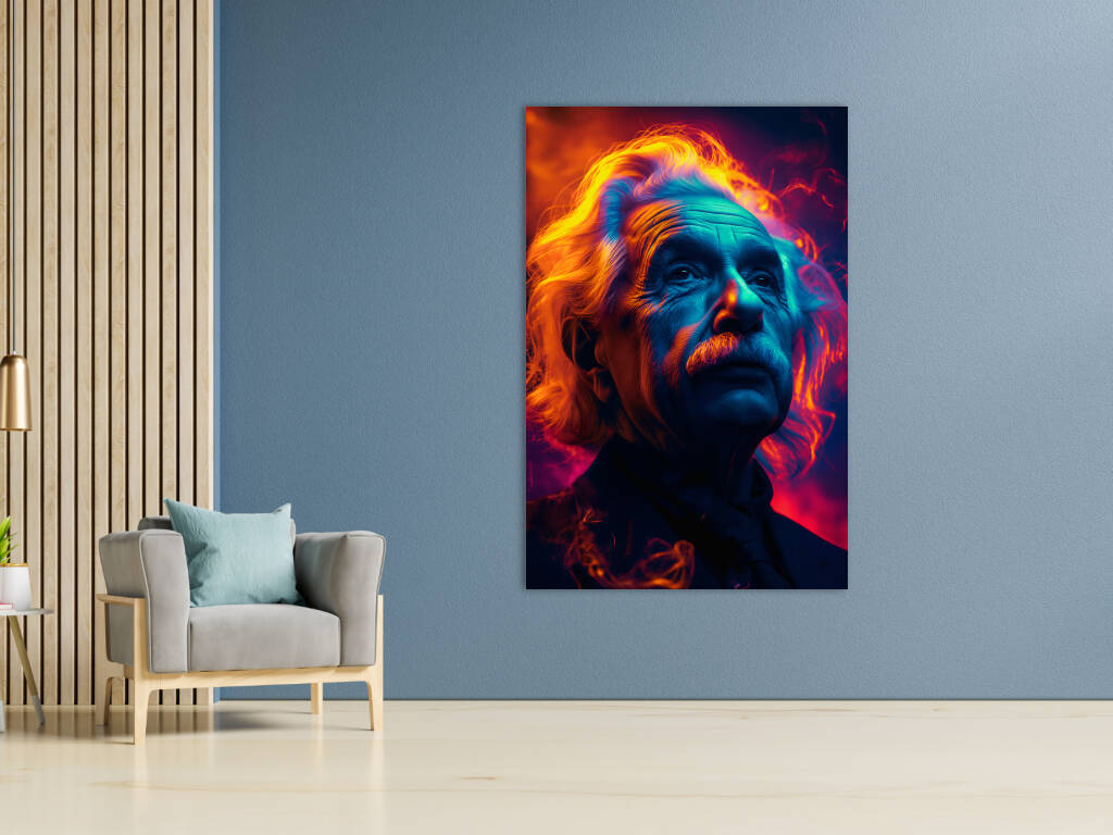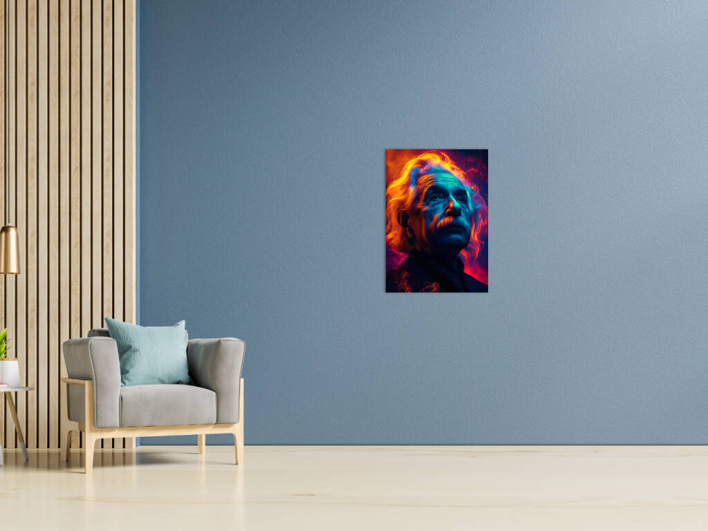 Albert Lightstein is een expressief en modern kunstwerk waarin het iconische beeld van Albert Einstein wordt getransformeerd met een futuristisch kleurenpalet van neonblauw, vurige oranje- en roodgele tinten. De dramatische verlichting en de gloed rondom zijn haar geven hem een bijna mythische uitstraling, alsof hij omringd is door energie en genialiteit. Dit portret combineert realisme met abstracte en cyberpunk-achtige invloeden, waardoor het een krachtig en intrigerend statement maakt over intellect en creativiteit.