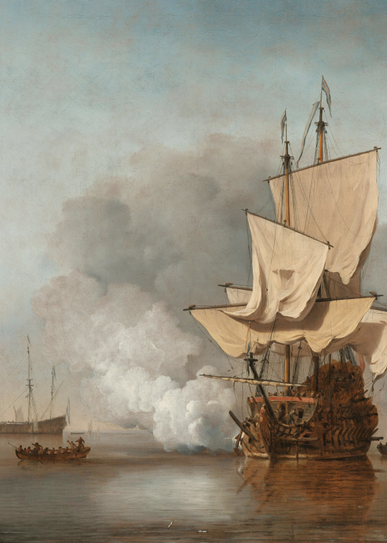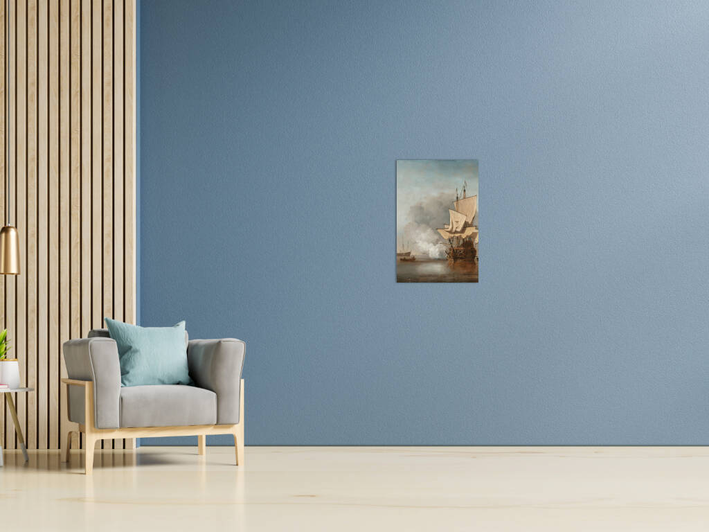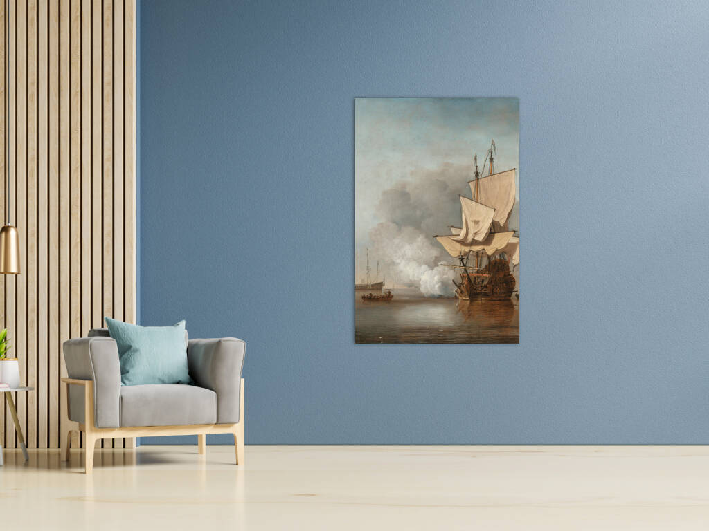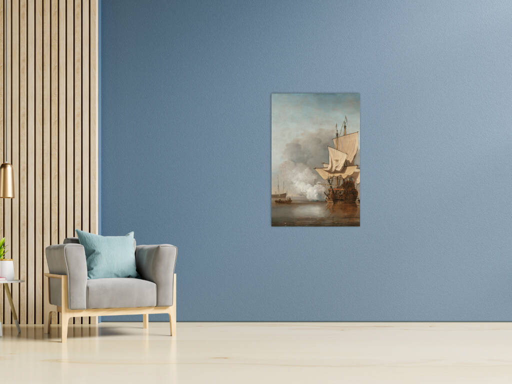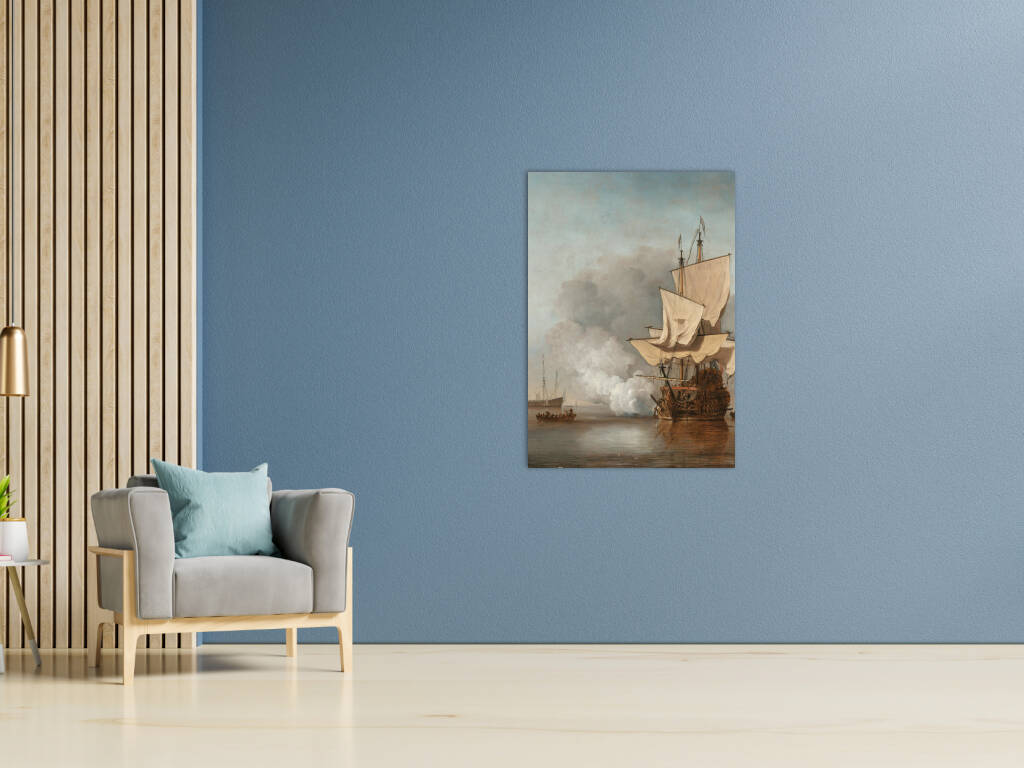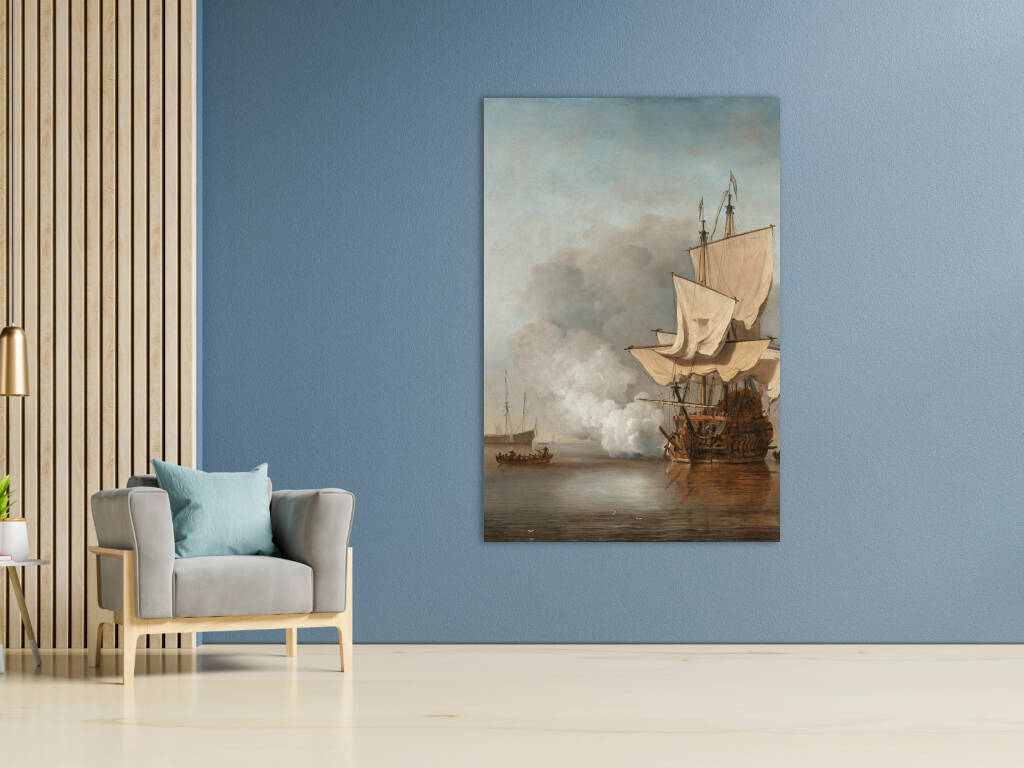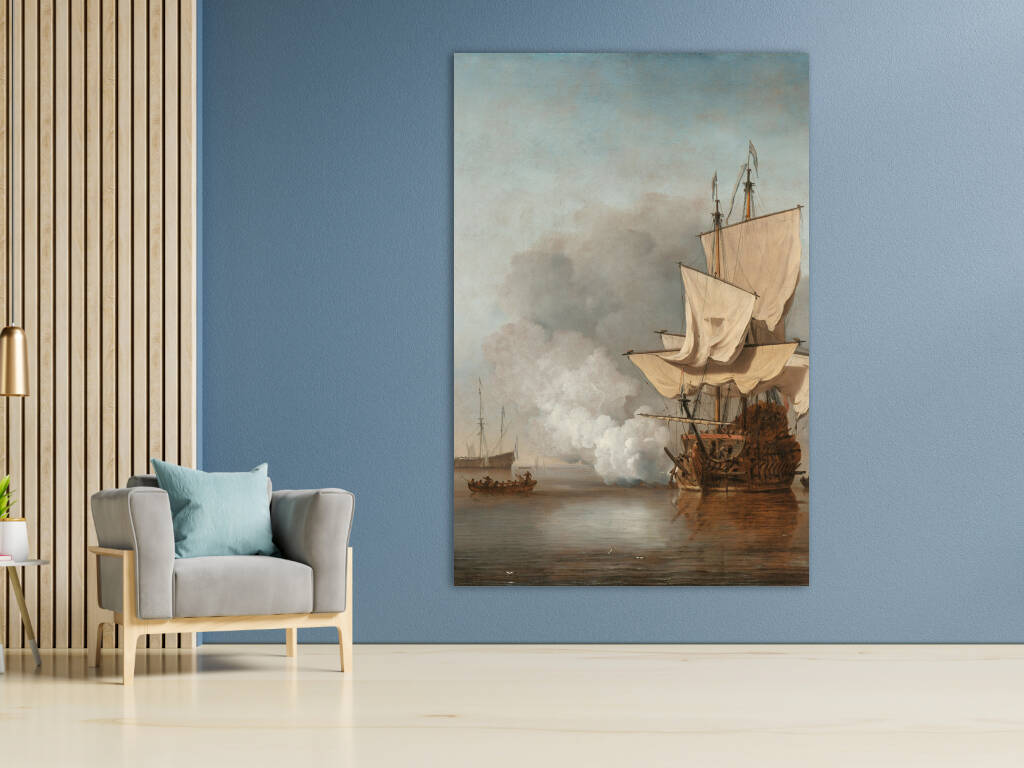 Het Kanonschot vangt een dramatisch moment uit de Nederlandse maritieme geschiedenis waarbij zeilschepen hun kracht tonen op de woelige zee. De imposante oorlogsschepen met hun bollende zeilen domineren de compositie, terwijl rookwolken en de bewolkte hemel de spanning van de scène versterken. De meesterlijke weergave van water, wind en de majesteitelijke schepen toont de technische perfectie van de Gouden Eeuw schilderkunst. Dit historische kunstwerk brengt de grandeur van de Nederlandse zeemacht en de dramatiek van de zeeslag direct in je leefruimte.