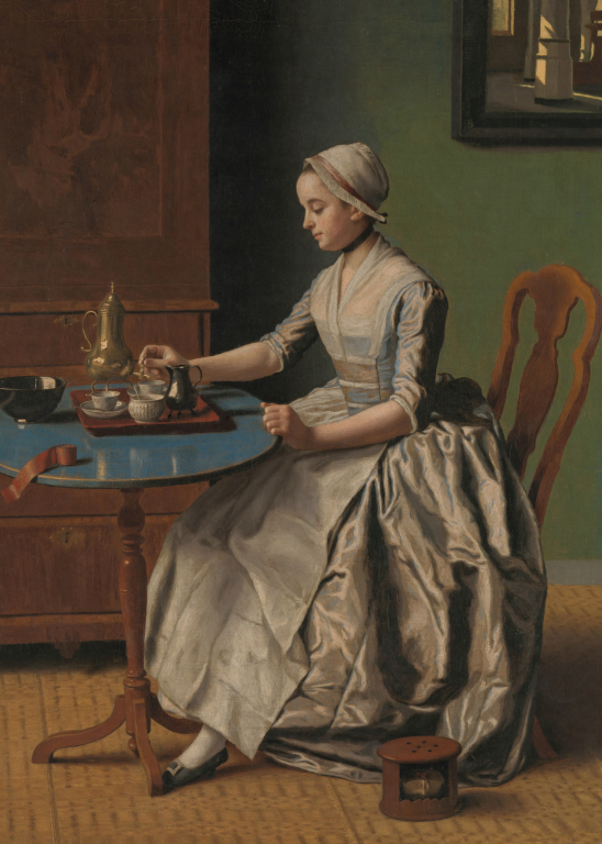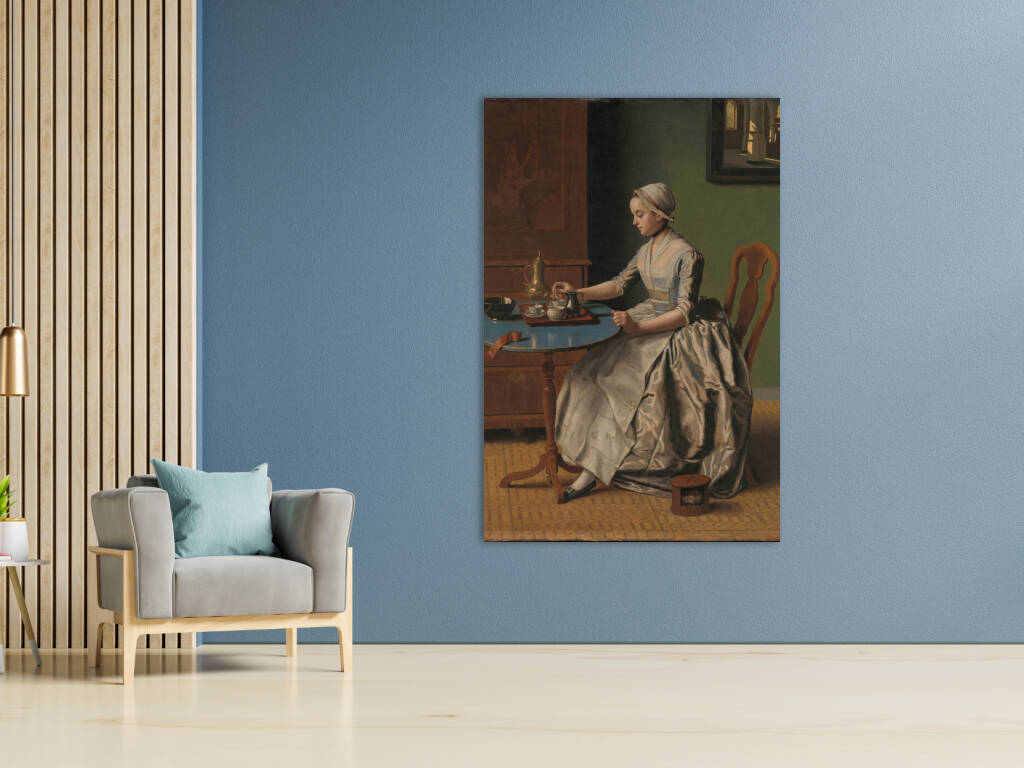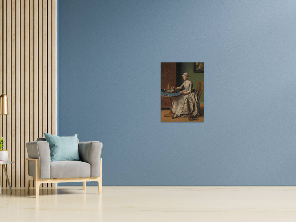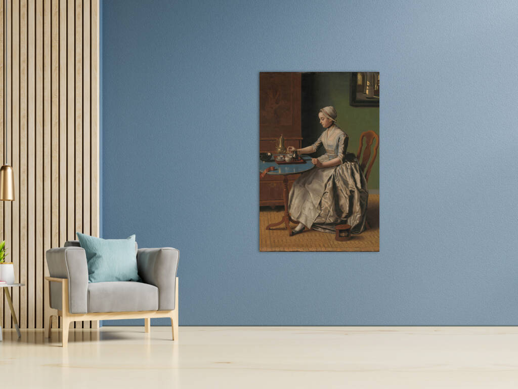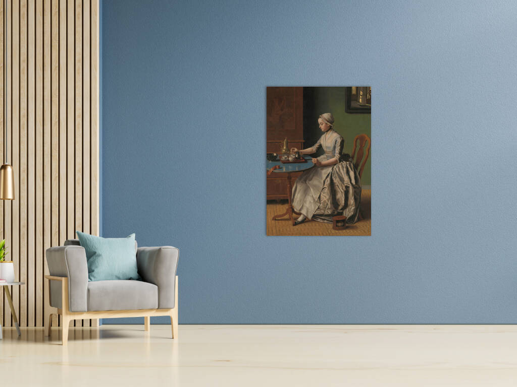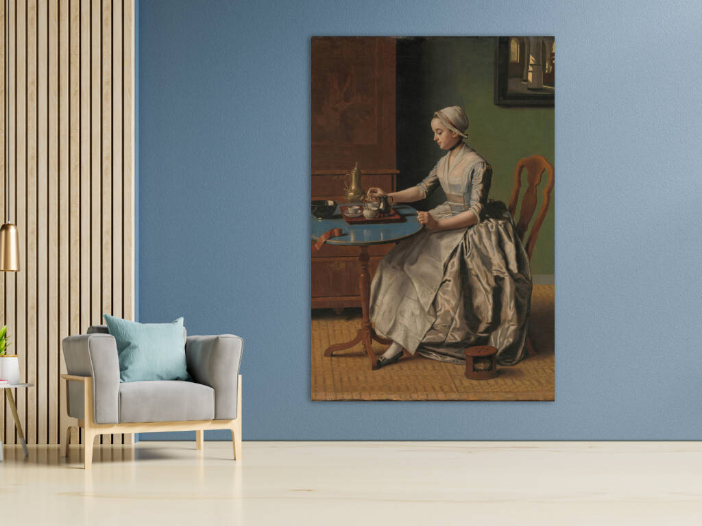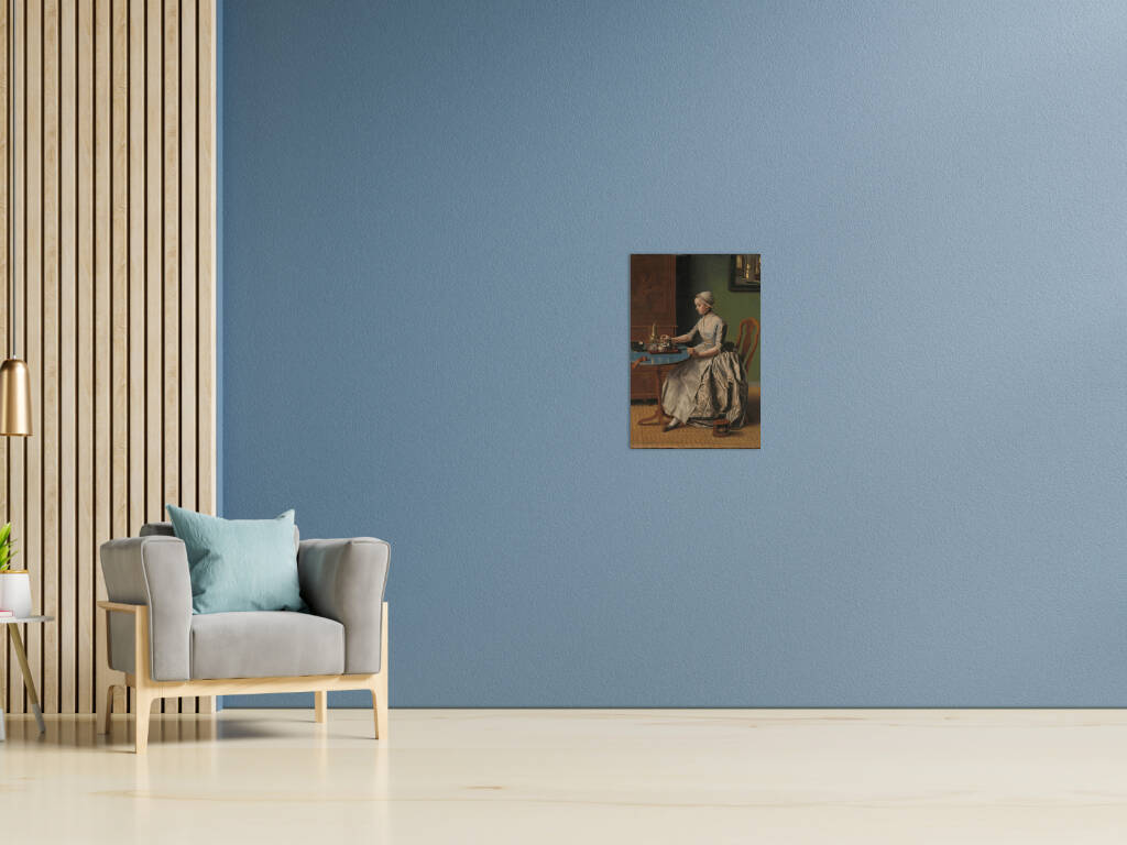 Hollands Meisje aan het Ontbijt toont een intieme scène uit de Nederlandse Gouden Eeuw waarin een jonge vrouw met toewijding haar ochtendthee serveert. De serene atmosfeer van het vertrek, de zachte natuurlijke belichting en de minutieuze weergave van porselein en textiel getuigen van de meesterlijke techniek van de klassieke Nederlandse schilderkunst. De vrouw in haar eenvoudige maar elegante kleding belichaamt de huiselijke deugden en de rustieke schoonheid van het dagelijks leven. Dit tijdloze kunstwerk brengt de warmte en intimiteit van de Nederlandse traditie in je interieur.