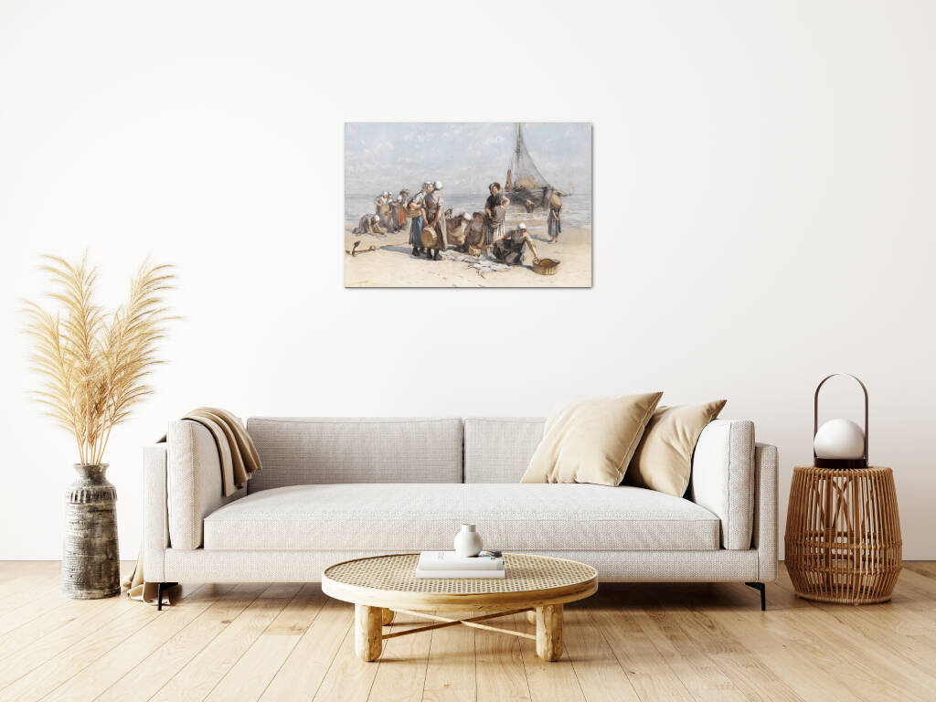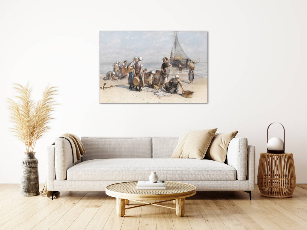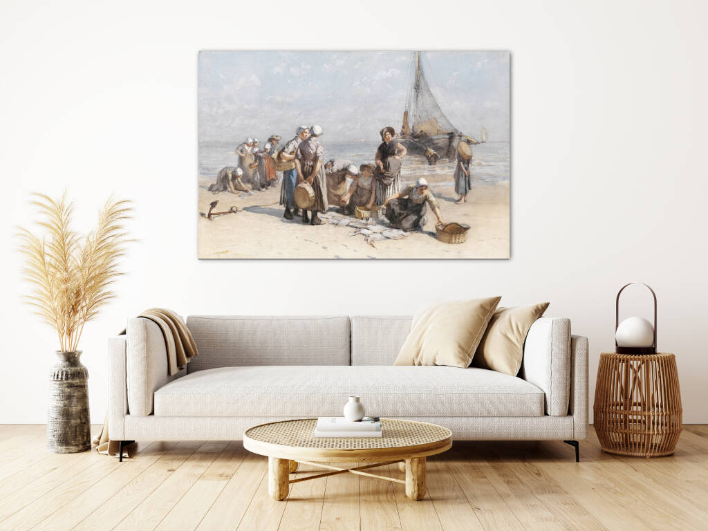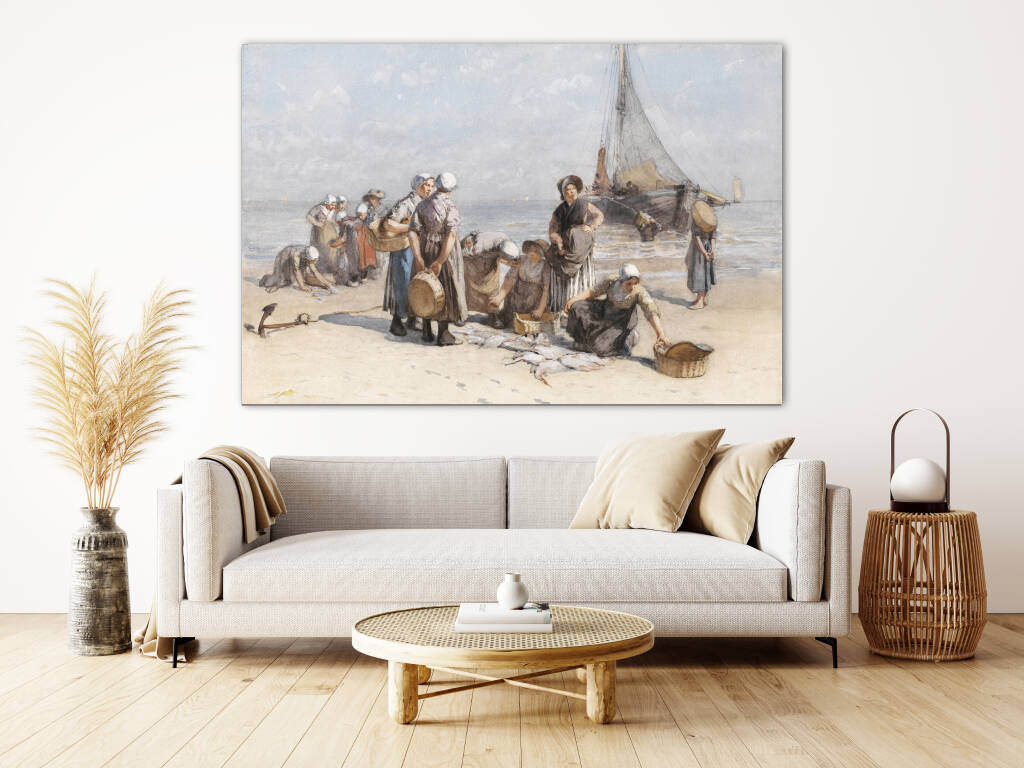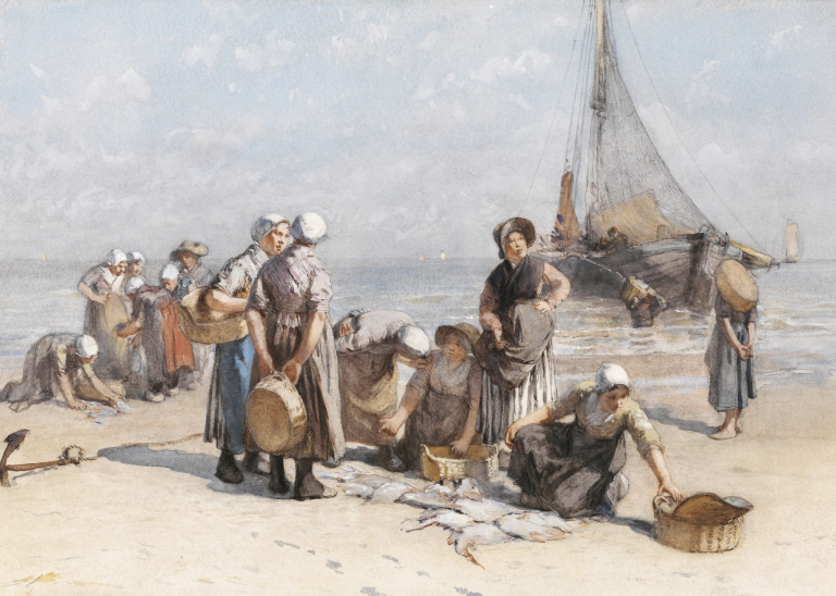 Vissersvrouwen op het Scheveningse Strand geeft een ontroerend beeld van het dagelijks leven in een 19e-eeuws vissersdorp. De vrouwen, gekleed in traditionele klederdracht, wachten op het strand terwijl de vissersboot nadert. Hun gebogen houding en samengedromde vormen spreken van de zorgen en het harde bestaan van de vissersgemeenschap. Het gedempte kleurenpalet van grijzen en bruinen weerspiegelt het ruwe karakter van het kustleven, terwijl de bewolkte hemel de onzekerheid van hun bestaan symboliseert. Dit werk documenteert niet alleen een verdwenen manier van leven, maar toont ook de kracht en veerkracht van deze vrouwen die de ruggengraat vormden van de vissersgemeenschappen. Een sociaal document dat de menselijke waardigheid viert te midden van de dagelijkse strijd om het bestaan.