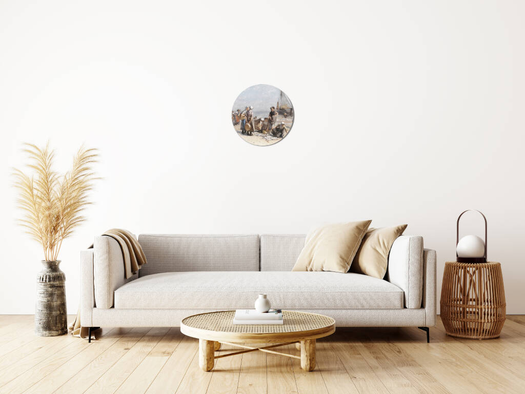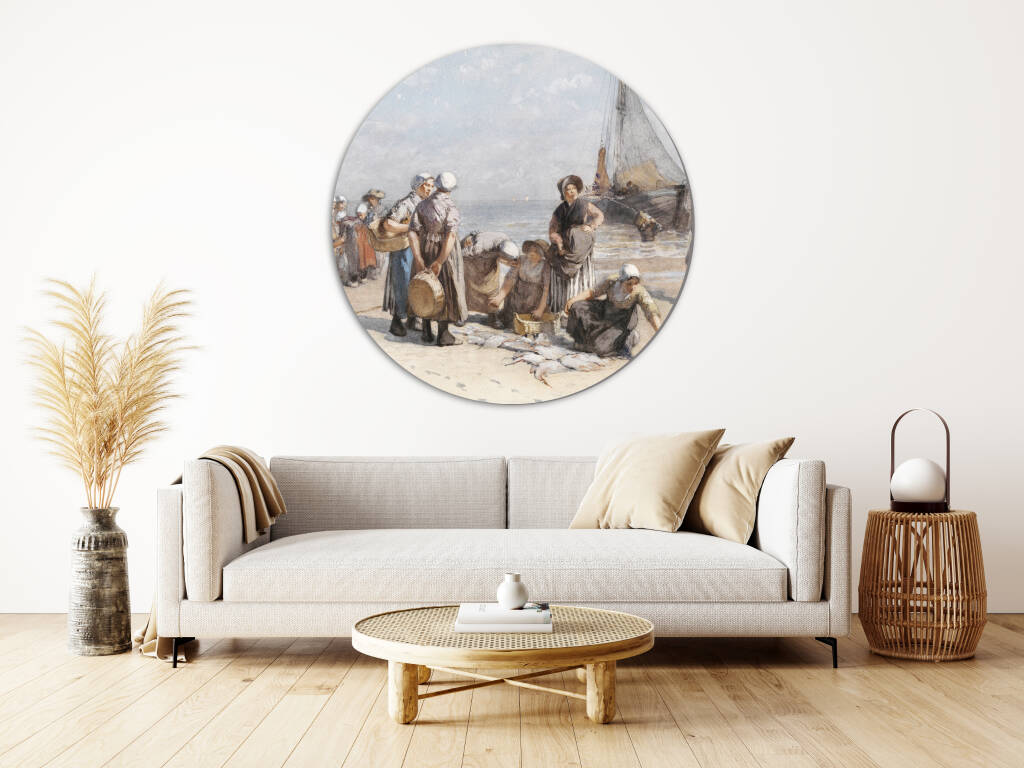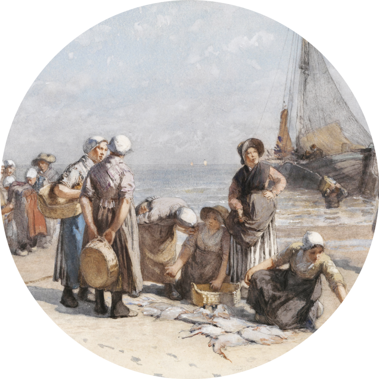Vissersvrouwen op het Scheveningse Strand geeft een ontroerend beeld van het dagelijks leven in een 19e-eeuws vissersdorp. De vrouwen, gekleed in traditionele klederdracht, wachten op het strand terwijl de vissersboot nadert. Hun gebogen houding en samengedromde vormen spreken van de zorgen en het harde bestaan van de vissersgemeenschap. Het gedempte kleurenpalet van grijzen en bruinen weerspiegelt het ruwe karakter van het kustleven, terwijl de bewolkte hemel de onzekerheid van hun bestaan symboliseert. Dit werk documenteert niet alleen een verdwenen manier van leven, maar toont ook de kracht en veerkracht van deze vrouwen die de ruggengraat vormden van de vissersgemeenschappen. Een sociaal document dat de menselijke waardigheid viert te midden van de dagelijkse strijd om het bestaan.