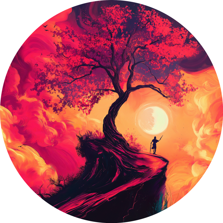 The Elder Tree toont een magische wereld waar een eeuwenoude boom troont op een klif terwijl een eenzame figuur de adembenemende zonsondergang aanschouwt. De levendige vuurrode en oranje tinten van de hemel contrasteren prachtig met de donkere silhouetten, waardoor een atmosfeer van mystiek en avontuur ontstaat. Dit epische landschap straalt de grootsheid van de natuur en de kracht van de verbeelding uit. Perfect voor liefhebbers van fantasy-kunst en dramatische landschappen die elke ruimte een gevoel van verwondering geven.
