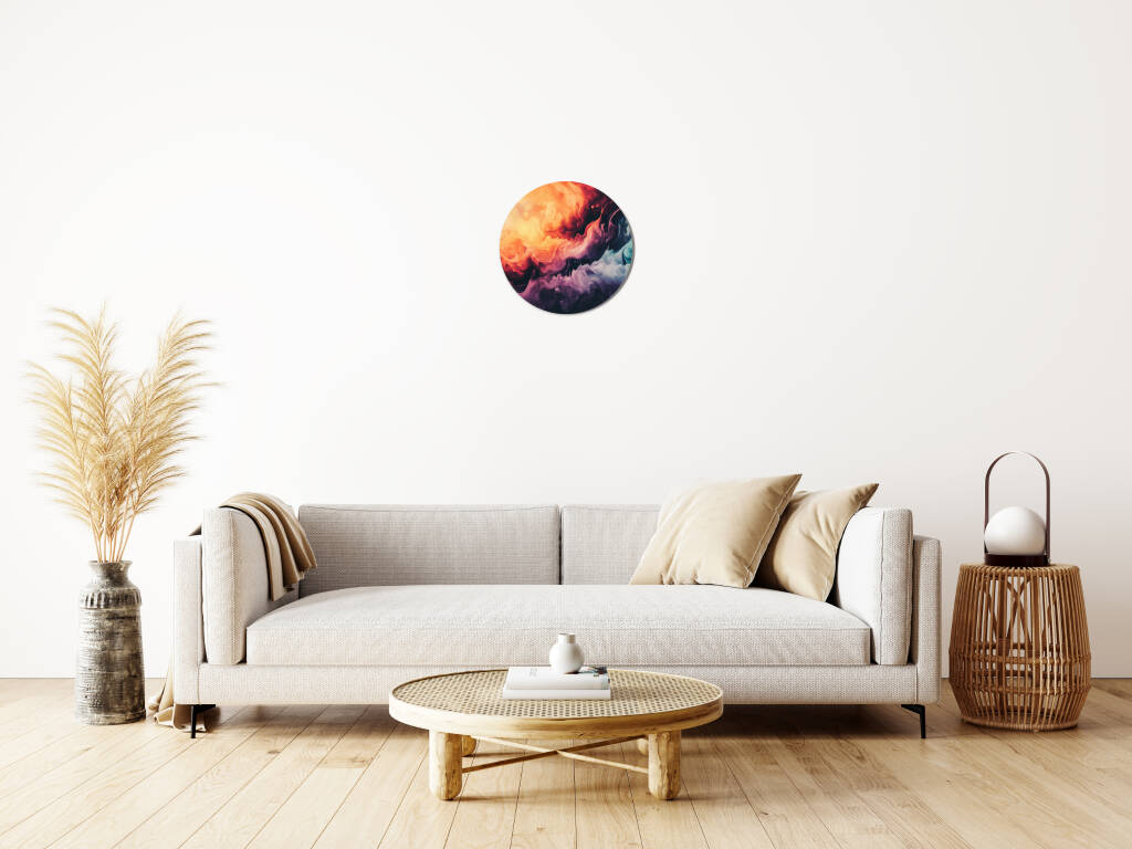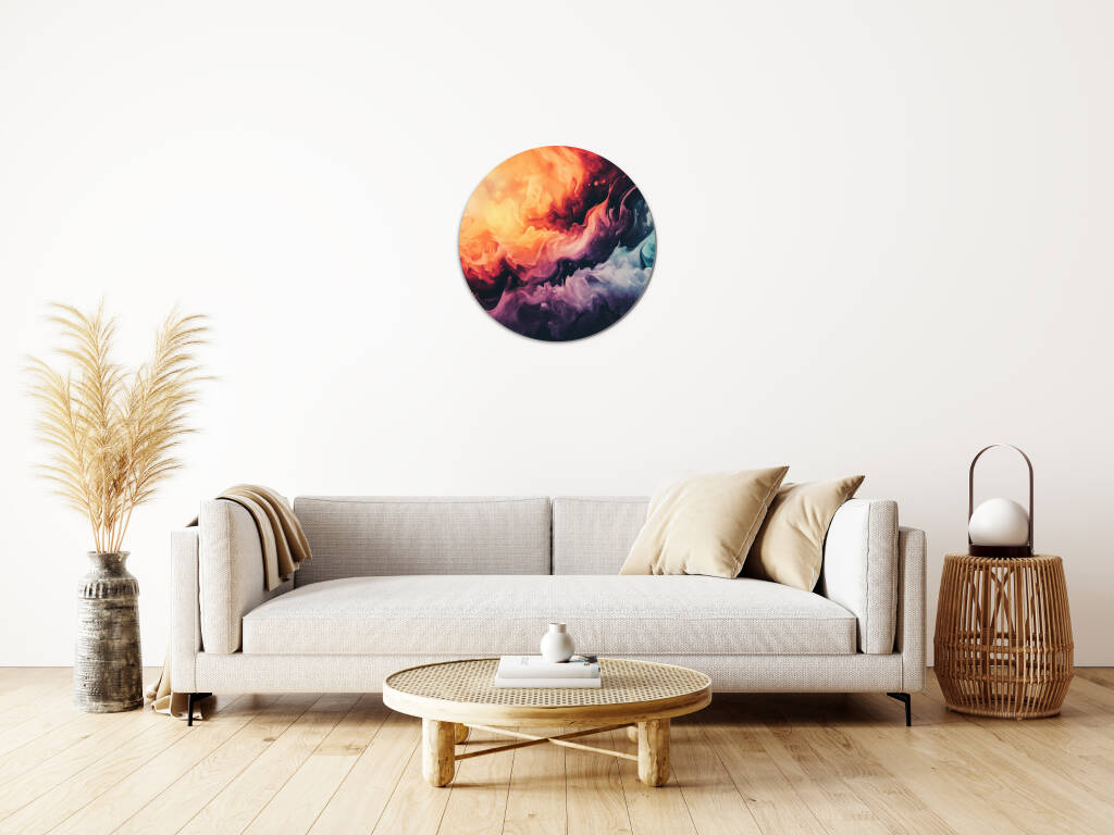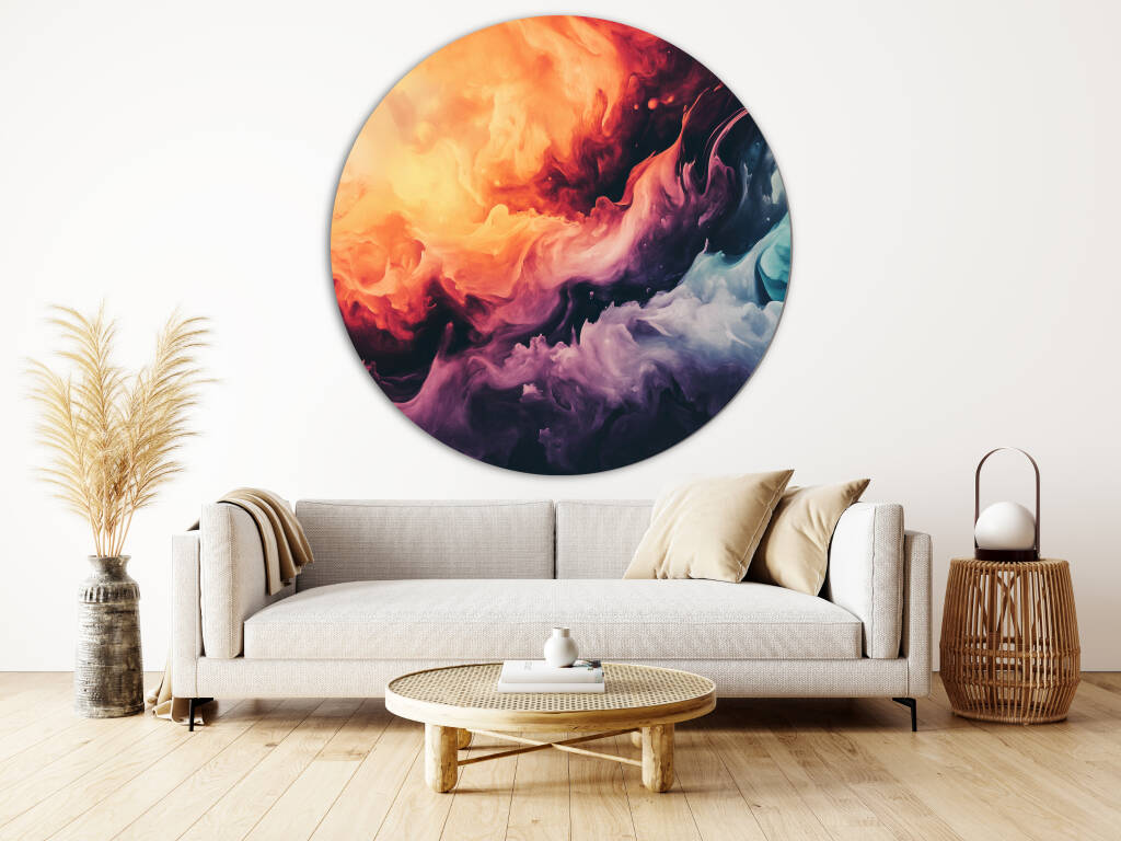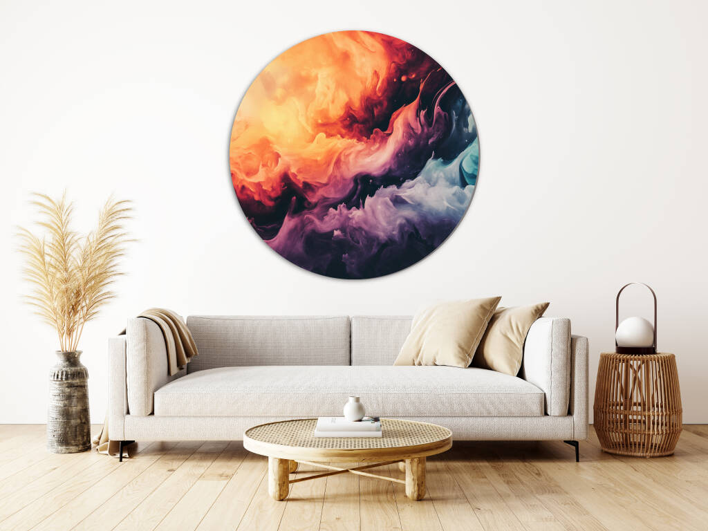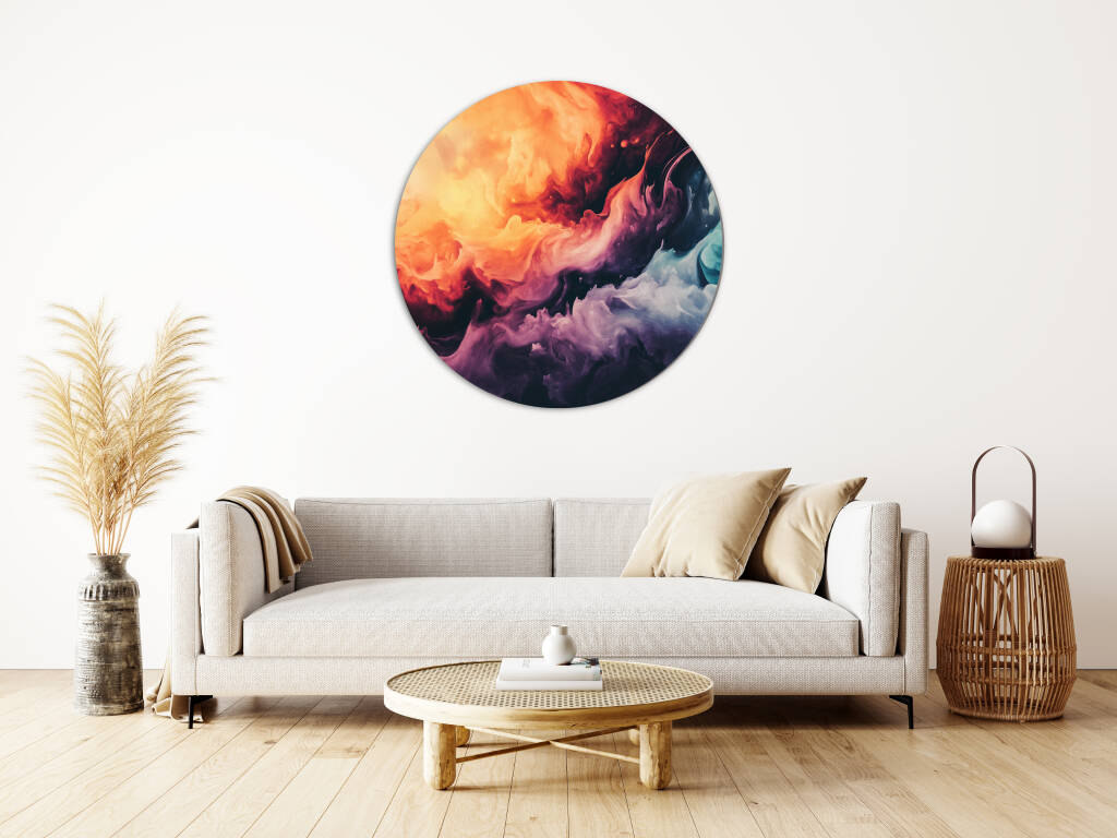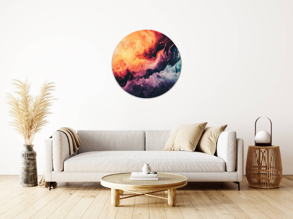 Colourful Smoke toont een explosie van levendige kleuren die als rook door de ruimte dansen en een dynamische, abstracte compositie vormen. Warme oranje en rode tinten botsen samen met koele blauwe en paarse nuances, waarbij elke werveling en draai een uniek patroon creëert. De vloeiende bewegingen en de natuurlijke gradiënten geven het kunstwerk een gevoel van energie en vrijheid. Dit expressieve design brengt leven en beweging in elke ruimte en stimuleert de verbeelding.