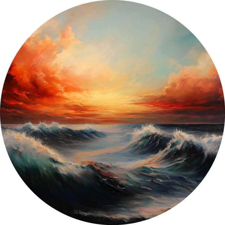 Eye of the Storm vangt het dramatische moment waarin woeste oceaangolven botsen onder een spectaculaire hemel vol oranje en gouden wolken. De krachtige beweging van het water en de intense kleuren van de storm creëren een meeslepende ervaring die zowel de kracht als de schoonheid van de natuur toont. De dynamische compositie en de rijke texturen geven het kunstwerk een gevoel van rauwe energie en natuurlijke pracht. Dit indrukwekkende zeegezicht brengt de majesteit van de oceaan en haar ontembare kracht direct in je leefruimte.