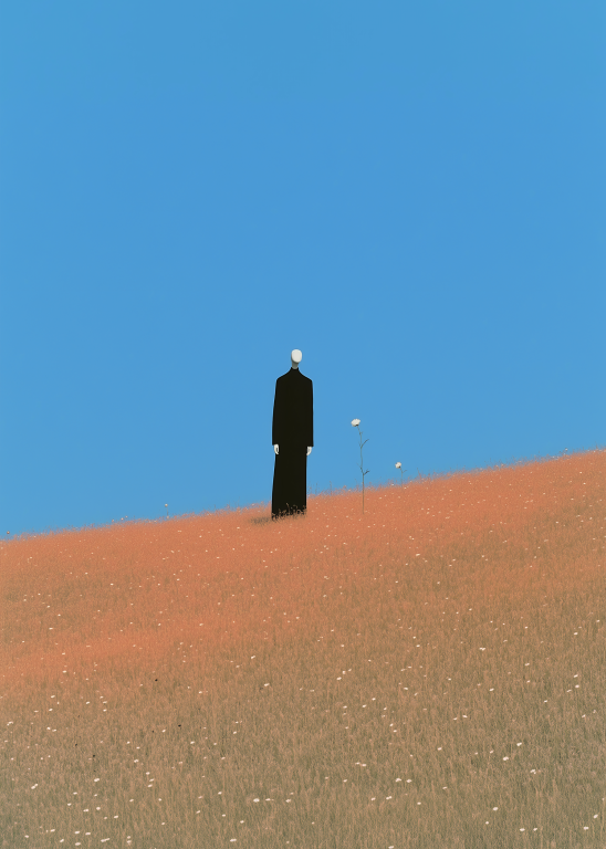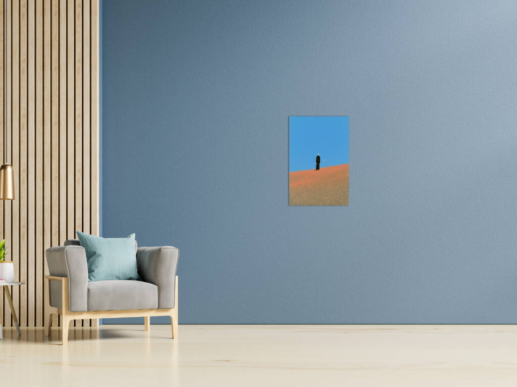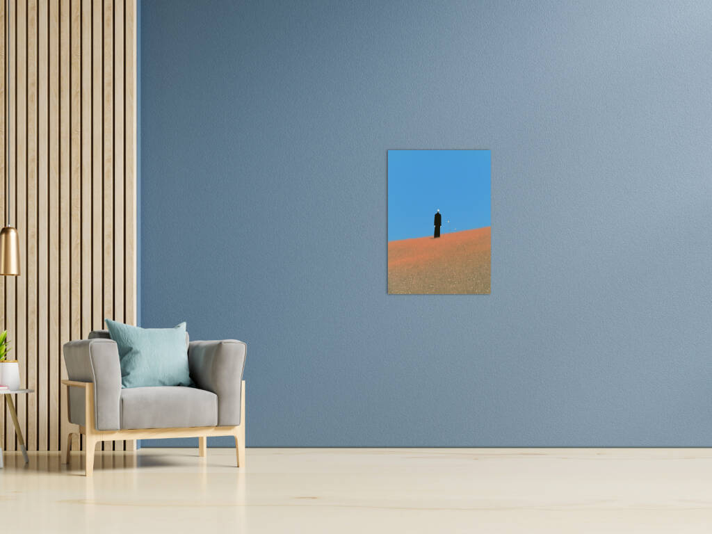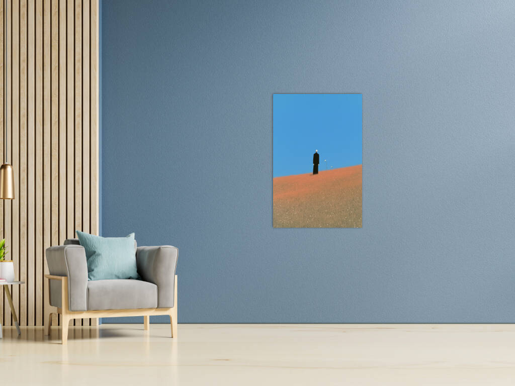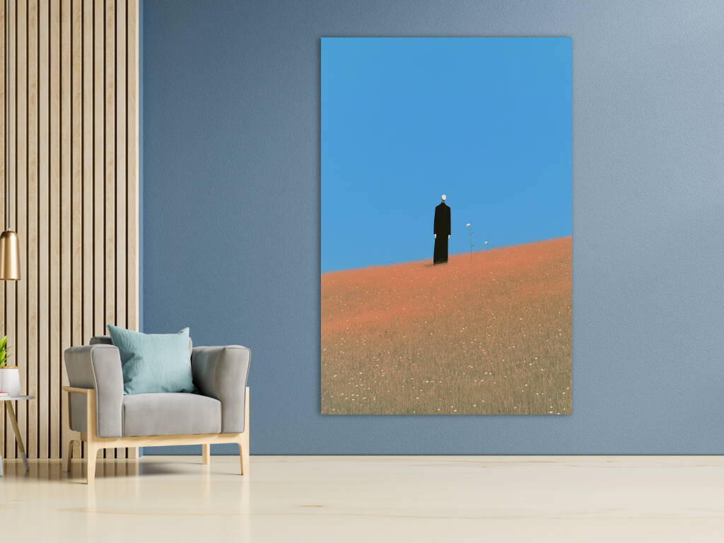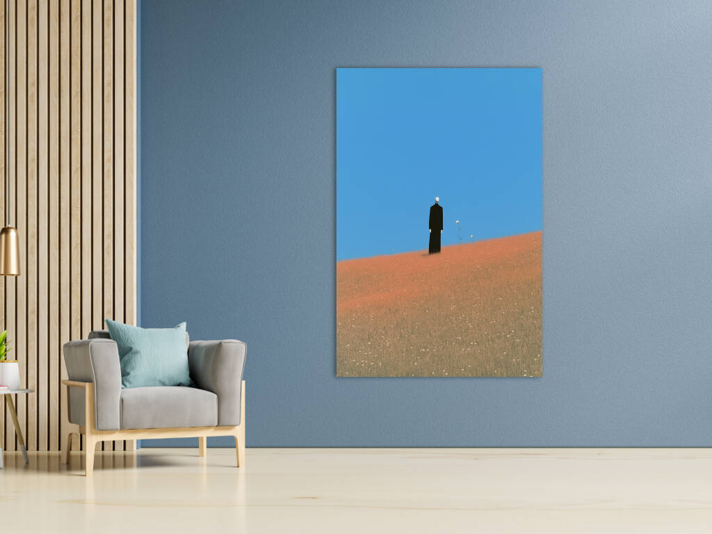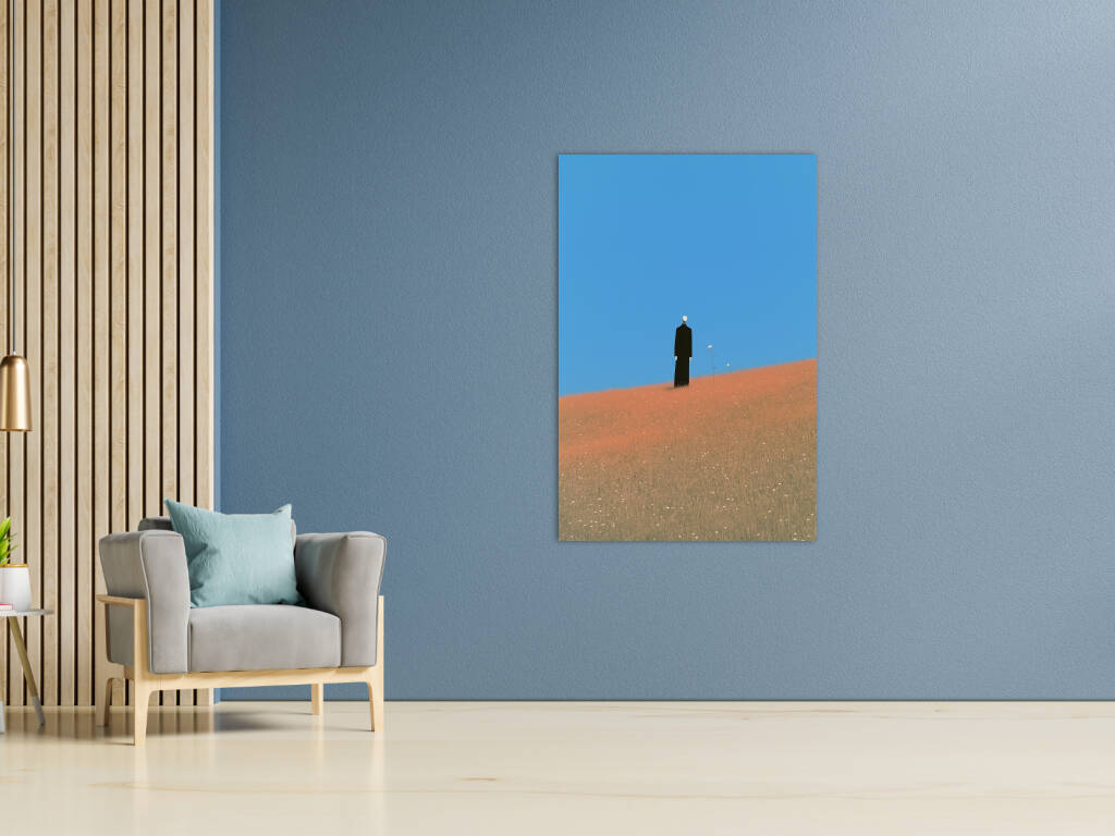 Man in a Field toont een mysterieuze figuur in zwarte gewaden die eenzaam staat in een gouden graanveld onder een heldere blauwe hemel. De minimalistische compositie en het sterke kleurcontrast creëren een gevoel van isolatie en contemplatie. Dit intrigerende beeld roept vragen op over identiteit, eenzaamheid en de menselijke conditie. Perfect voor liefhebbers van conceptuele kunst die houden van visuele verhalen met ruimte voor eigen interpretatie.