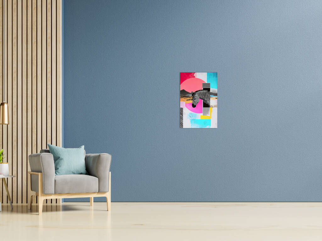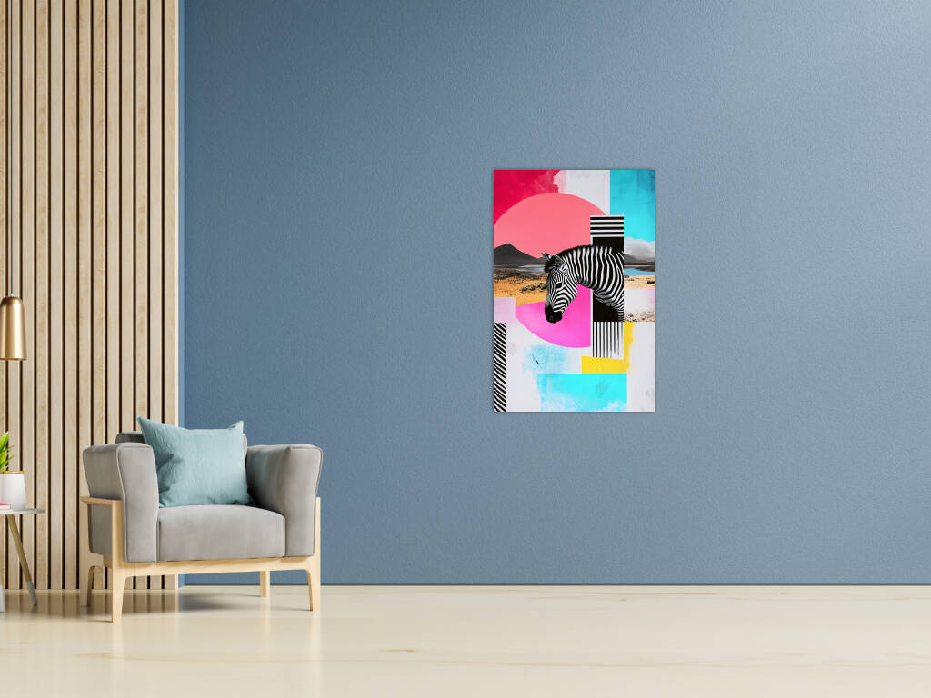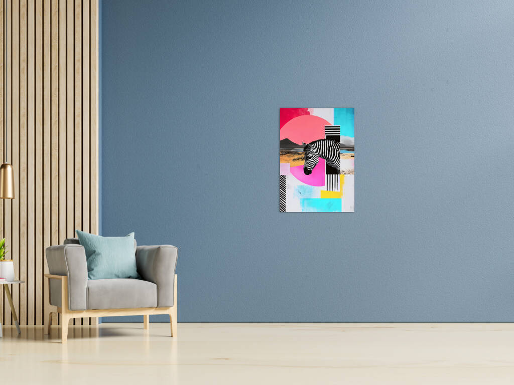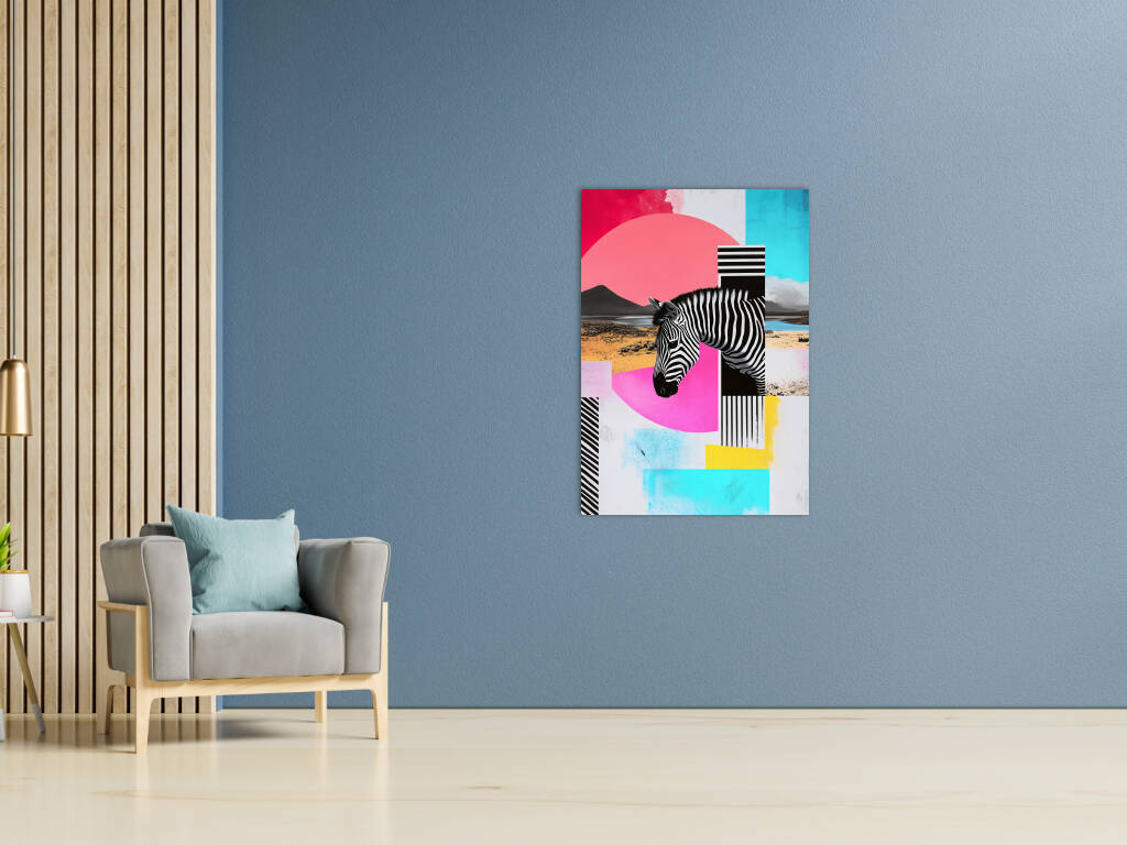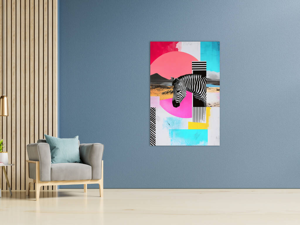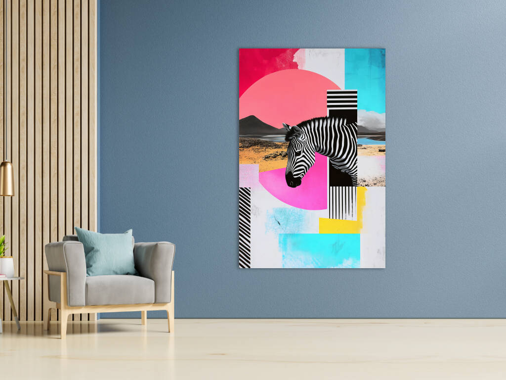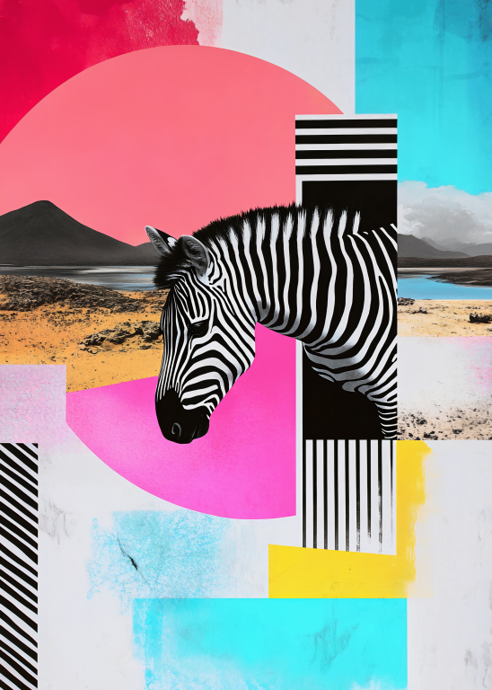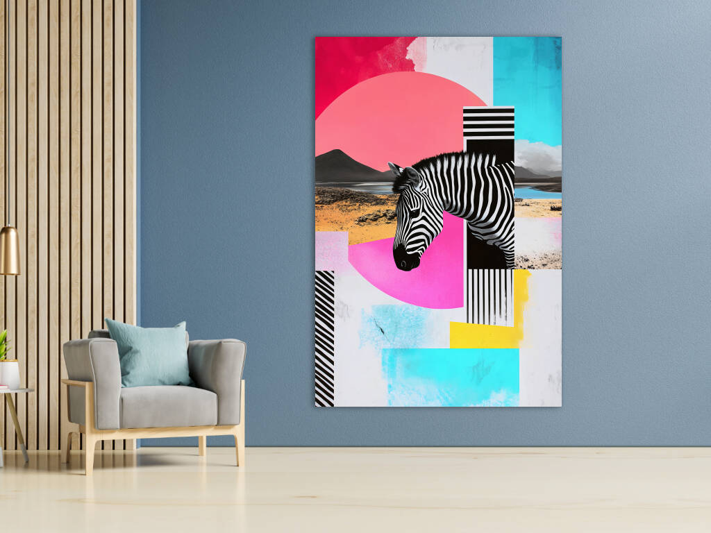 Zebra Collage combineert de natuurlijke schoonheid van een zebra met een levendige abstracte compositie van geometrische vormen en felle kleuren. Het realistische dier wordt omgeven door roze cirkels, turquoise blokken en contrasterende zwart-wit strepen die echoën de natuurlijke patronen van de zebra. De surrealistische landschapsachtergrond met bergen en gouden tinten wordt doorbroken door moderne grafische elementen. Dit contemporary kunstwerk brengt pop art esthetiek samen met natuurfotografie in een unieke en opvallende visuele ervaring.