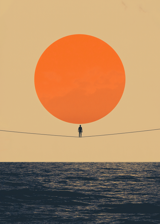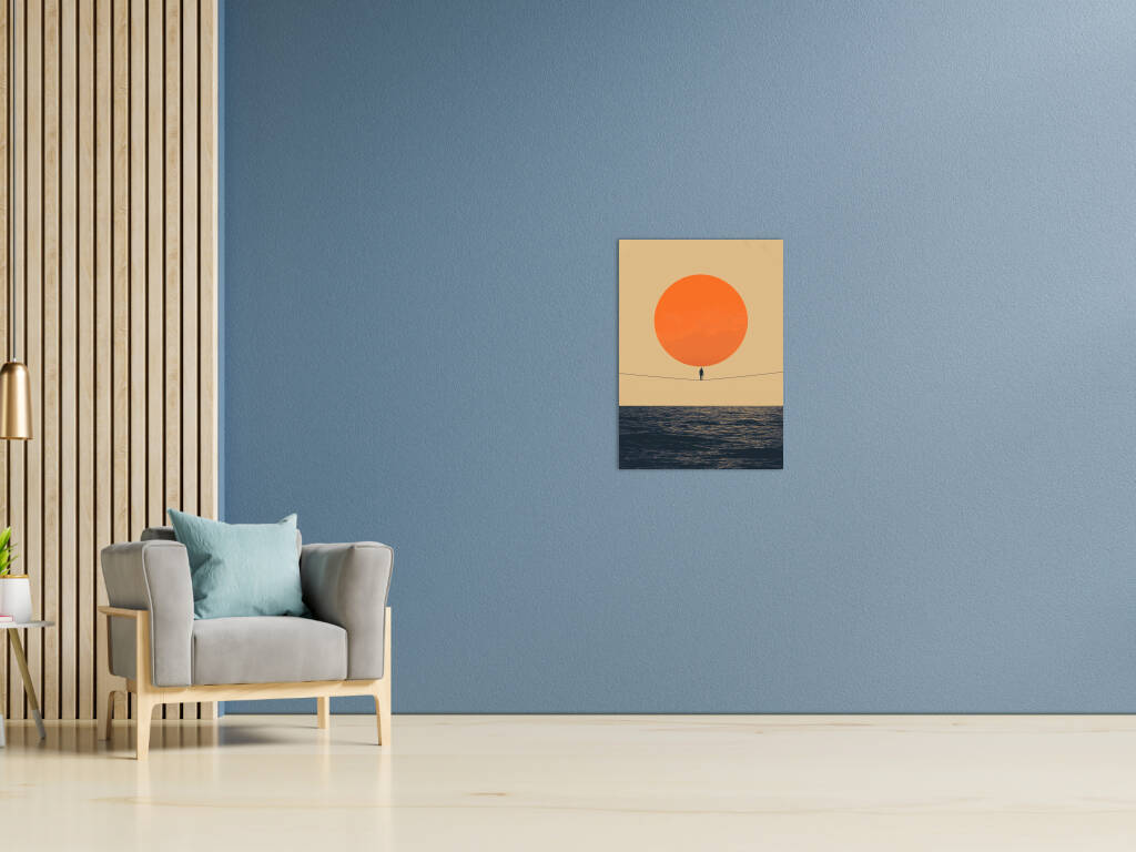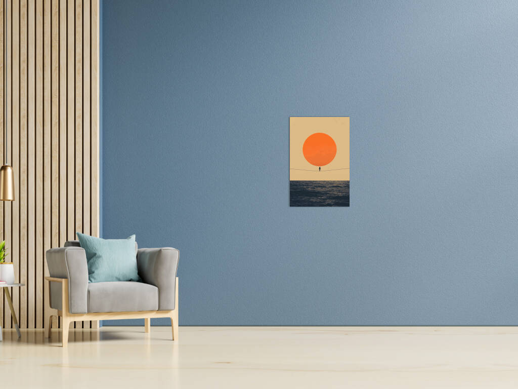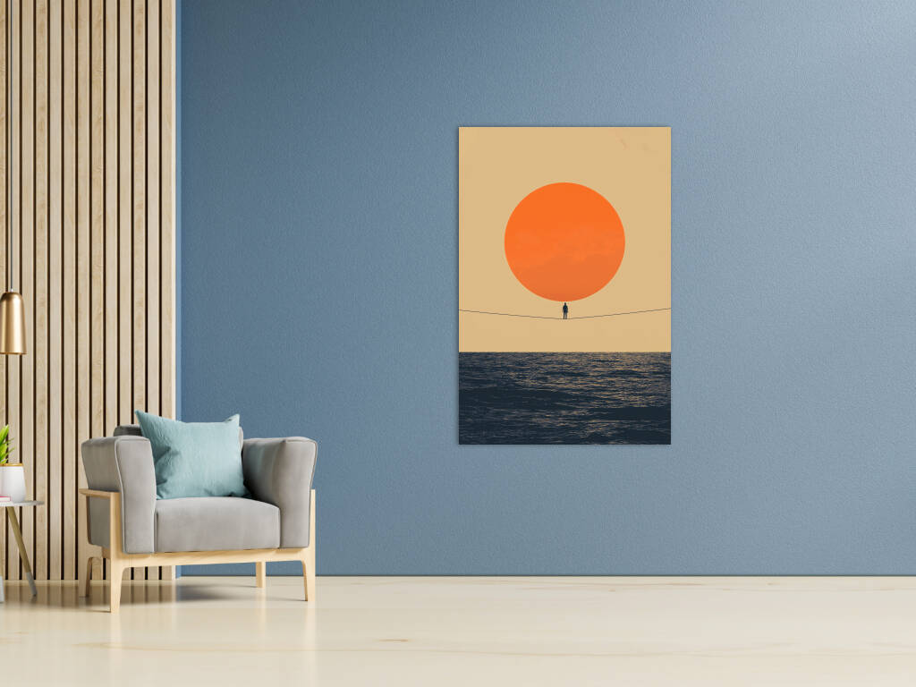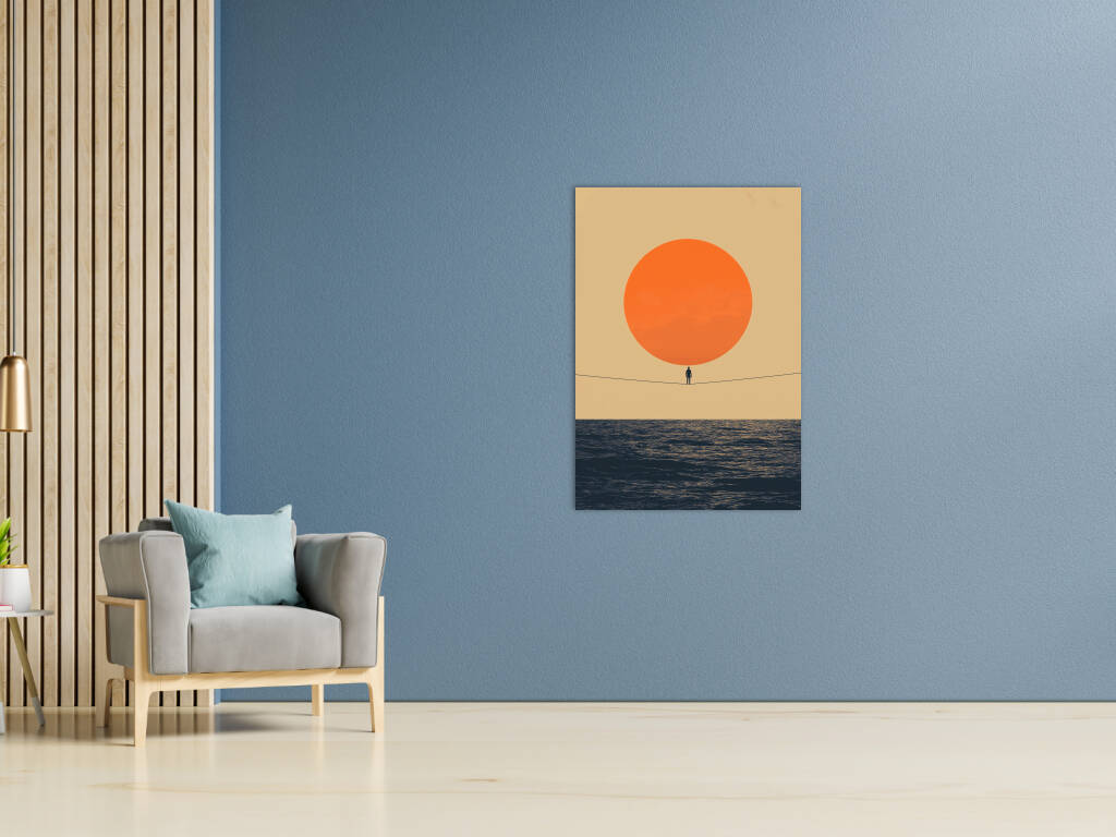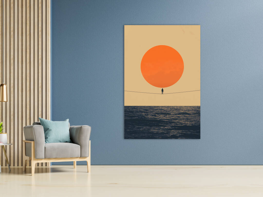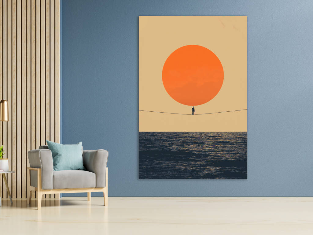 Thin Line toont een minimalistisch meesterwerk waarin een eenzame figuur balanceert op een dunne lijn tussen een enorme oranje zon en de uitgestrekte oceaan. Dit conceptuele kunstwerk speelt met schaal, evenwicht en de kwetsbaarheid van het menselijk bestaan. De warme kleuren en eenvoudige compositie creëren een krachtig visueel statement over moed en het vinden van balans in het leven. Perfect voor wie houdt van betekenisvolle kunst met een filosofische ondertoon.
