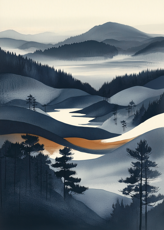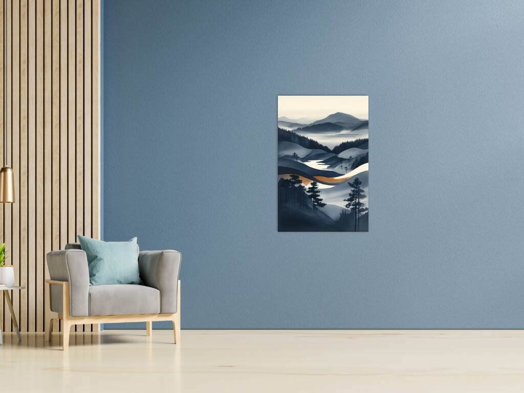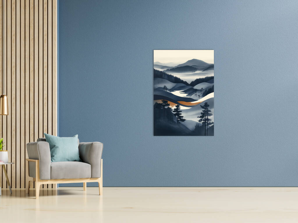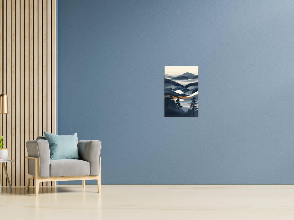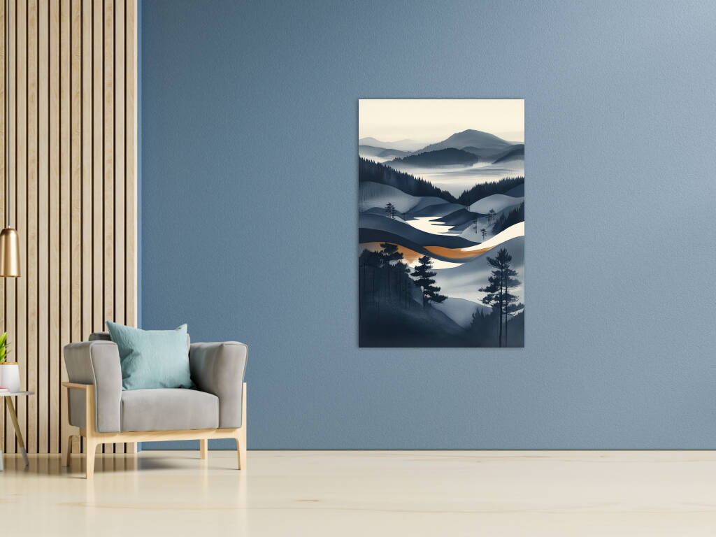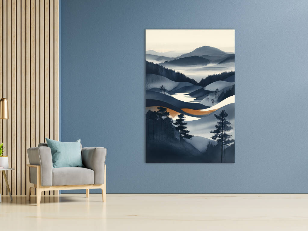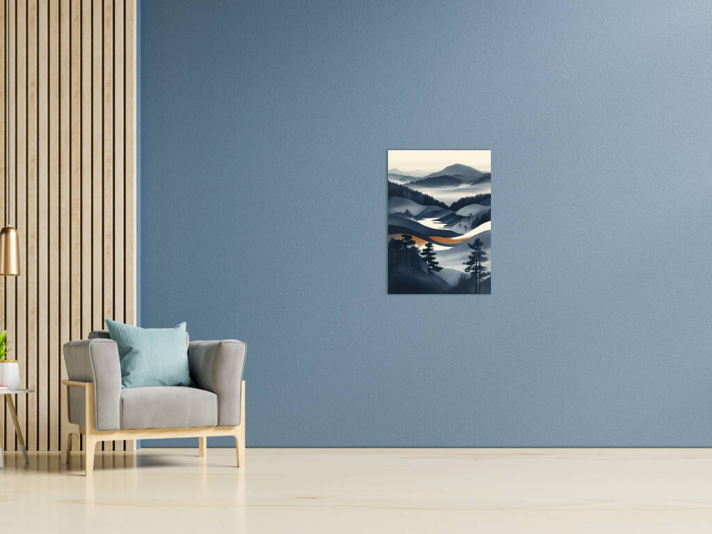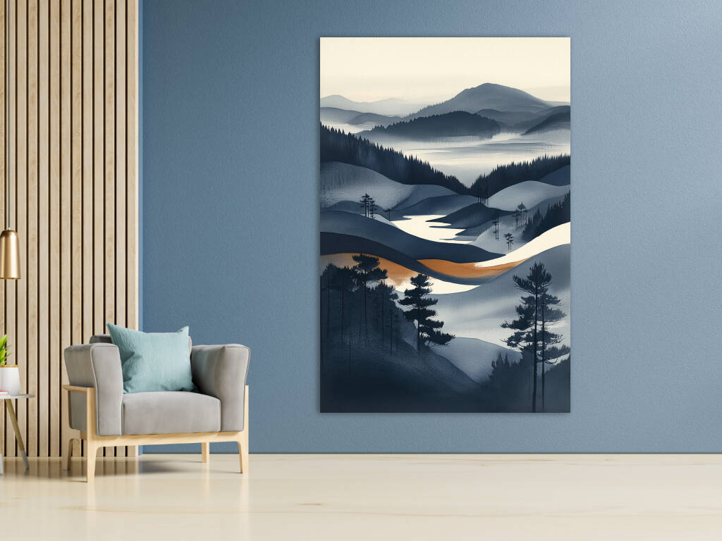 Snowy Hills toont een sereen winterlandschap waar mistige berglagen in zachte blauwe en grijze tinten zich uitstrekken tot aan de horizon. De minimalistische stijl en subtiele kleuraccenten van warm oranje creëren een gevoel van rust en contemplatie. Dit meditatieve kunstwerk vangt de stille schoonheid van de natuur in haar meest verstilde vorm. Perfect voor moderne interieurs die verlangen naar een moment van rust en de tijdloze elegantie van berglandschappen.