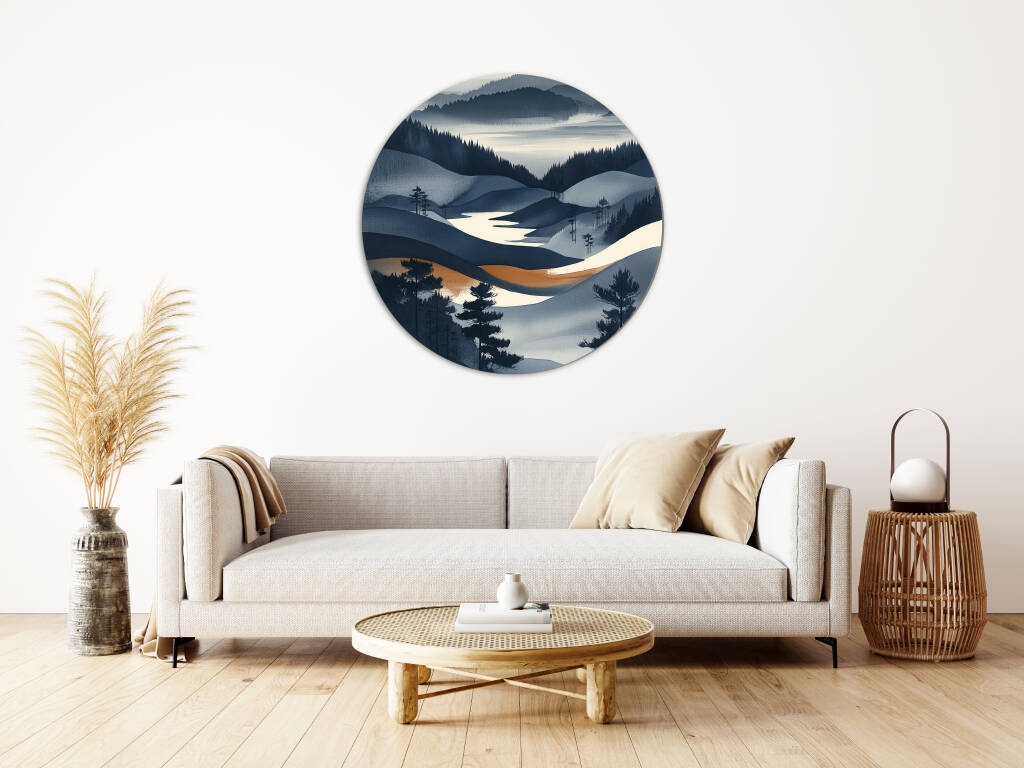 Snowy Hills toont een sereen winterlandschap waar mistige berglagen in zachte blauwe en grijze tinten zich uitstrekken tot aan de horizon. De minimalistische stijl en subtiele kleuraccenten van warm oranje creëren een gevoel van rust en contemplatie. Dit meditatieve kunstwerk vangt de stille schoonheid van de natuur in haar meest verstilde vorm. Perfect voor moderne interieurs die verlangen naar een moment van rust en de tijdloze elegantie van berglandschappen.