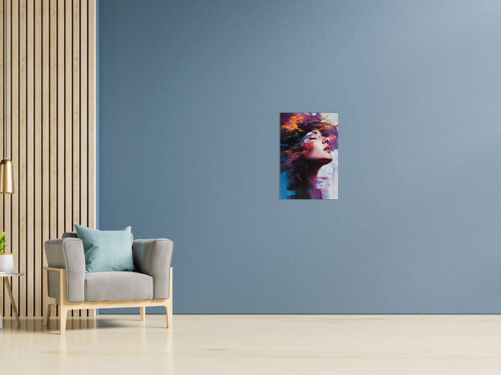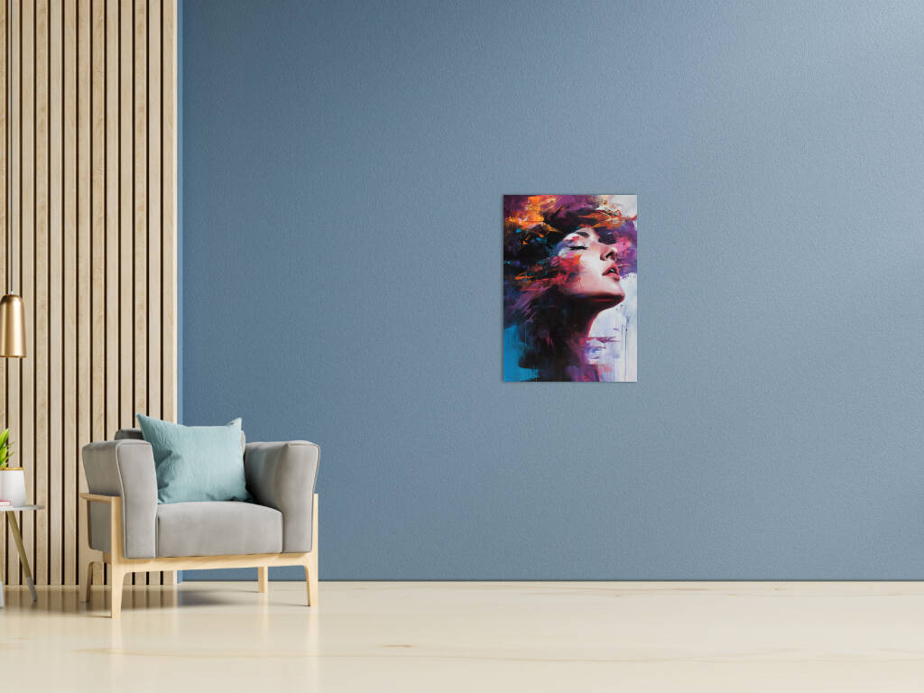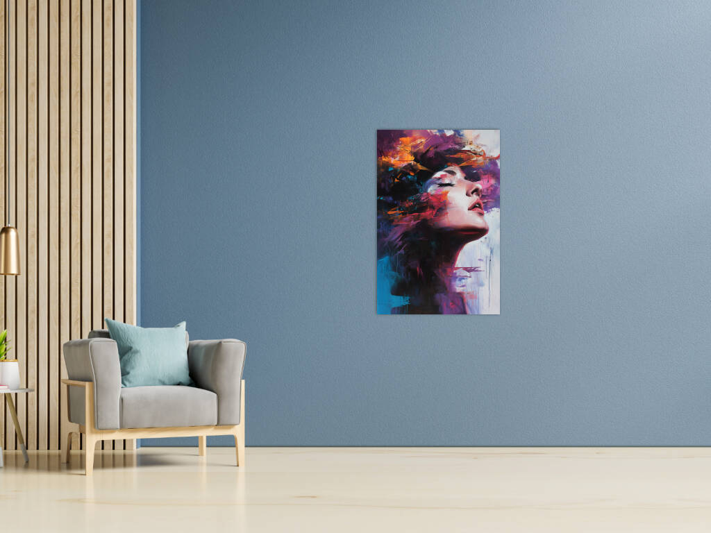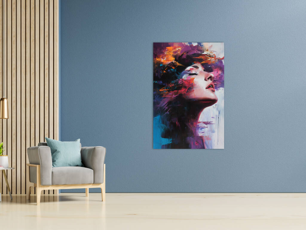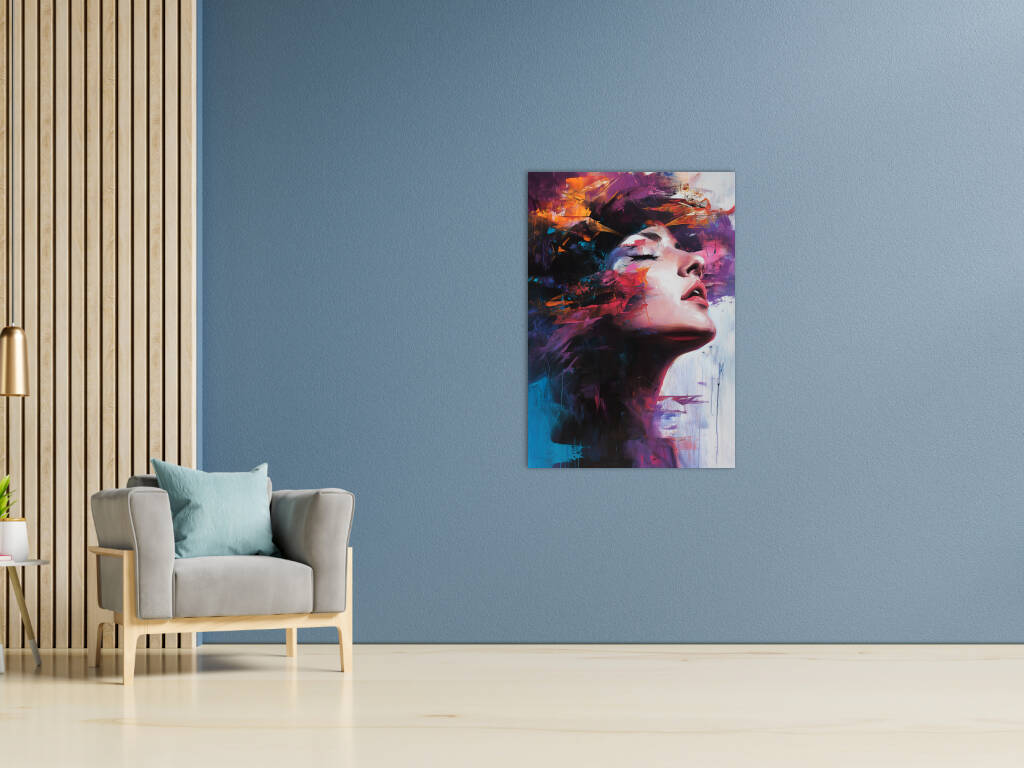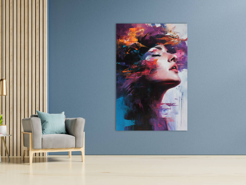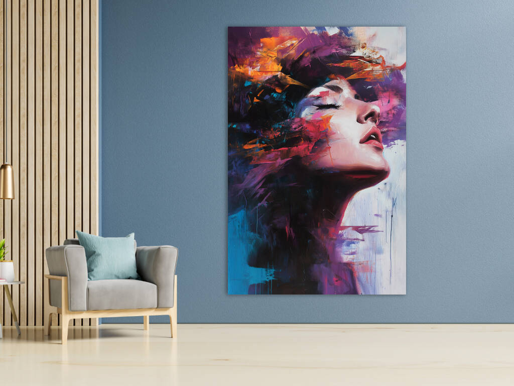 Mind of a Woman toont een expressief portret waarin emotie en kleur explosief samenkomen in abstracte penseelstreken van paars, oranje en blauw. De vrouw met gesloten ogen lijkt verloren in gedachten, terwijl de dynamische verfstreken de complexiteit van innerlijke werelden visualiseren. Dit krachtige kunstwerk combineert figuratieve en abstracte elementen om de rijkdom van vrouwelijke emotie en introspectie te vieren. Perfect voor liefhebbers van moderne portretten die zowel schoonheid als diepgang zoeken.