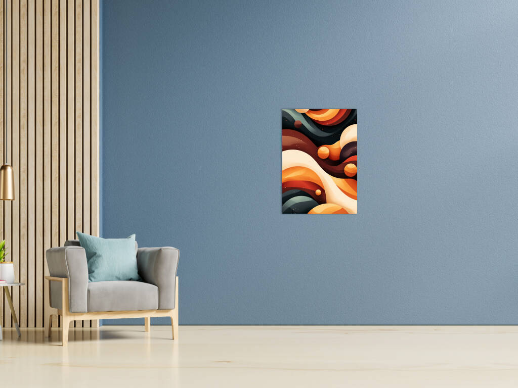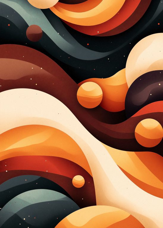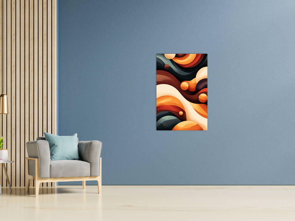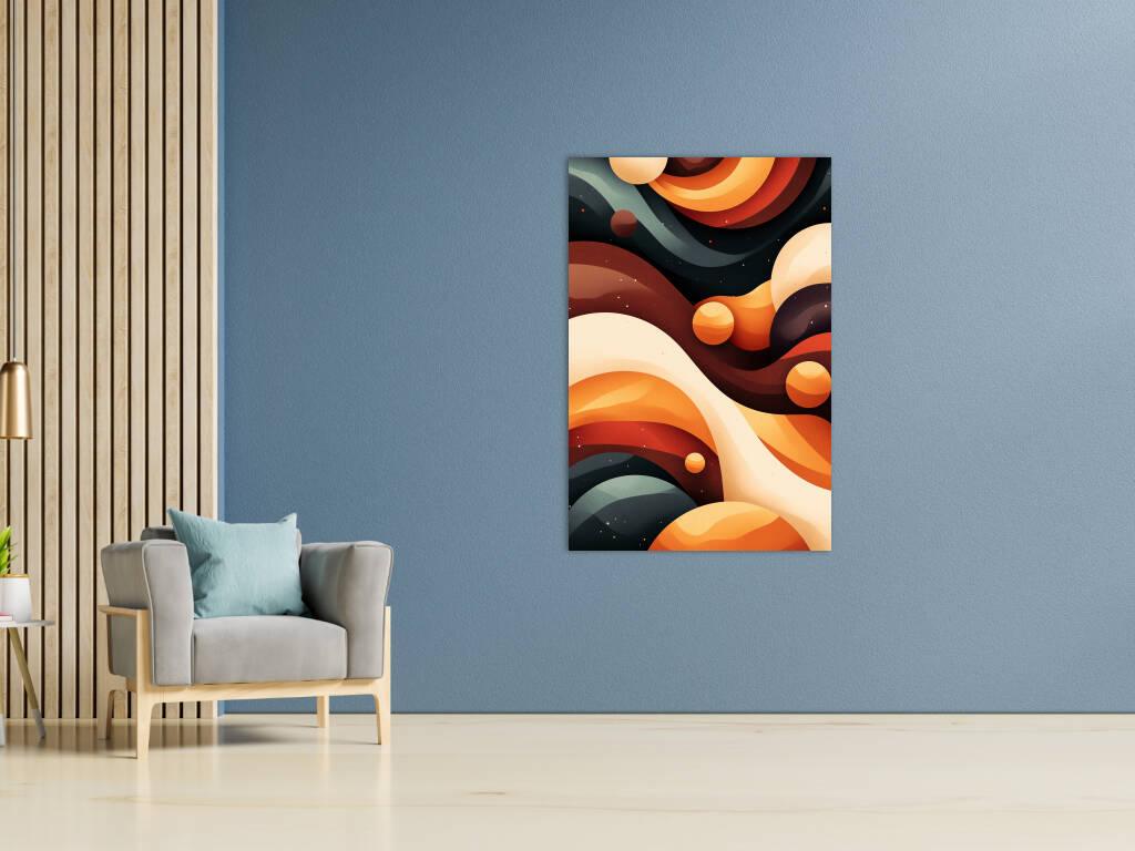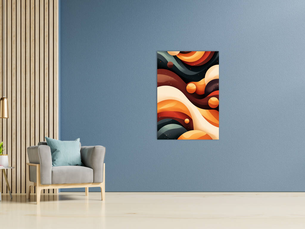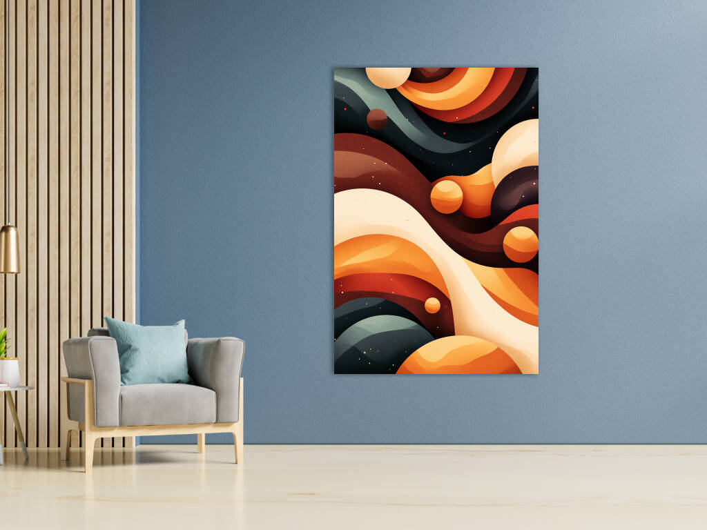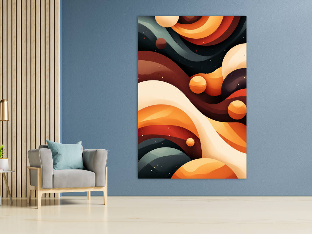 Een betoverend spel van golvende lijnen en kosmische vormen in warme aardetinten en diepe nachtblauwe accenten. De compositie geeft een ruimtelijk gevoel, alsof je door een abstracte, buitenaardse dimensie zweeft. De harmonie tussen kleur en vorm creëert een dromerige uitstraling, waarbij planeten en golvende structuren in een mystiek samenspel lijken te dansen.