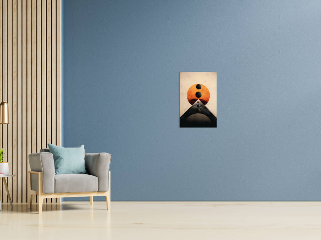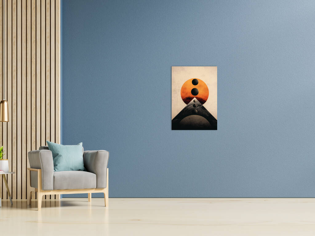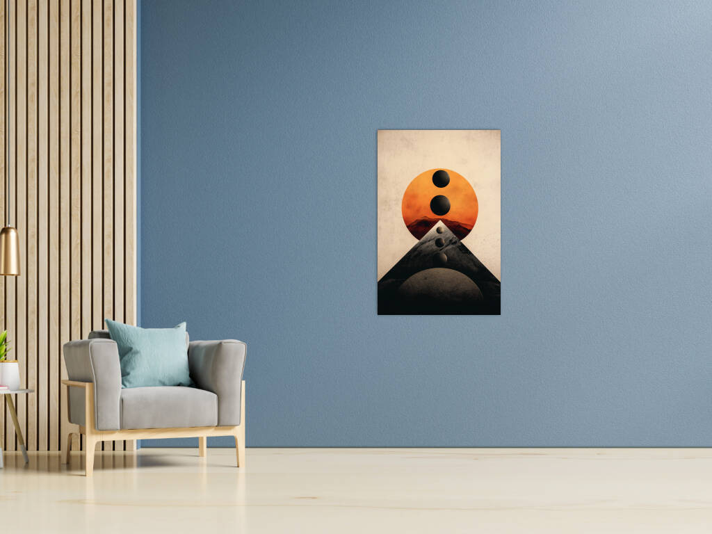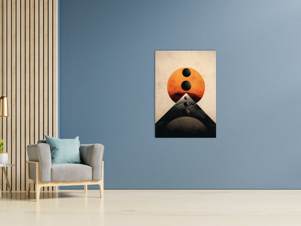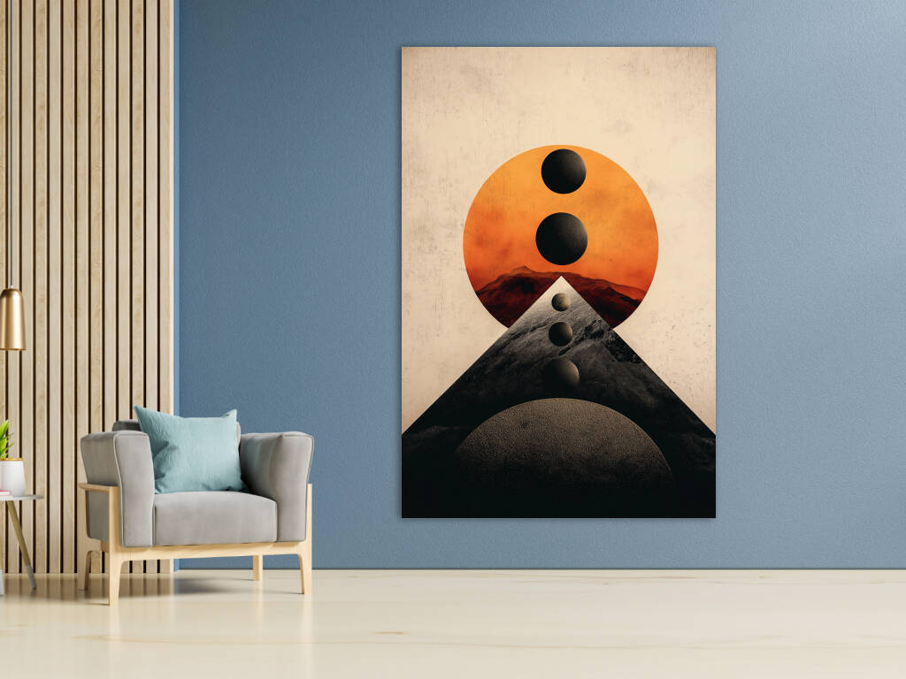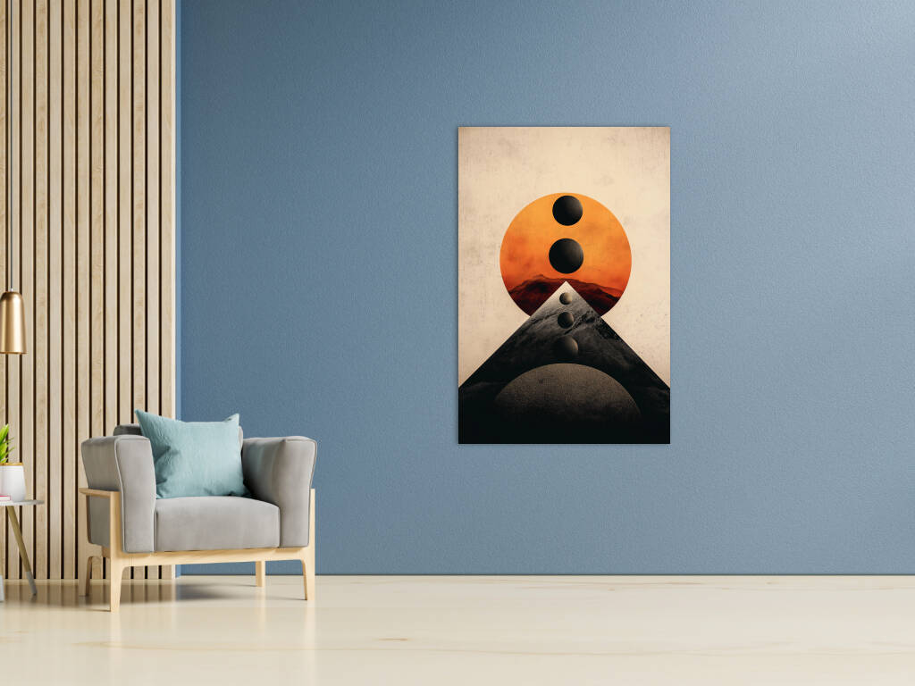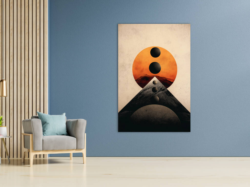 Een abstract kunstwerk met een harmonieuze compositie van geometrische vormen en natuurlijke elementen. Het beeld toont een grote oranje zon met donkere cirkels die in perfecte lijn zijn uitgelijnd boven een gelaagde bergachtige structuur. De combinatie van warme en aardse tinten, samen met de symmetrische compositie, creëert een gevoel van balans en mystiek. Het kunstwerk straalt rust en evenwicht uit, terwijl het ook een surrealistische, bijna kosmische dimensie oproept. Perfect voor een moderne en minimalistische interieurstijl.