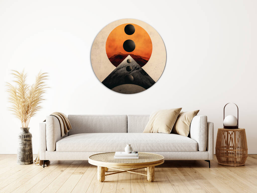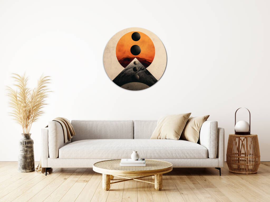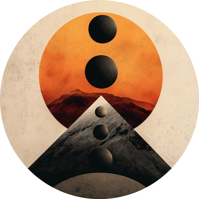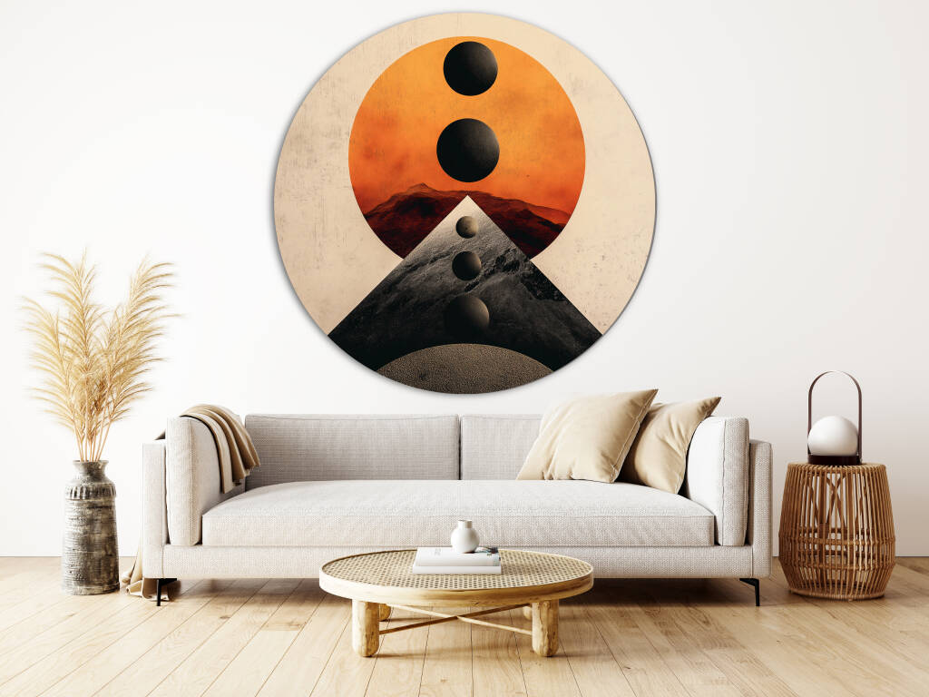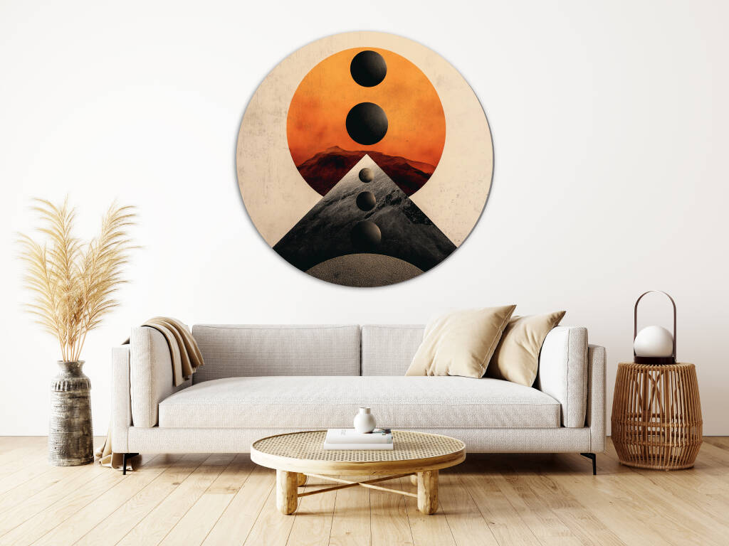 Een abstract kunstwerk met een harmonieuze compositie van geometrische vormen en natuurlijke elementen. Het beeld toont een grote oranje zon met donkere cirkels die in perfecte lijn zijn uitgelijnd boven een gelaagde bergachtige structuur. De combinatie van warme en aardse tinten, samen met de symmetrische compositie, creëert een gevoel van balans en mystiek. Het kunstwerk straalt rust en evenwicht uit, terwijl het ook een surrealistische, bijna kosmische dimensie oproept. Perfect voor een moderne en minimalistische interieurstijl.