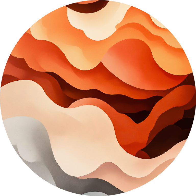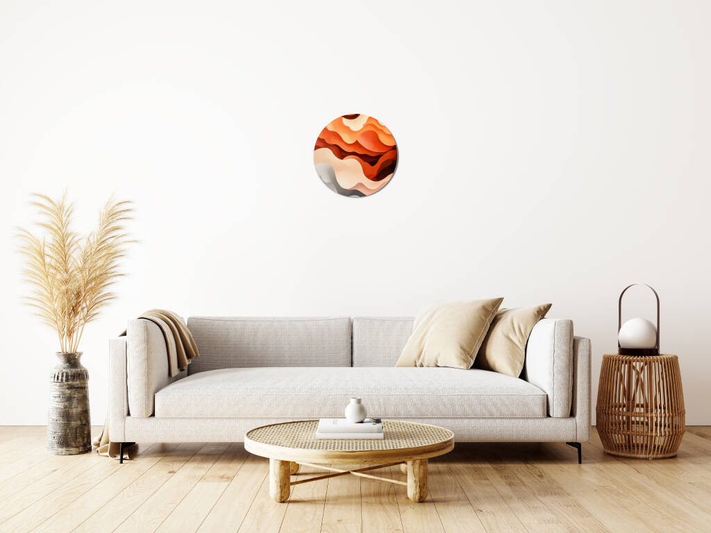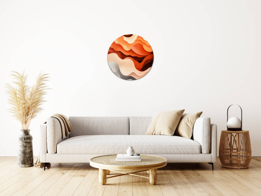 Een abstracte compositie van golvende, gelaagde vormen die doen denken aan een gestileerd landschap of wolkenformaties. De kleuren lopen van warme oranjetinten in de bovenste helft naar koelere grijstinten onderaan, wat een mooi contrast en diepte-effect creëert. De zachte overgangen en vloeiende lijnen geven het werk een harmonieuze en bijna dromerige uitstraling. Het is een modern en minimalistisch stuk dat goed past bij een rustgevende, maar stijlvolle interieurinrichting.