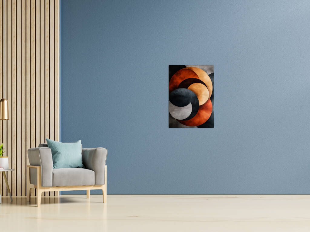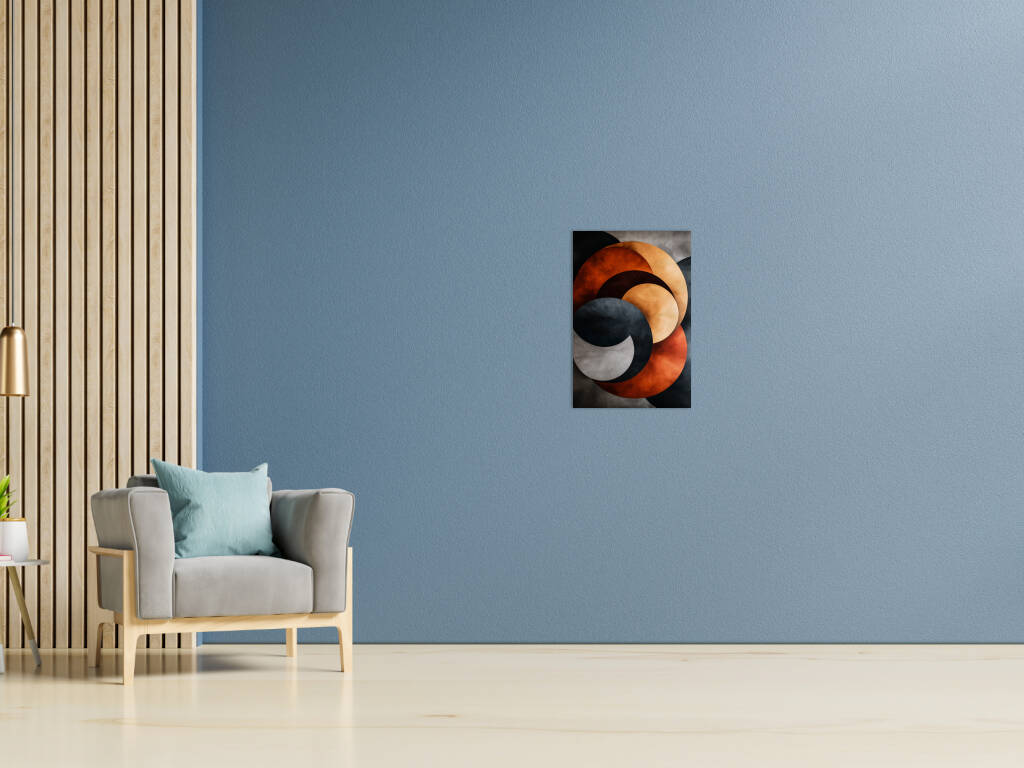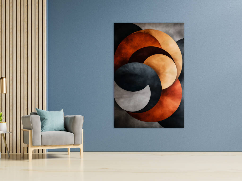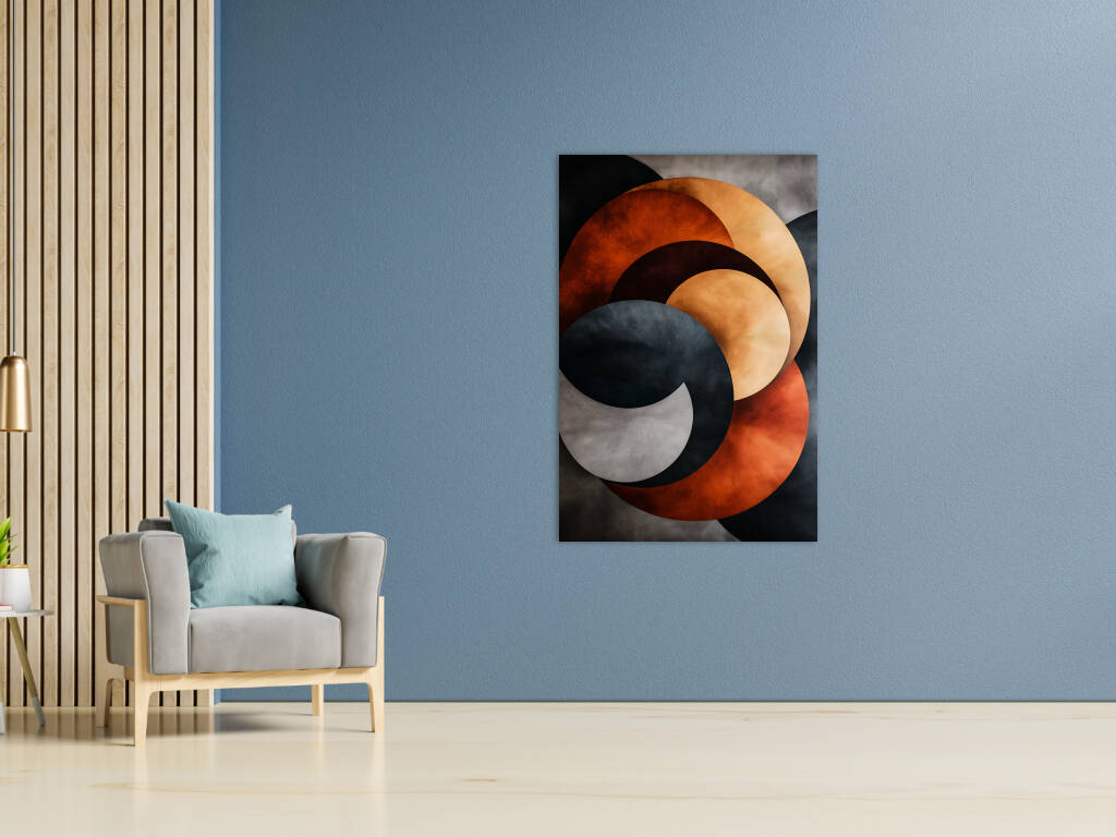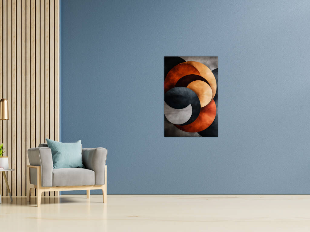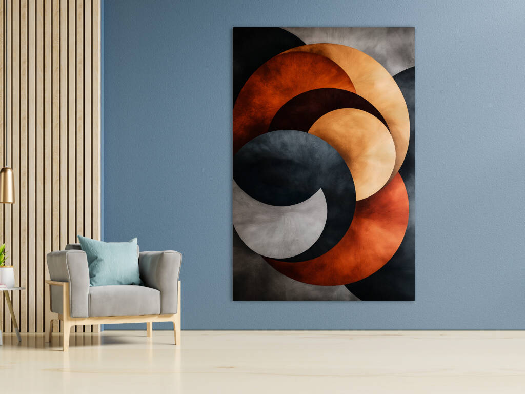 Stacked Metals verkent de industriële schoonheid van gestapelde metalen vormen in een abstract spel van kleur en textuur. Overlappende cirkels in warme koperen en koele stalen tinten creëren een dynamische compositie die doet denken aan de patina van verweerd metaal. De texturen variëren van gladgepolijst tot geoxideerd, waarbij elke laag zijn eigen verhaal vertelt van tijd en transformatie. Dit kunstwerk brengt de esthetiek van industrieel design naar de kunstwereld, waarbij de schoonheid van ruwe materialen wordt verheven tot een verfijnde compositie. De interactie tussen de warme oranje-bruine tonen en de koele grijzen creëert een visuele spanning die zowel krachtig als harmonieus is. Een modern statement dat de schoonheid van het industriële tijdperk viert.
