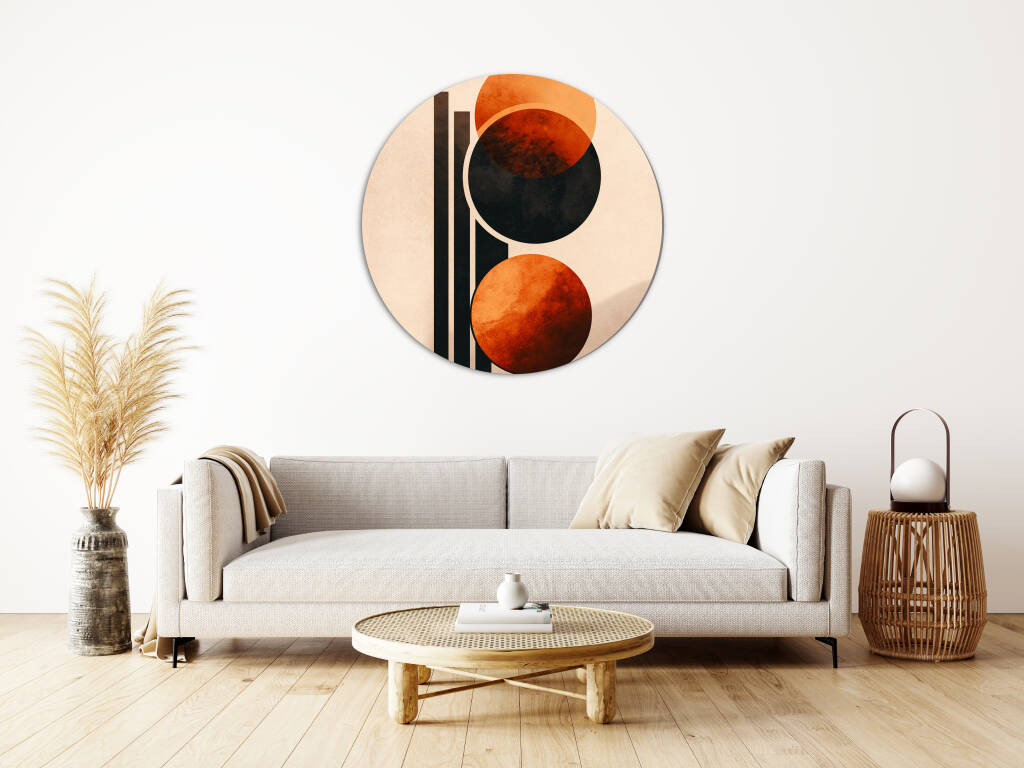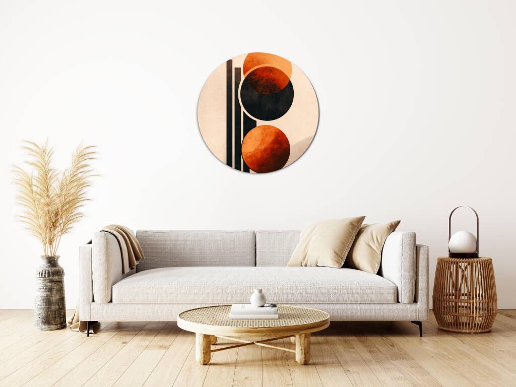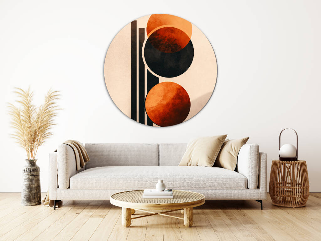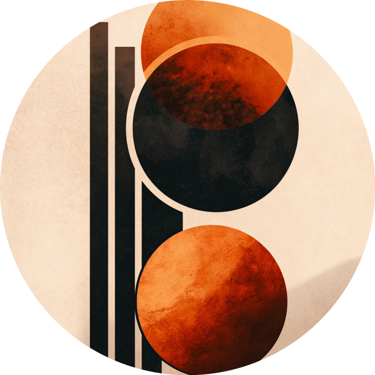 Three by Three presenteert een studie in geometrische perfectie en kleurharmonie. Drie cirkels in warme terracotta- en oranje tinten contrasteren met een diepzwarte schijf, terwijl verticale lijnen structuur en ritme aan de compositie toevoegen. De zachte, gestructureerde achtergrond in neutraal beige creëert een canvas waarop de vormen lijken te zweven. Dit minimalistische kunstwerk speelt met concepten van balans, herhaling en contrast. De overlappende cirkels suggereren beweging en dimensie, terwijl de strakke lijnen stabiliteit bieden. Het werk doet denken aan de Bauhaus-beweging en modernistische designprincipes, waarbij functie en vorm samenkomen in esthetische harmonie. Een tijdloos statement dat rust en moderniteit uitstraalt, perfect voor de hedendaagse kunstliefhebber.