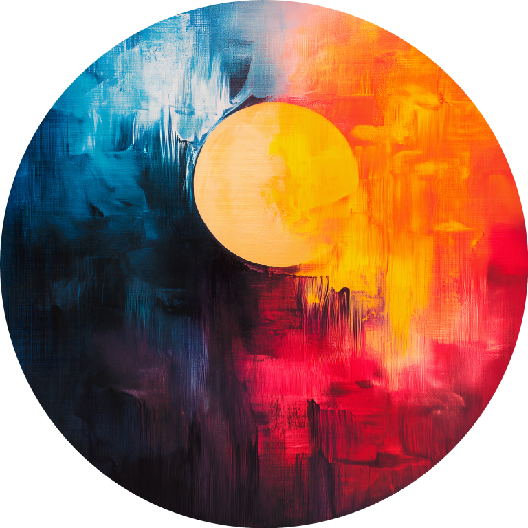 Two Sided presenteert een explosieve abstracte compositie waarin koele blauwe tinten botsen met warme oranje en rode kleuren, verenigd door een centraal geplaatste cirkel. De dynamische penseelstreken en druipende verf creëren een gevoel van beweging en emotionele spanning tussen tegengestelden. Dit krachtige kunstwerk symboliseert dualiteit, balans en de complexiteit van het leven. Perfect voor liefhebbers van moderne abstracte kunst die ruimte willen geven aan interpretatie en emotie.