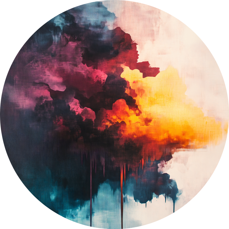 Leaking Clouds presenteert een dramatisch hemels schouwspel waar kleuren als vloeibare emoties naar beneden druipen. Diepe turquoise wolken versmelten met vurige oranje en rode tinten, terwijl donkere verfstrepen de illusie van regen creëren die uit de hemel lekt. Het werk balanceert tussen abstractie en figuratie, waarbij de wolkenformaties zowel herkenbaar als vervreemdend zijn. De verticale druppels voegen een gevoel van beweging en vergankelijkheid toe, alsof we getuige zijn van een hemel die smelt onder het gewicht van zijn eigen schoonheid. Dit kunstwerk verkent de grens tussen controle en chaos, tussen het natuurlijke en het surrealistische. Een krachtig visueel statement dat de vluchtigheid van natuurfenomenen vangt in een moment van artistieke expressie.