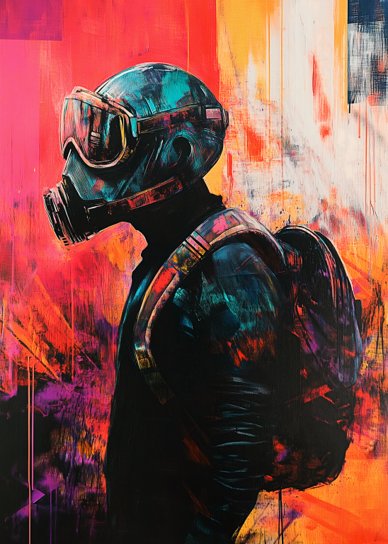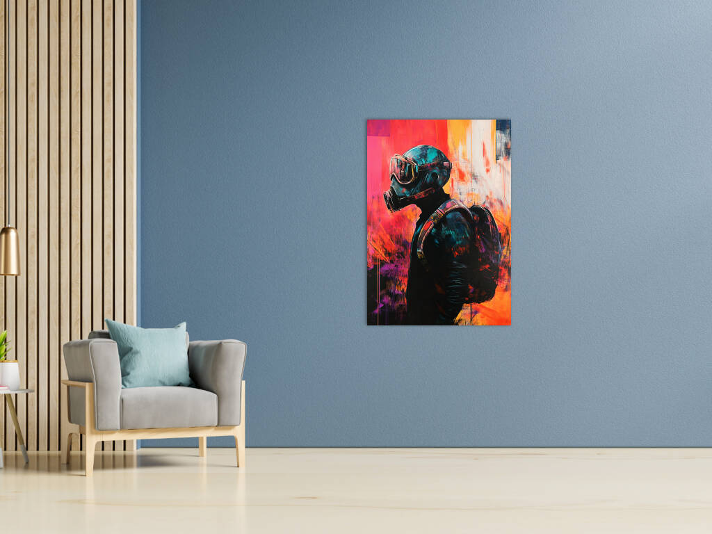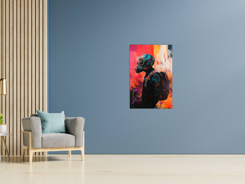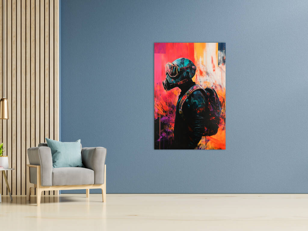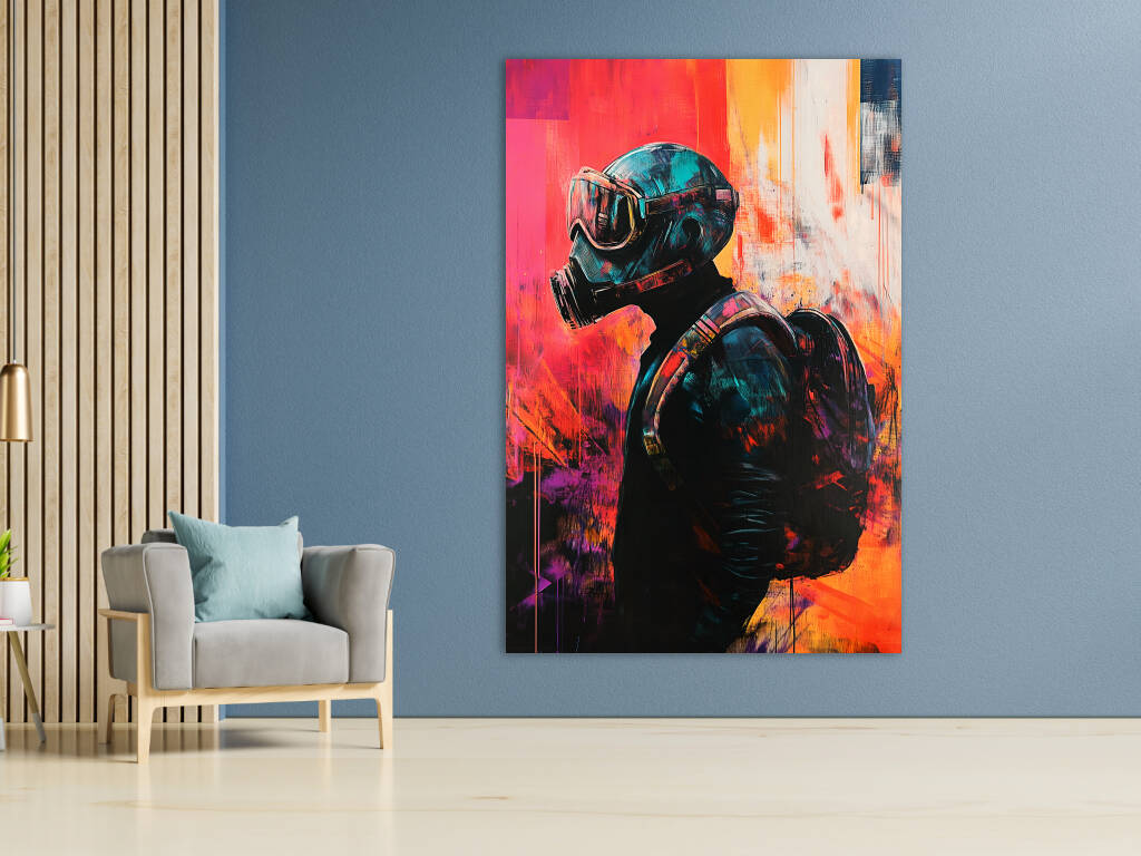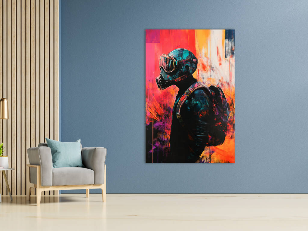Pandemic presenteert een krachtige artistieke interpretatie van onze moderne tijd waarin een figuur met gasmasker wordt omgeven door expressieve verfstreken in levendige oranje, rode en blauwe tinten. De grunge-achtige texturen en de abstracte kleurvlakken creëren een gevoel van chaos en verandering, terwijl de centrale figuur stoicisme en doorzettingsvermogen uitstraalt. De street art-esthetiek en de rauwe energie van het kunstwerk maken het tot een krachtige sociale commentaar. Dit provocerende kunstwerk brengt de complexiteit van onze tijd tot uiting en nodigt uit tot reflectie over veerkracht en aanpassing.