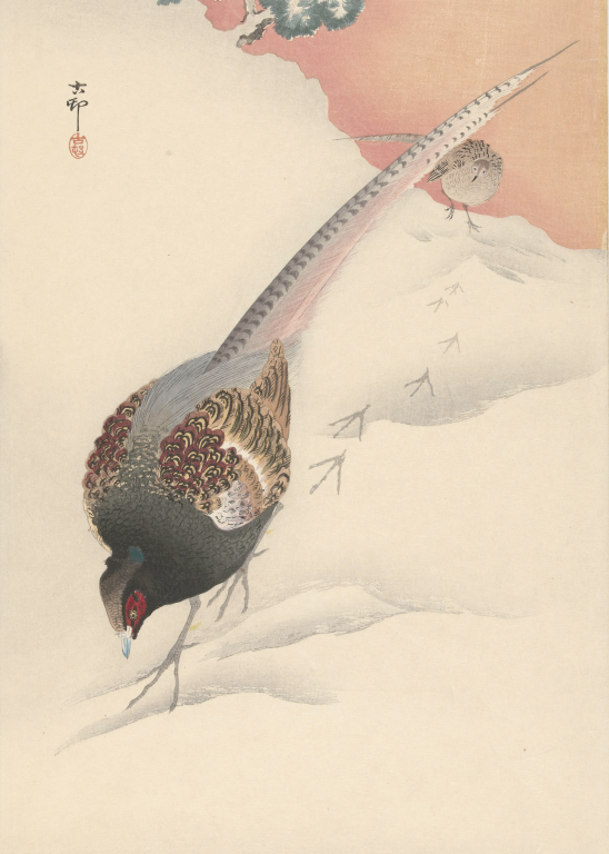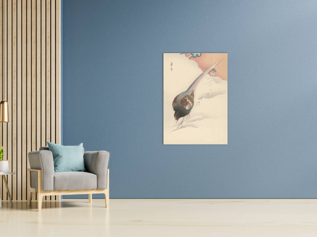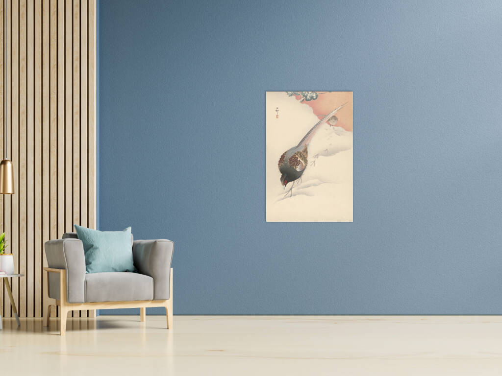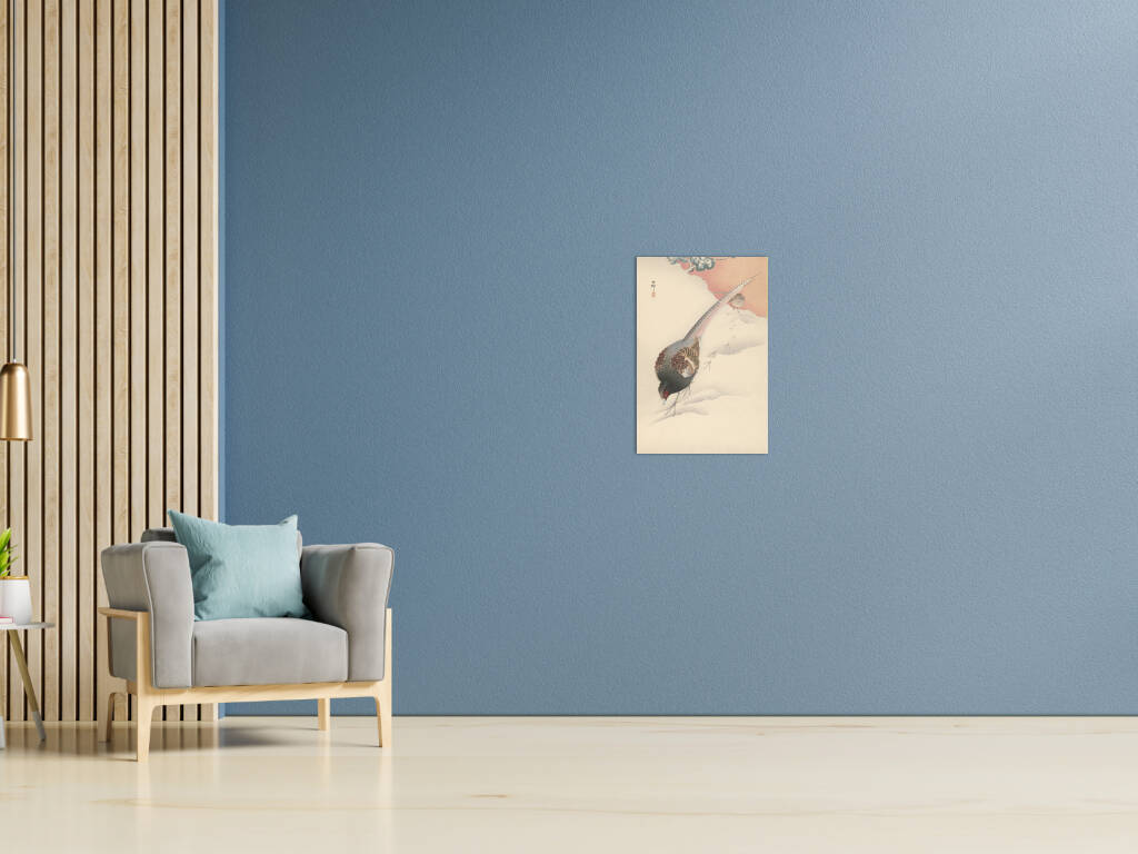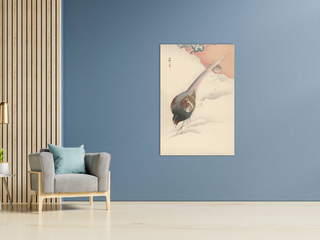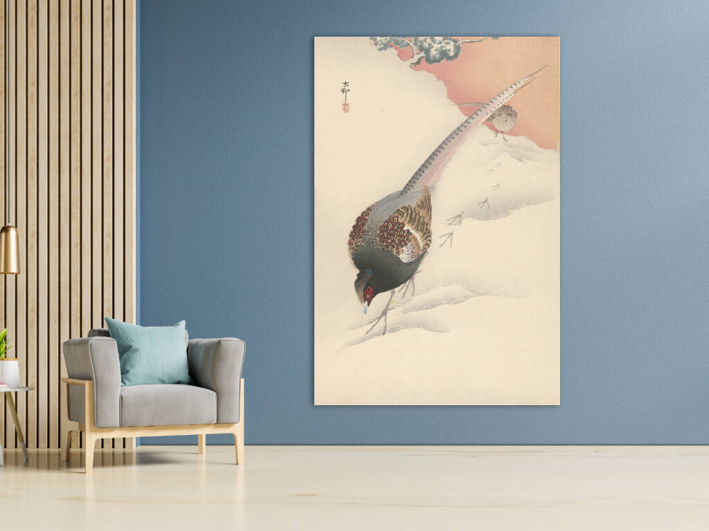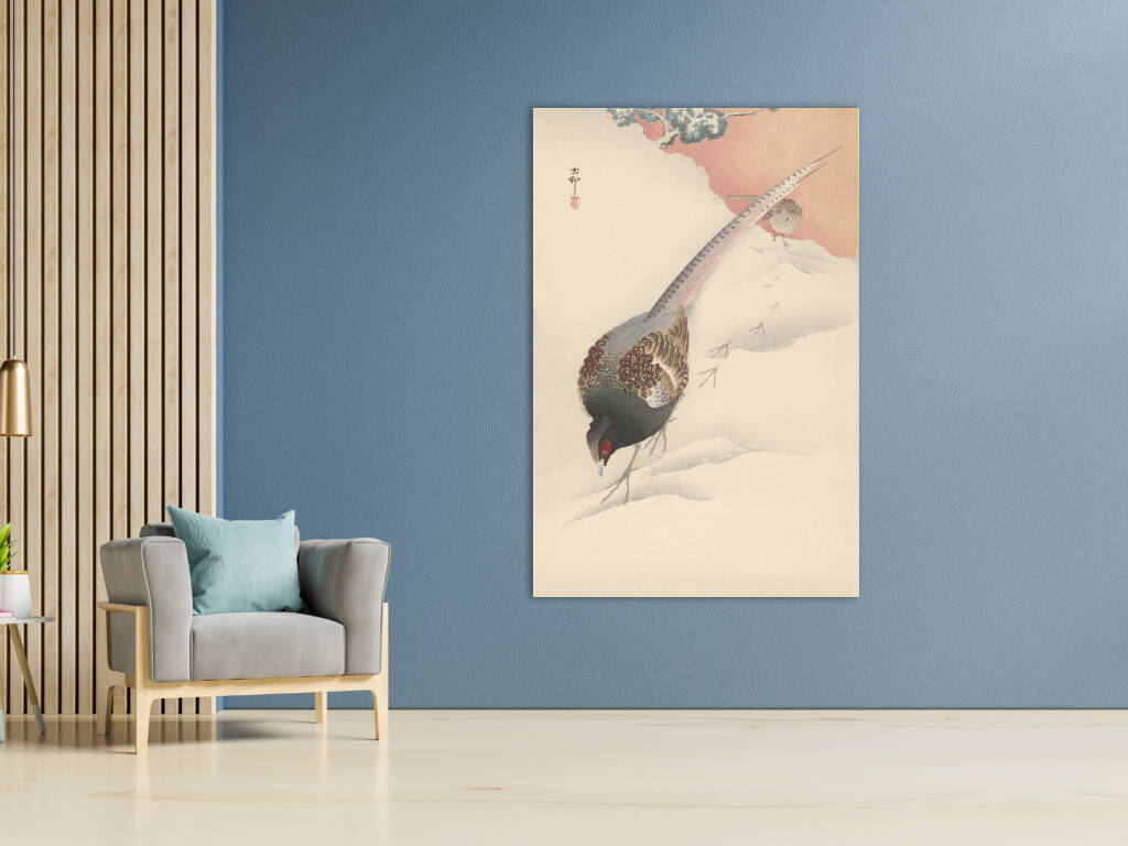 Fazantenkoppel in de Sneeuw presenteert een klassieke Japanse kunstwerk waarin twee elegante fazanten hun winterdans uitvoeren in een verstilde sneeuwlandschap. De delicate penseelstreken en de verfijnde kleuren tonen de traditionele Japanse esthetiek in al zijn pracht, waarbij elke veer en elke beweging met een minutieuze precisie is vastgelegd. De zachte sneeuw contrasteert prachtig met de rijke patronen van de fazantenveren en creëert een gevoel van vredige contemplatie. Dit tijdloze meesterwerk brengt de sereniteit en elegantie van de Japanse kunst in je interieur.