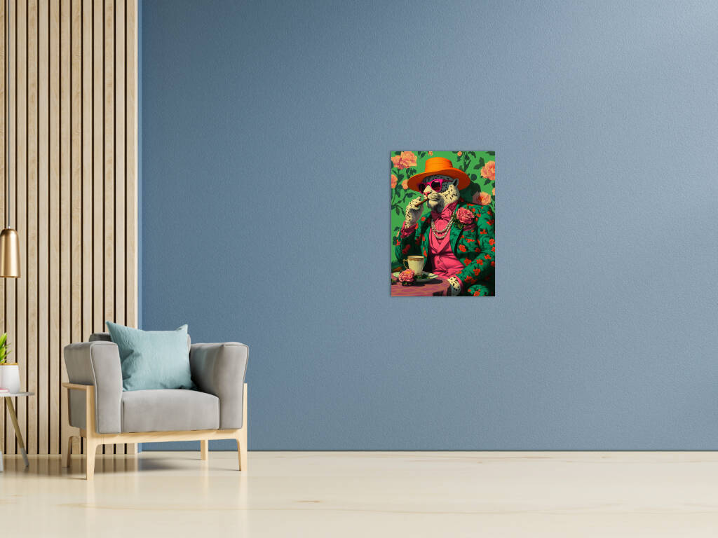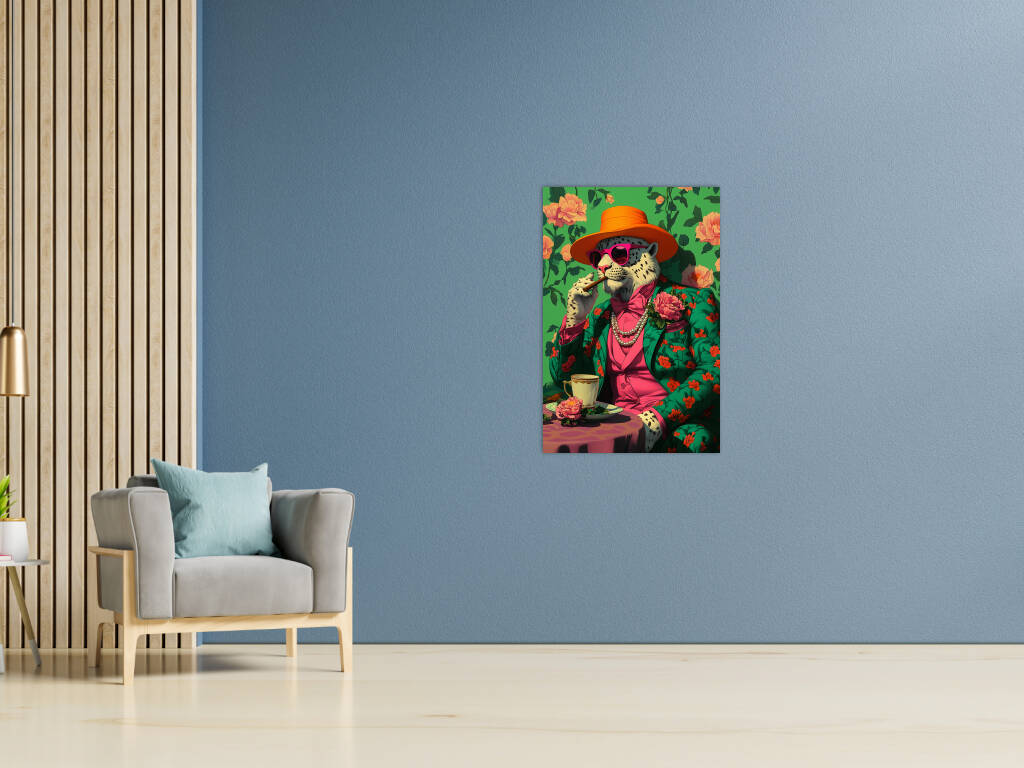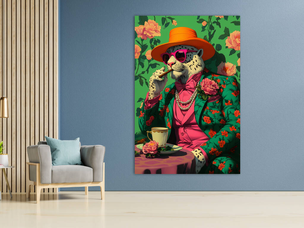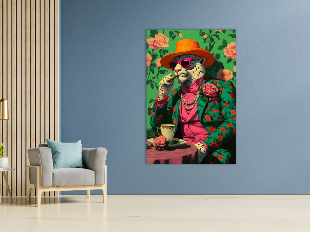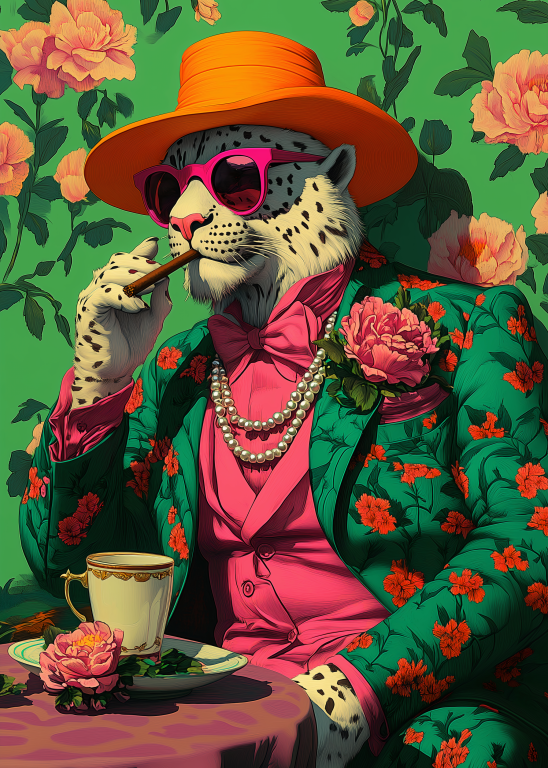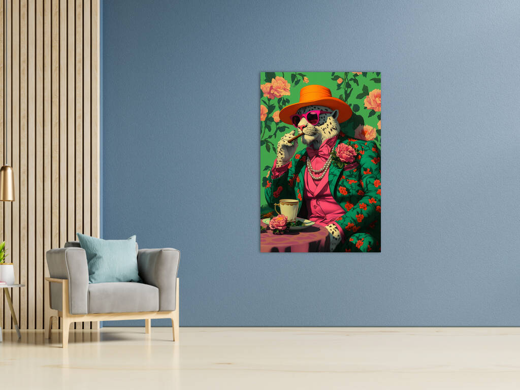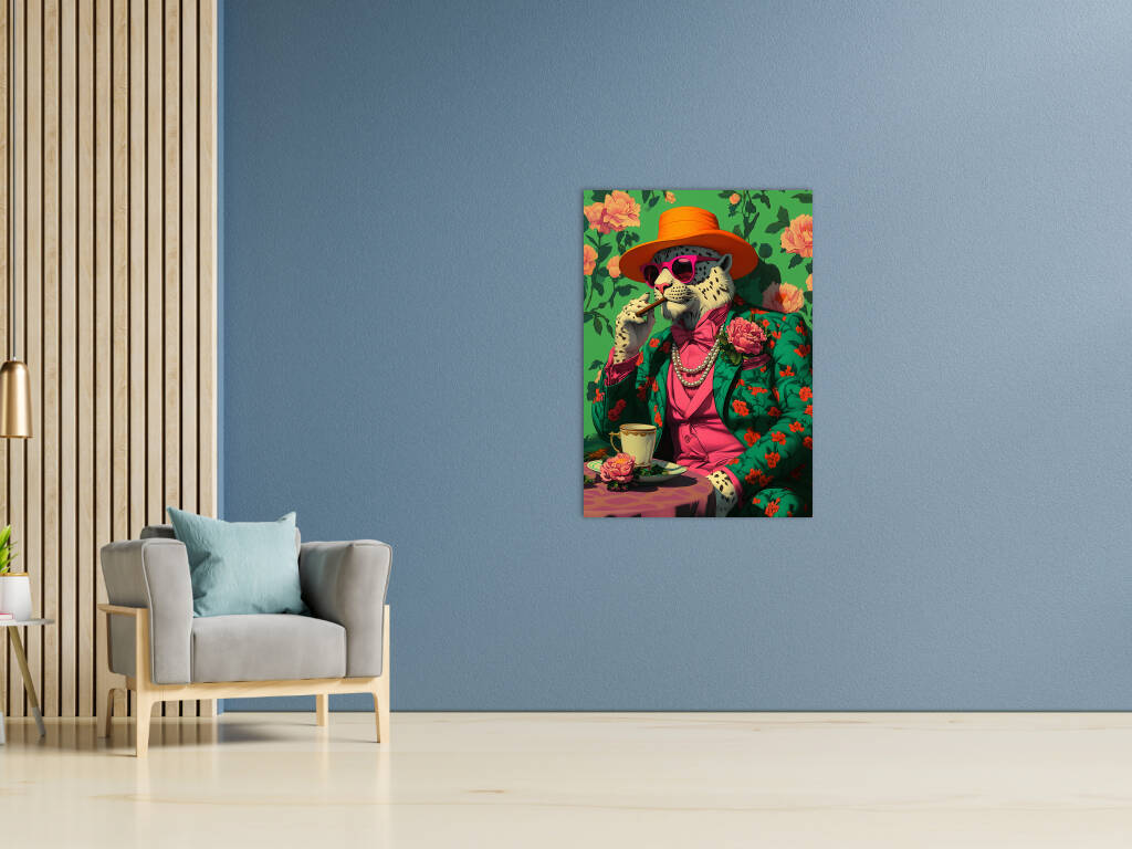 Hustler presenteert een charmante en humoristische scène waarin een stijlvolle luipaard geniet van een verfijnde theepauze te midden van een weelderige bloemental. Gekleed in een felroze vest, oranje hoed en trendy zonnebril straalt dit katachtige karakter pure elegantie en zelfvertrouwen uit. De levendige kleuren van de bloemen en het speelse contrast tussen wilde natuur en geciviliseerde manieren creëren een vrolijke, satirische sfeer. Dit eigentijdse kunstwerk brengt humor en kleur in elke ruimte en nodigt uit tot een glimlach.