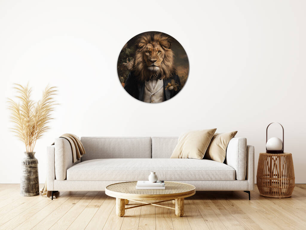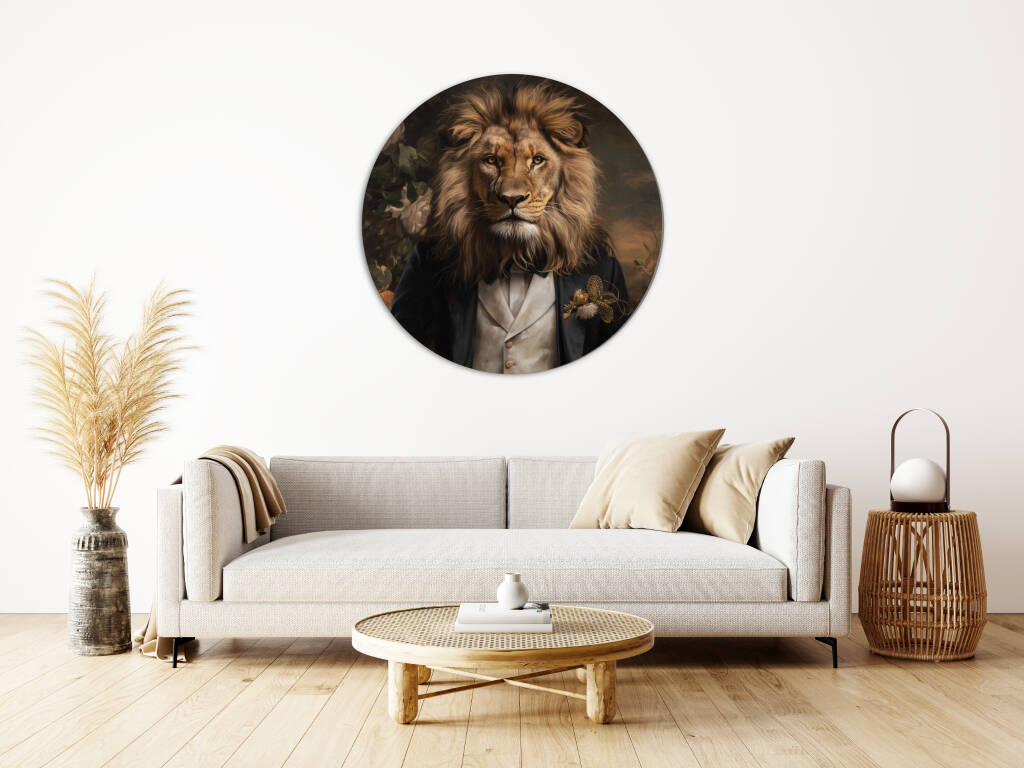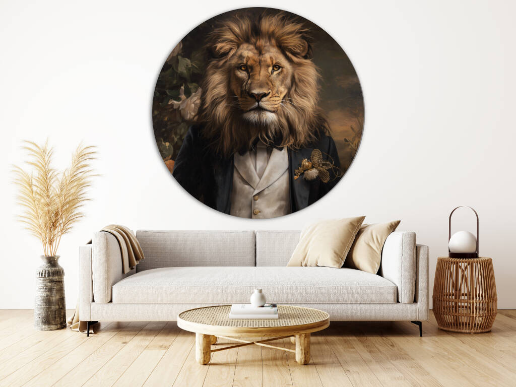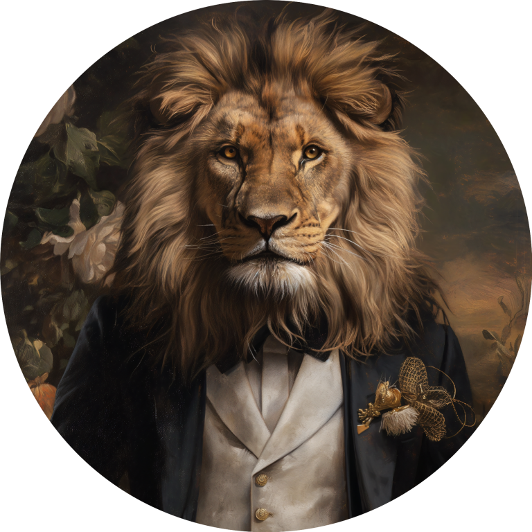 Husband of the Jungle combineert klassieke elegantie met wilde kracht door een statige leeuw in een verfijnd zwart pak met een crèmekleurig gilet en gouden accenten af te beelden. Zijn imposante manen vloeien naadloos over in het aristocratische silhouet, waardoor een intrigerend contrast ontstaat tussen de ruwe majesteit van de jungle en de verfijning van een edelman. De subtiele bloemendecoratie en de warme, klassieke achtergrond geven het geheel een tijdloze en vorstelijke uitstraling, waardoor het beeld zowel mysterieus als indrukwekkend aanvoelt.
