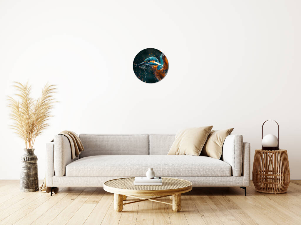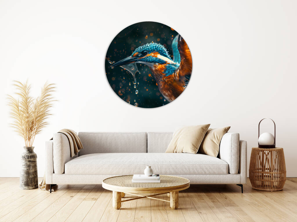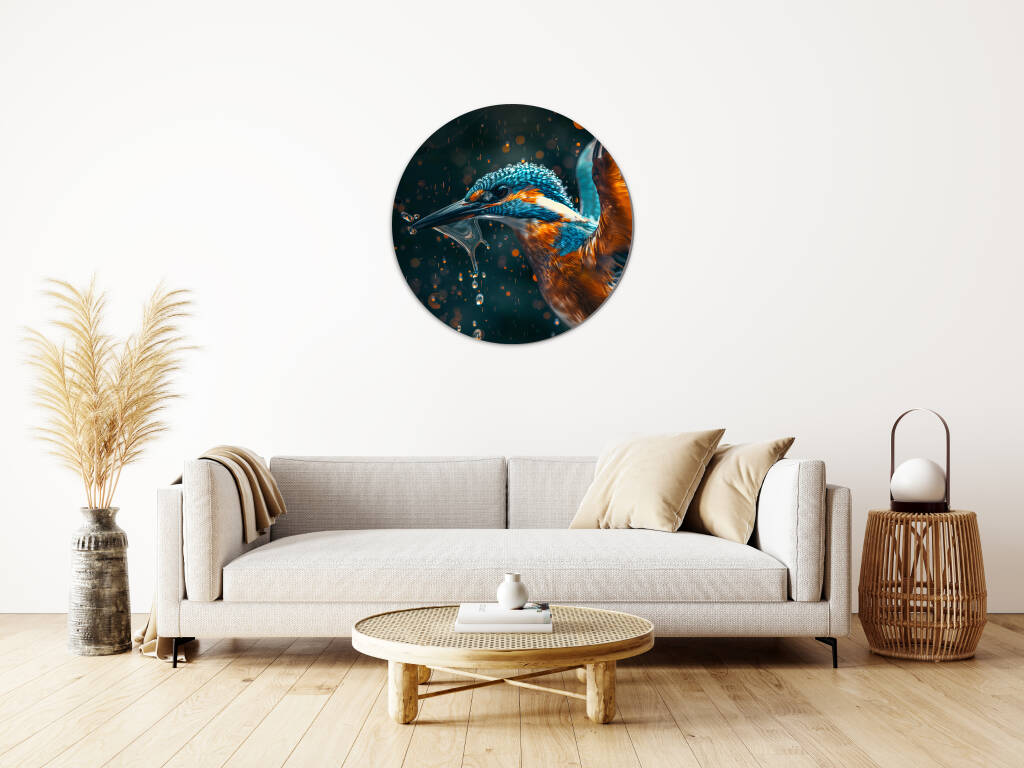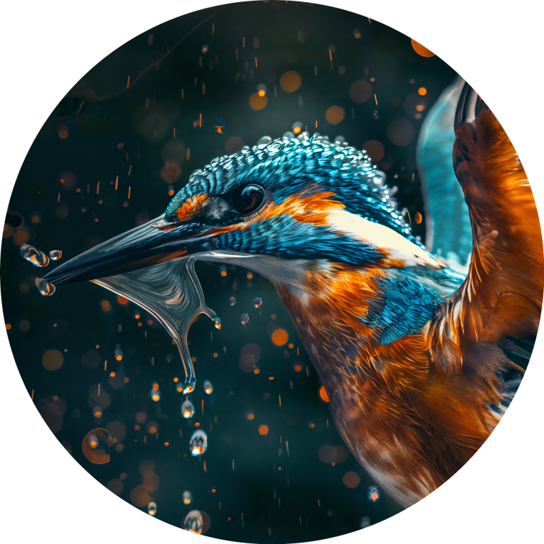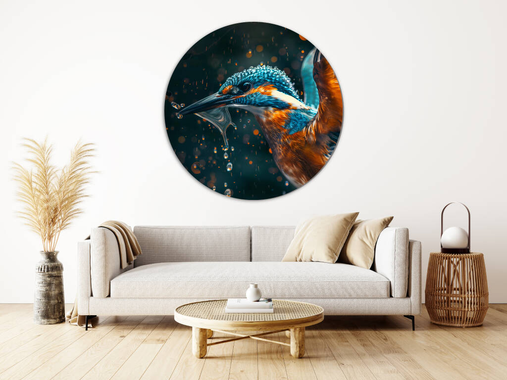 Rising Kingfisher vangt een prachtig moment waarin een ijsvogel triomfantelijk uit het water opstijgt. De sprankelende waterdruppels lijken te dansen in het licht, terwijl de levendige blauwe en oranje tinten van de vogel schitteren tegen een sfeervolle, donkerachtige achtergrond. Dit kunstwerk straalt kracht, precisie en natuurlijke schoonheid uit, waarbij de dynamiek van de jacht en de sierlijkheid van de ijsvogel samenkomen in een adembenemend tafereel.