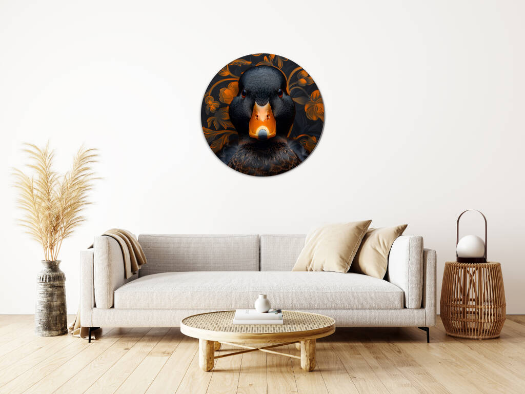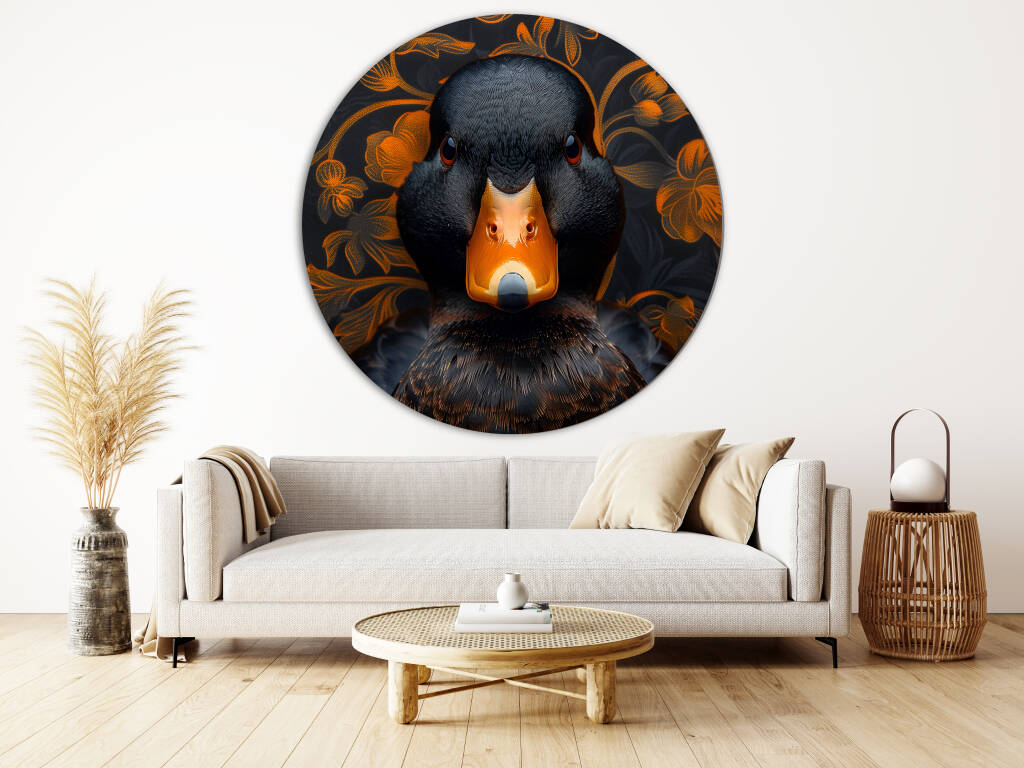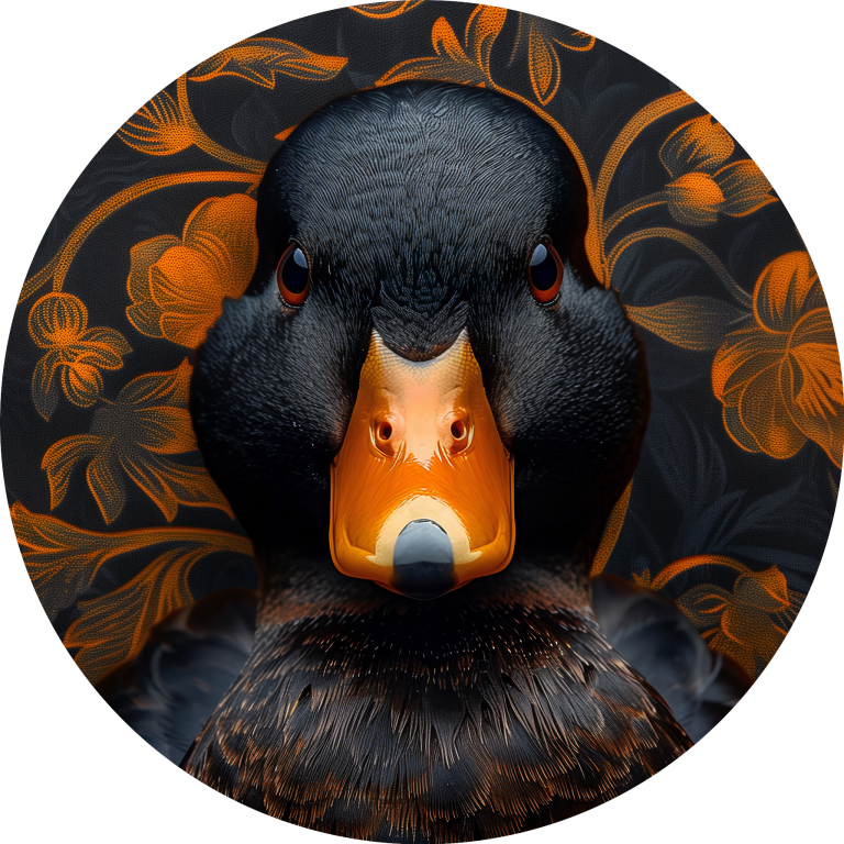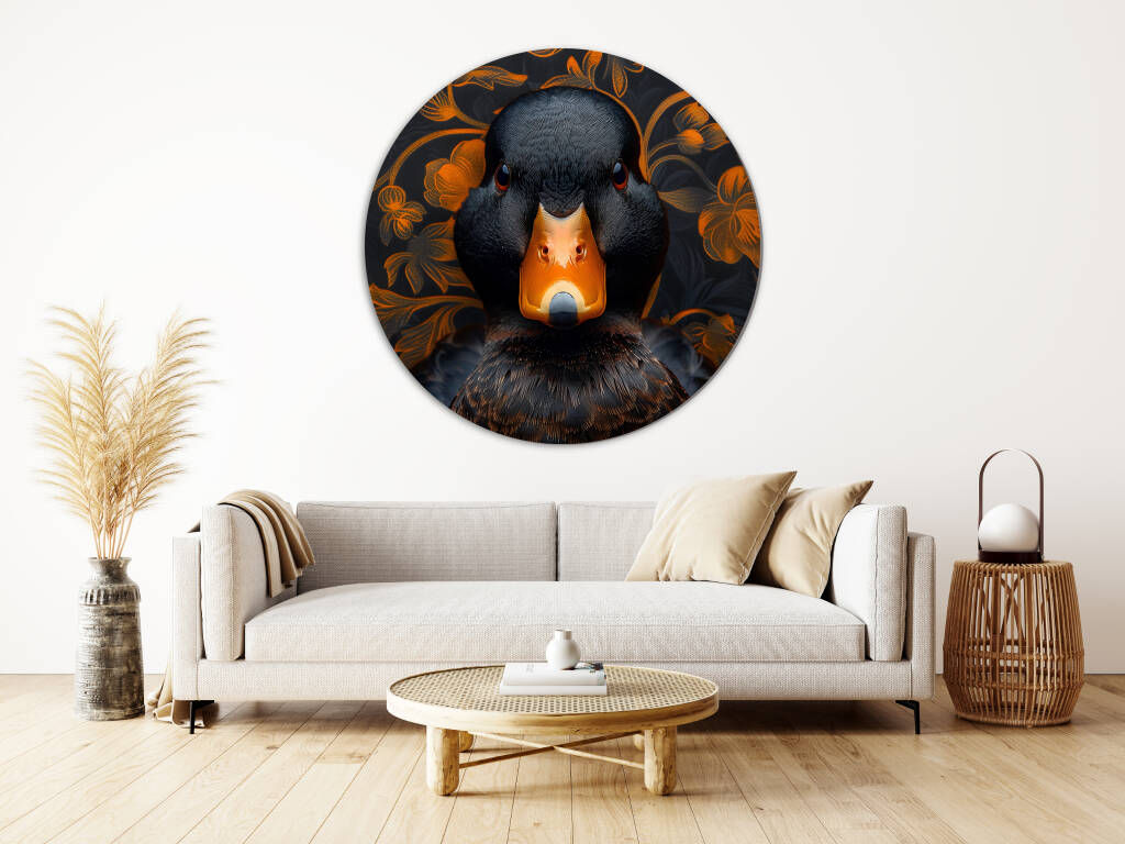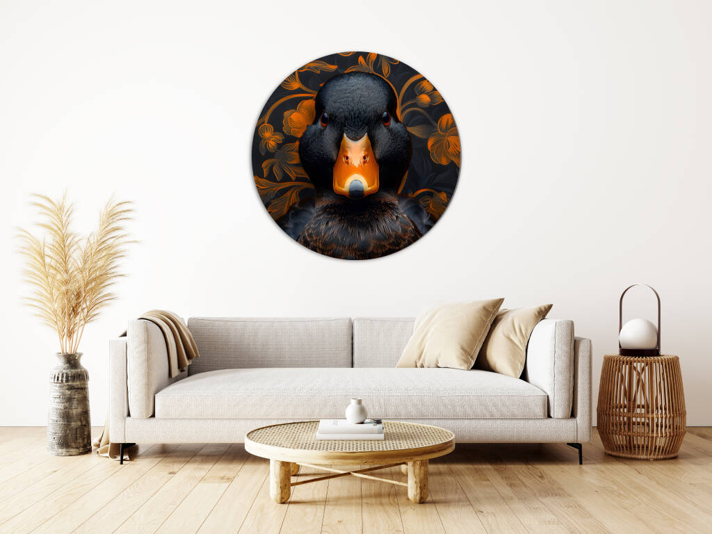 Judgy Duck is een eigenzinnig en stijlvol kunstwerk dat direct de aandacht trekt. In het midden prijkt een zwarte eend met een indringende, oordelende blik - alsof hij je recht aankijkt en zijn mening al klaar heeft. Zijn feloranje snavel vormt een krachtig contrast met het diepe zwart van zijn verenkleed. De achtergrond is rijk versierd met een patroon van oranje bloemen op een donkere ondergrond, wat een chique, barokke sfeer oproept. Deze combinatie van humor, elegantie en attitude maakt het een echte blikvanger met karakter.