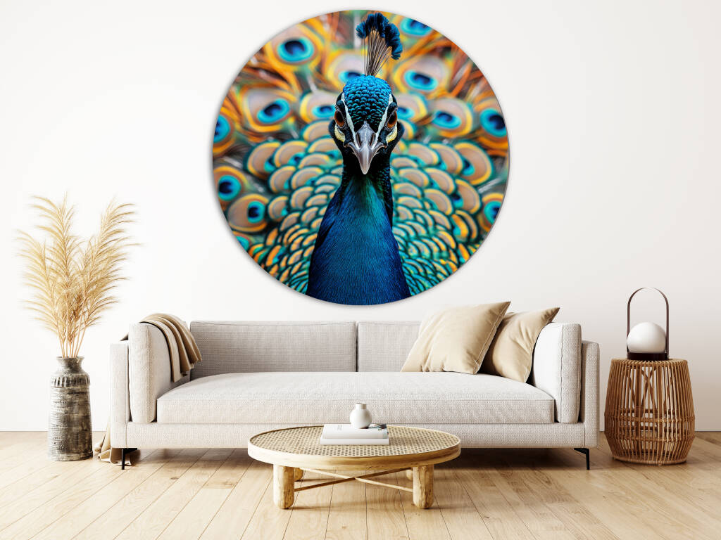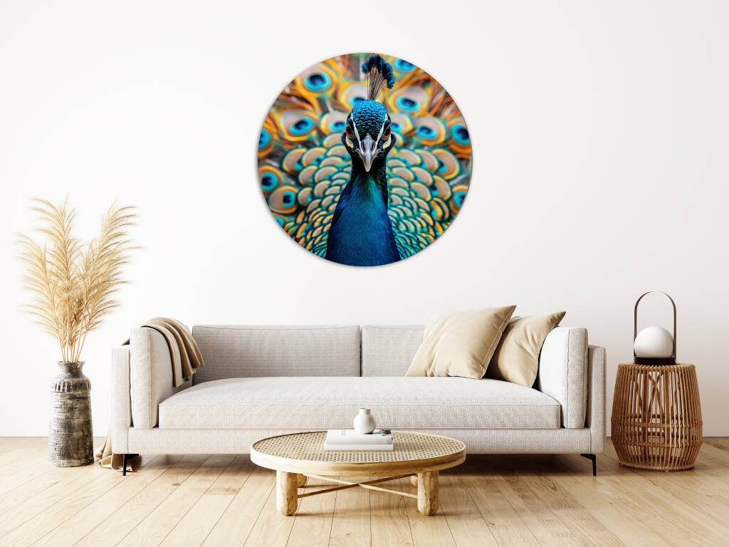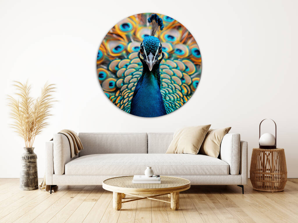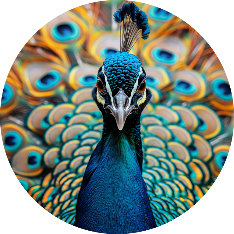 Look at Me presenteert een trotse pauw die zijn spectaculaire verenpracht tentoonspreidt in een explosie van turquoise en gouden tinten. De hypnotiserende ogen op de veren staren je aan terwijl de vogel zelfverzekerd poseert met zijn kroon van blauwe veren. Dit majestueuze portret vangt de natuurlijke ijdelheid en schoonheid van deze koninklijke vogel in al zijn glorie. Perfect voor wie houdt van opvallende natuurfotografie en de symboliek van trots en schoonheid waardeert.