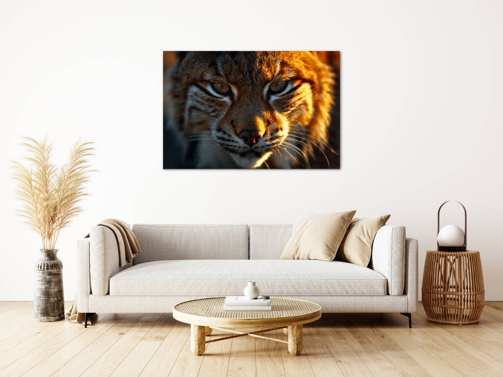 Red Lynx is een adembenemend portret dat de wilde en majestueuze uitstraling van de lynx in volle glorie vastlegt. De intense blik, gevangen in een close-up, straalt kracht en mysterie uit, terwijl het warme, gouden zonlicht de rijke roodbruine tinten van zijn vacht benadrukt. De fijne details van de ruige haren, de scherpe snorharen en de doordringende ogen geven het beeld een levensechte intensiteit, alsof de lynx op het punt staat om uit het doek te stappen. Dit kunstwerk ademt pure wilde elegantie en brengt de ongetemde schoonheid van de natuur direct in de leefruimte.