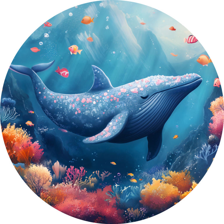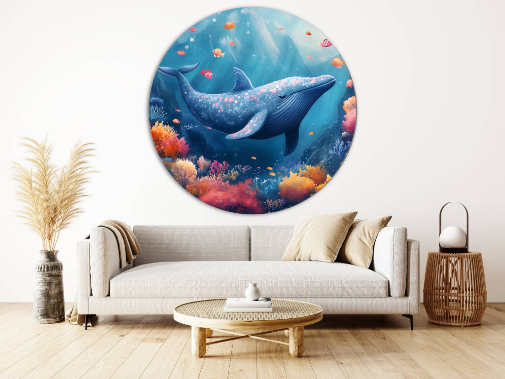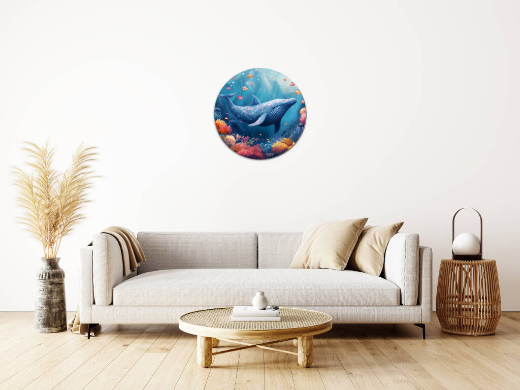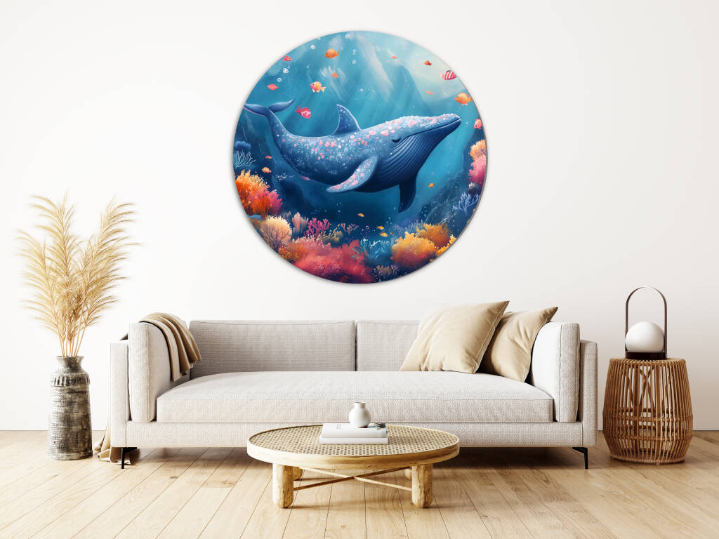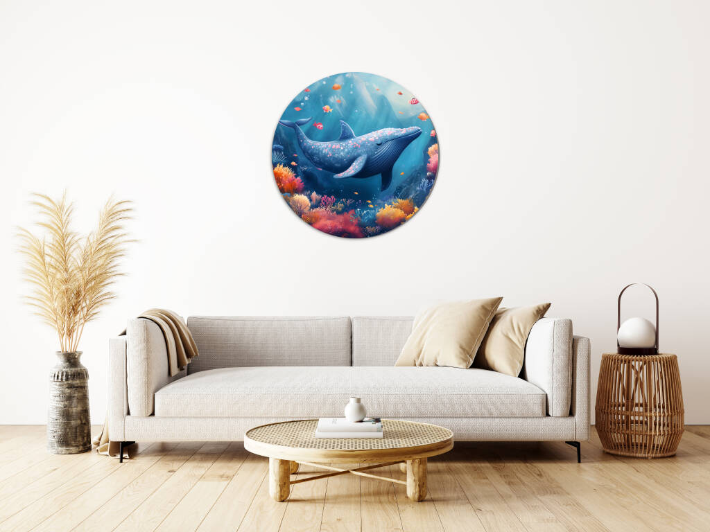 Whale Whale Whale duikt ons onder in een betoverende onderwaterwereld waar majestueuze walvissen zweven tussen koraaltuinen vol levendige kleuren. De warme oranje en roze koralen contrasteren prachtig met de diepe blauwkleuren van de oceaan, terwijl tropische vissen vrolijk door het kristalheldere water dartelen. Dit dromerige onderwaterparadijs straalt sereniteit en natuurlijke schoonheid uit. Perfect voor wie houdt van de mysterieuze charme van de oceaan en een vleugje fantasie in hun interieur wil brengen.