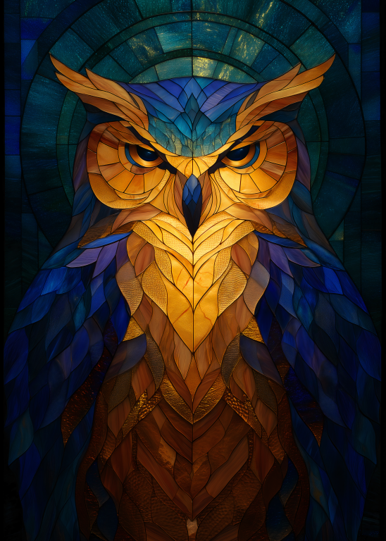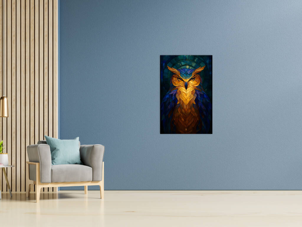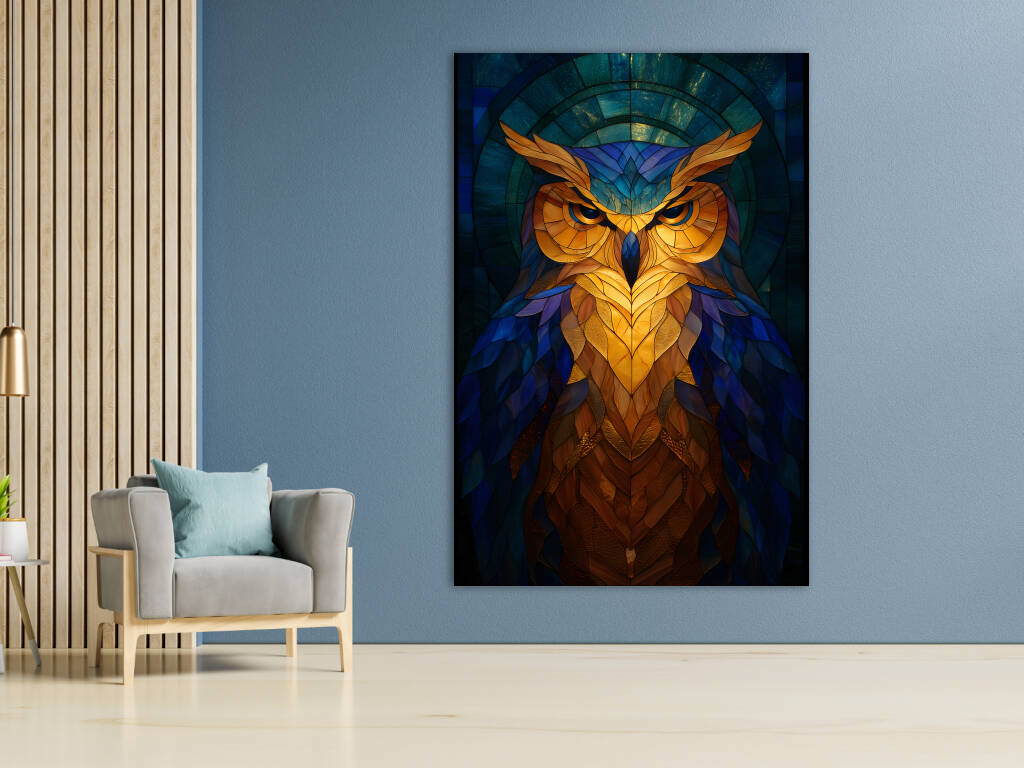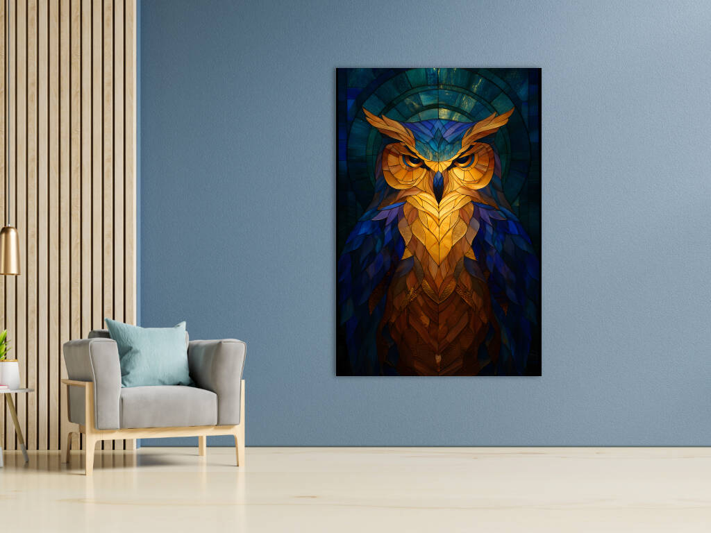 Stained Glass Owl presenteert een majestueuze uil uitgevoerd in de stijl van gebrandschilderd glas, waar gouden en blauwe tinten samenkomen in een hypnotiserend mozaïek. De wijze blik van de uil straalt door het geometrische patroon heen, terwijl het licht lijkt te dansen door de glasachtige vlakken. Dit spirituele kunstwerk combineert natuurlijke wijsheid met sacrale kunst op een moderne manier. Perfect voor liefhebbers van mystieke dieren en decoratieve glaskunst.