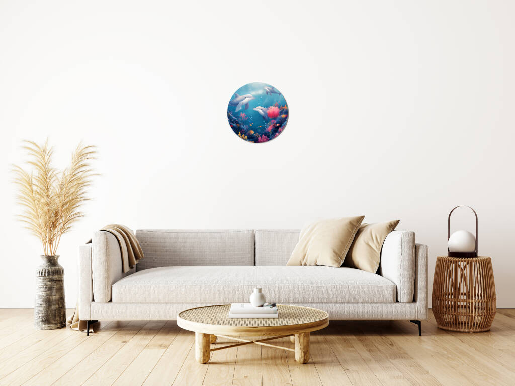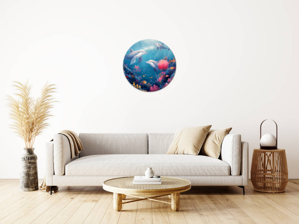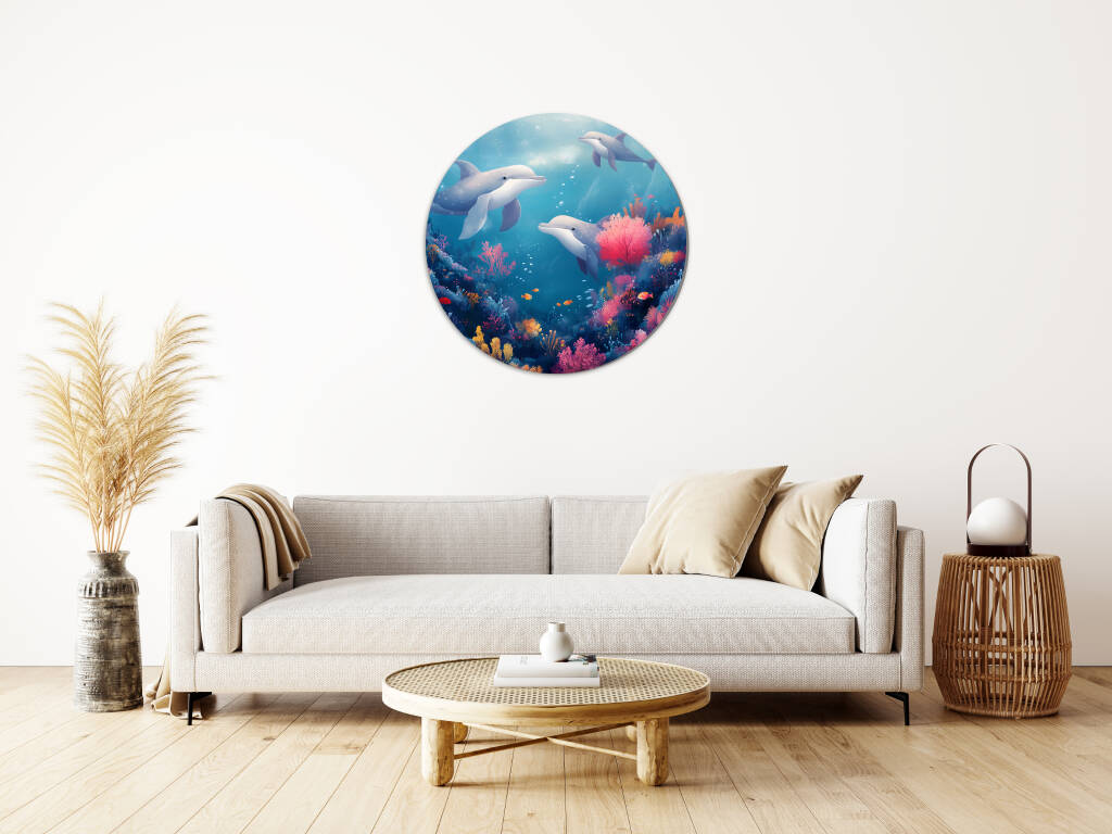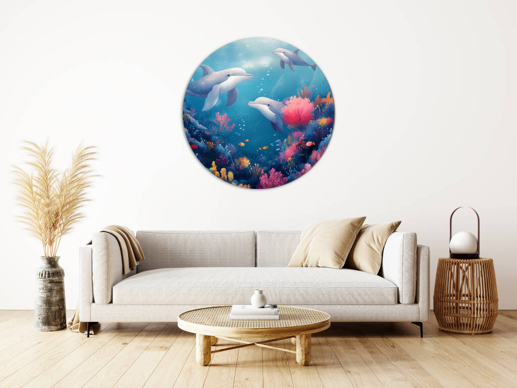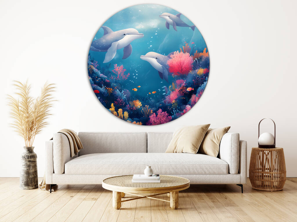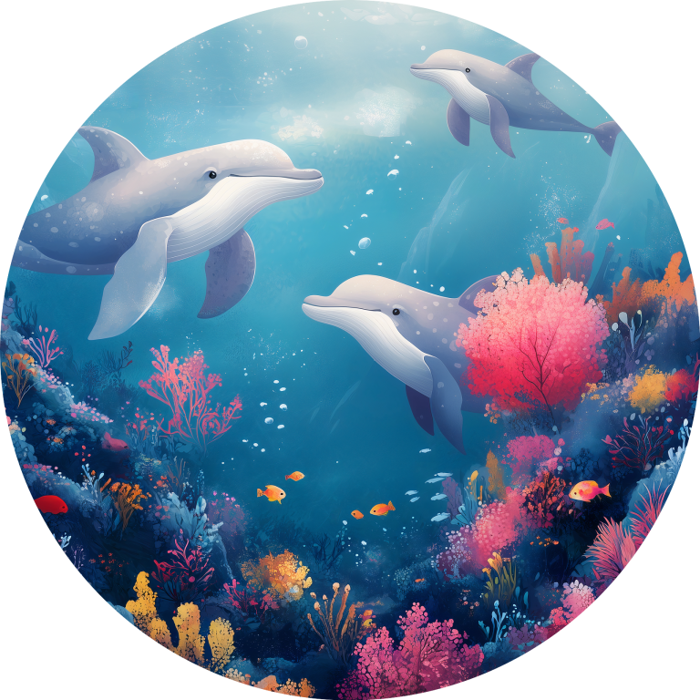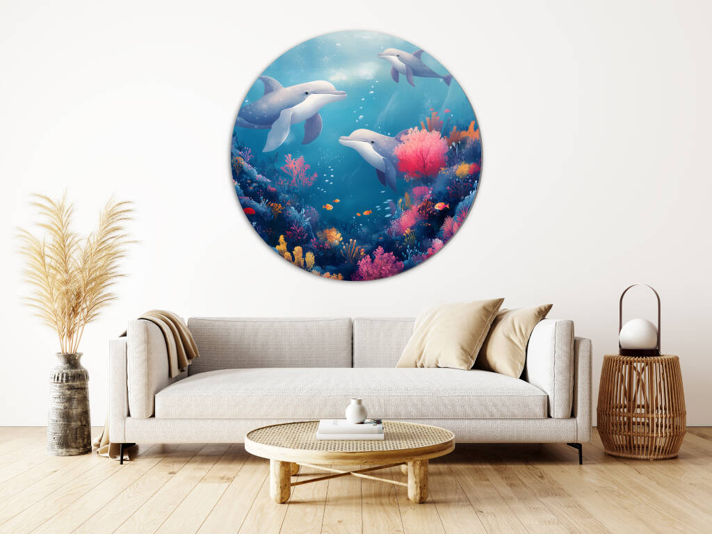 In dit betoverende onderwaterlandschap zweven drie speelse dolfijnen sierlijk door een levendig koraalrif. Omringd door een explosie van kleuren – met tinten roze, oranje, geel en blauw – straalt de scène een gevoel van rust en magie uit. Het kristalheldere water, gevuld met kleine luchtbelletjes en nieuwsgierige tropische vissen, nodigt de kijker uit om zich onder te dompelen in deze serene en dromerige oceaanwereld. De zachte gloed van het zonlicht dat door het water filtert, geeft de afbeelding een sprookjesachtige sfeer. Dit kunstwerk vangt niet alleen de schoonheid van de zee, maar ook de speelse en intelligente aard van dolfijnen, waardoor het een ware blikvanger is in iedere ruimte.