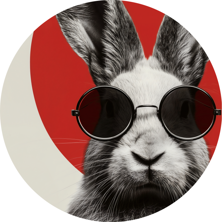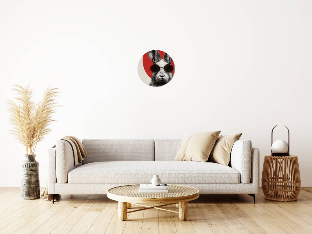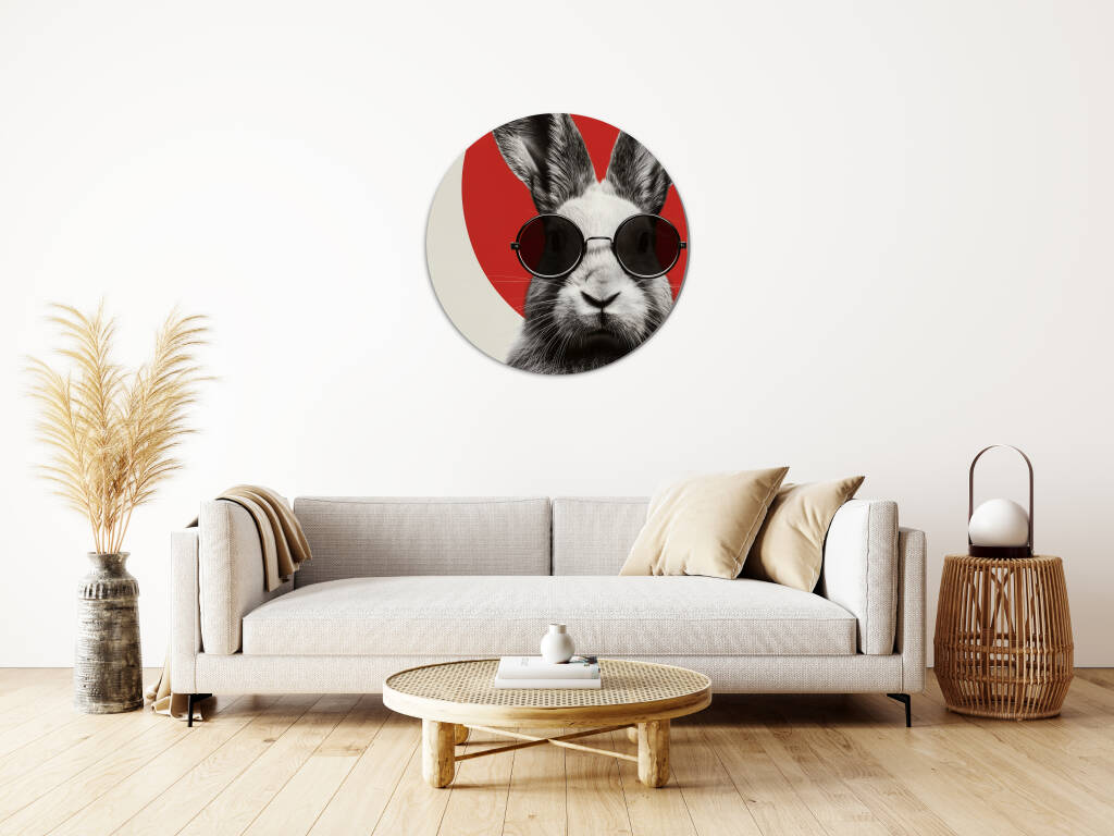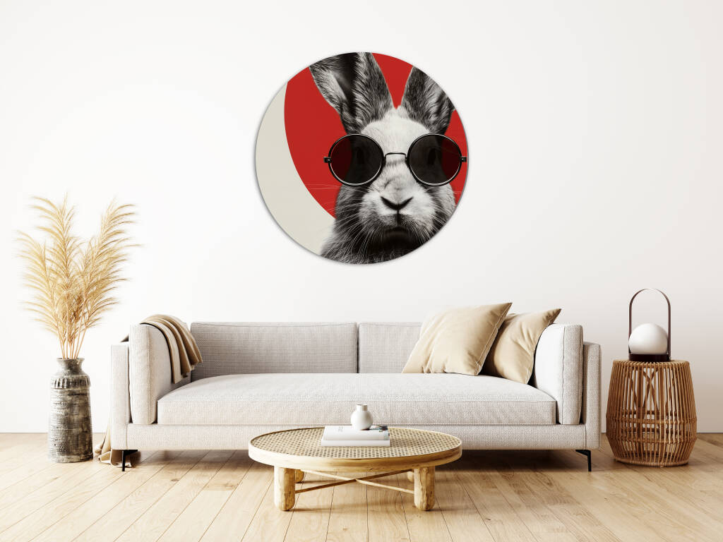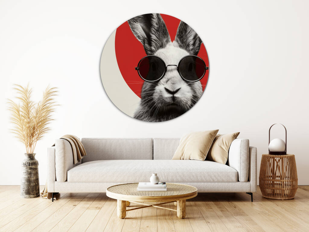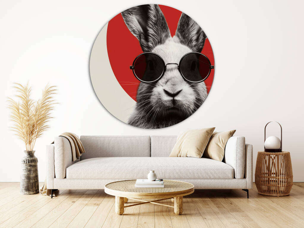 Cool Bunny Portrait is een iconisch Bauhaus-geïnspireerd kunstwerk dat minimalistische elegantie combineert met speelse coolness. Een majestueus konijn kijkt zelfverzekerd door ronde zonnebril de wereld in, terwijl een perfecte rode cirkel als een heiligenschijn achter hem zweeft. De zwart-wit fotografie contrasteert prachtig met de felrode achtergrond, wat resulteert in een tijdloos design statement. Dit kunstwerk belichaamt de perfecte balans tussen grafische kracht en dierlijke charme.