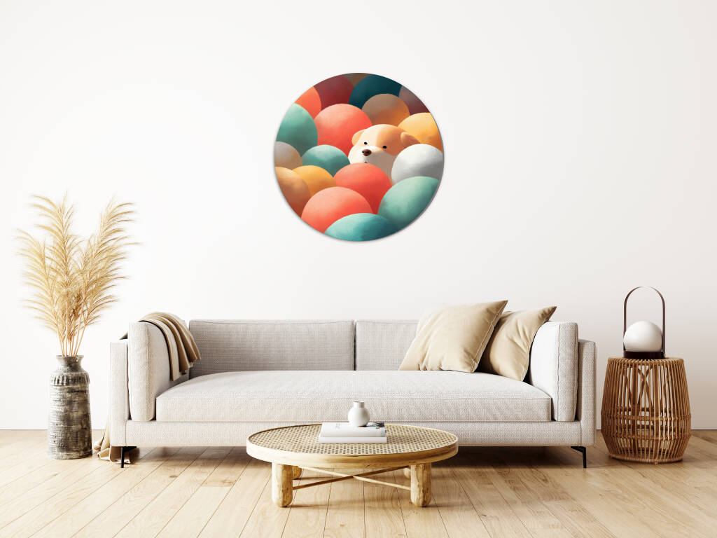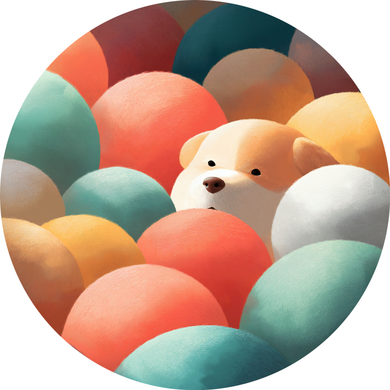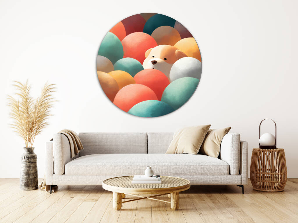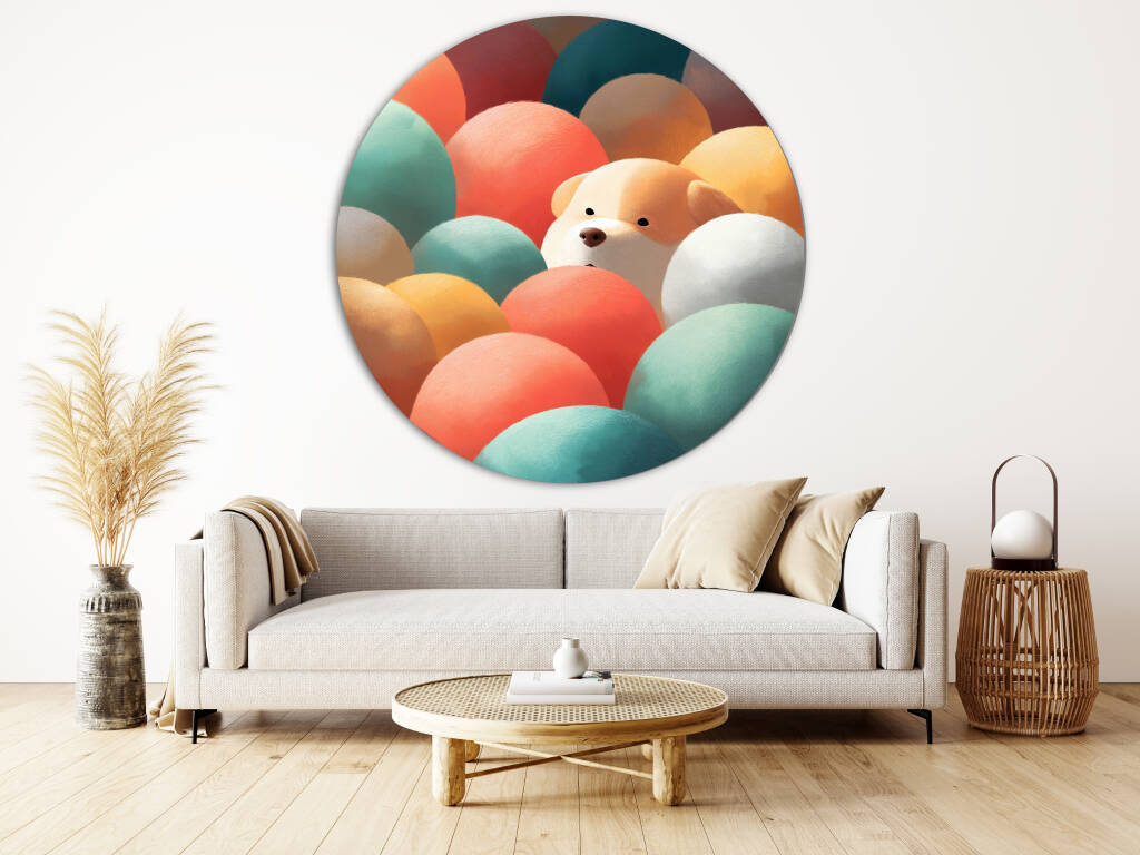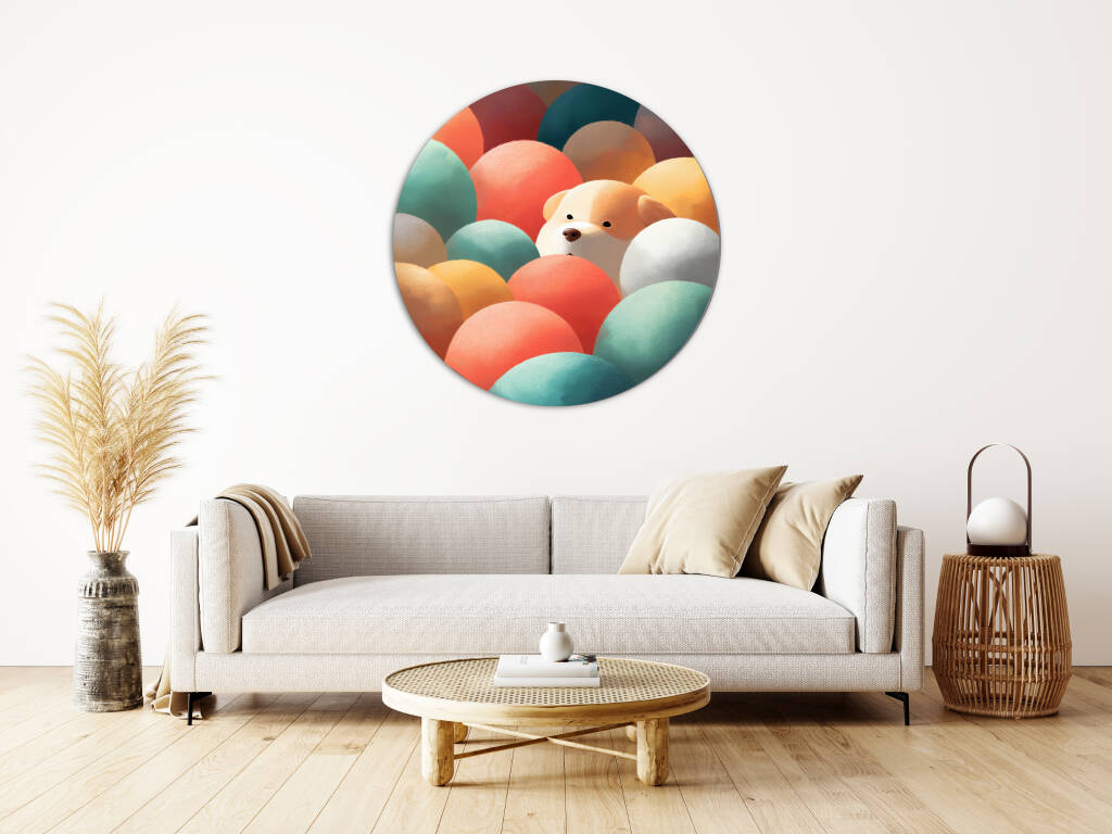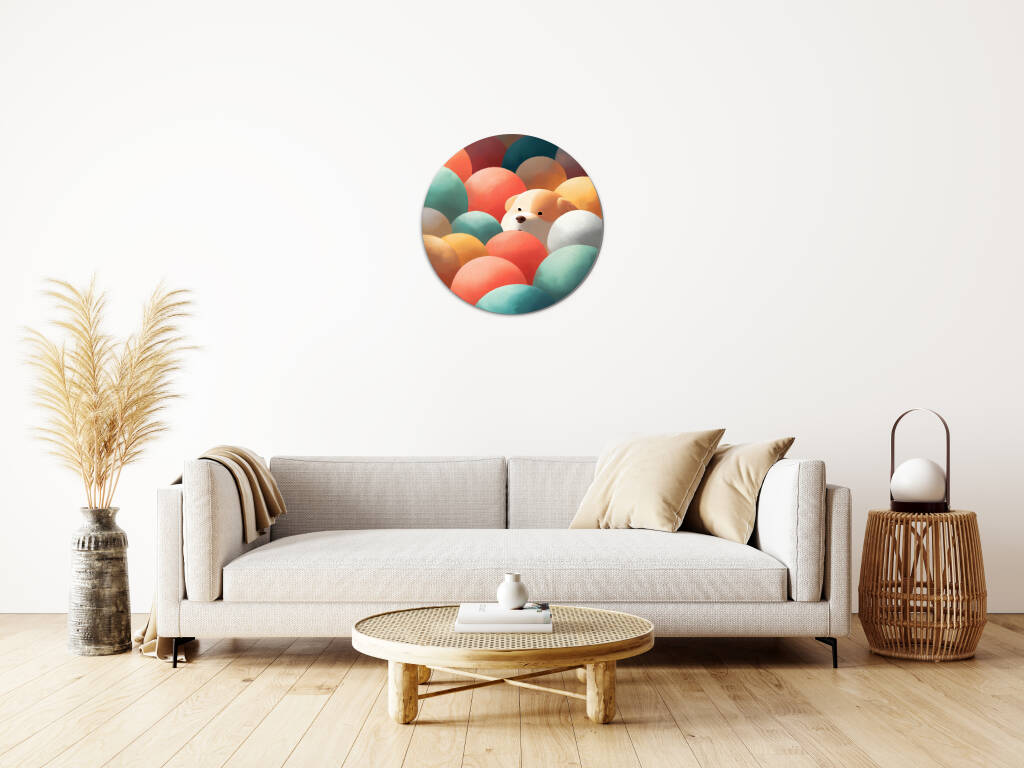 Dog Balloons toont een schattige hond die speels tevoorschijn piept tussen kleurrijke ballonnen. Het vriendelijke gezicht met grote, expressieve ogen wordt omringd door een feestelijke verzameling van felgekleurde bollen in alle tinten van de regenboog. De vrolijke compositie straalt pure blijdschap uit en brengt een speelse energie in elke ruimte. Dit kunstwerk is een perfecte keuze voor hondenliefhebbers en iedereen die houdt van een vrolijke, kleurrijke sfeer.