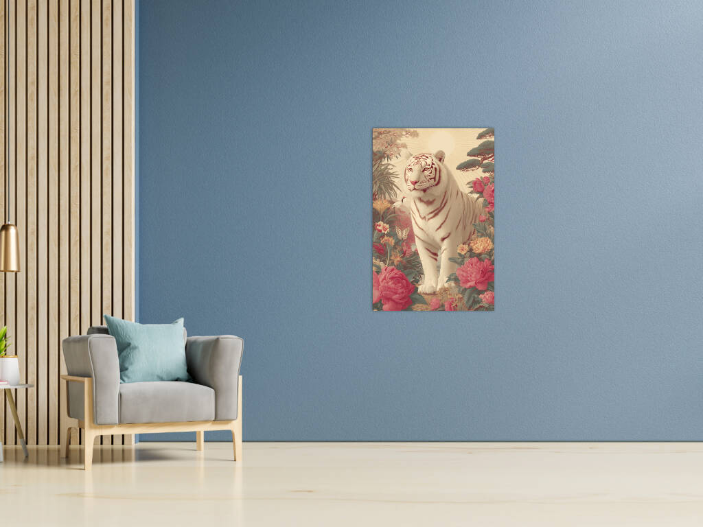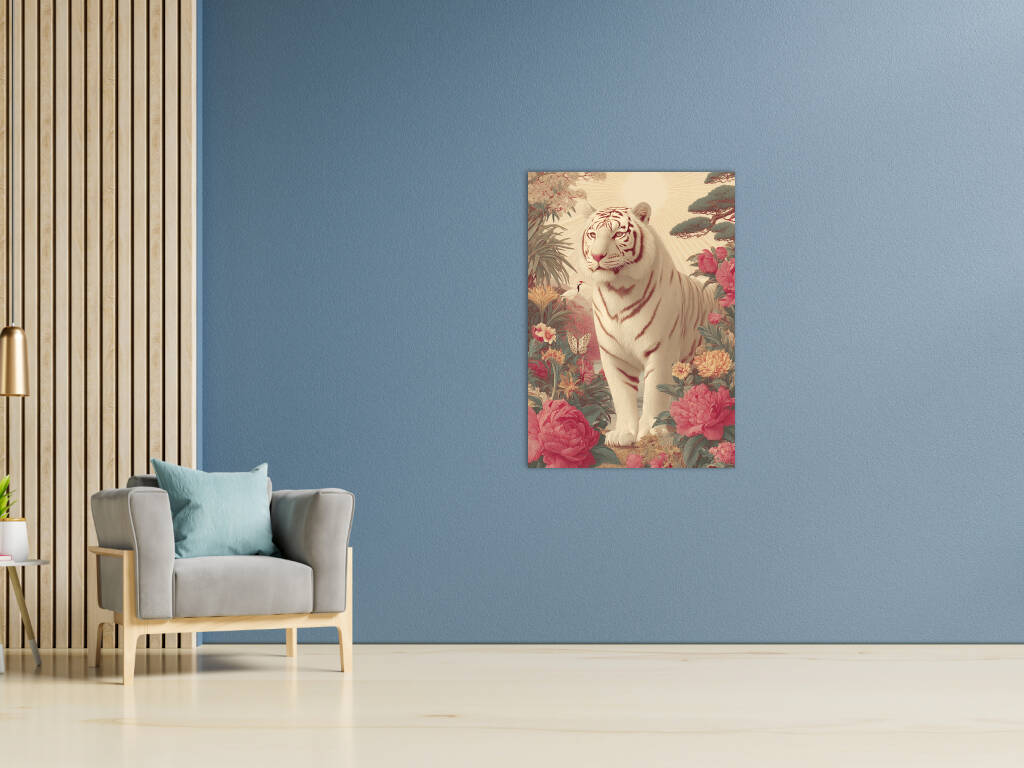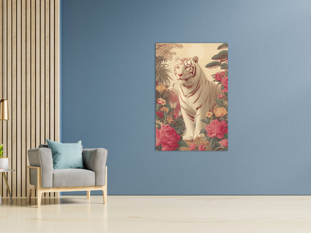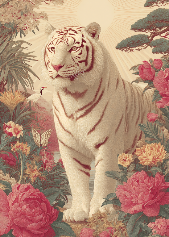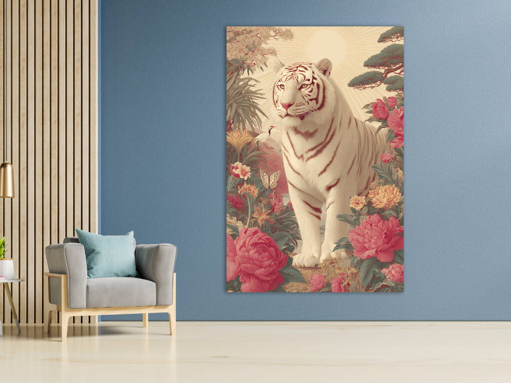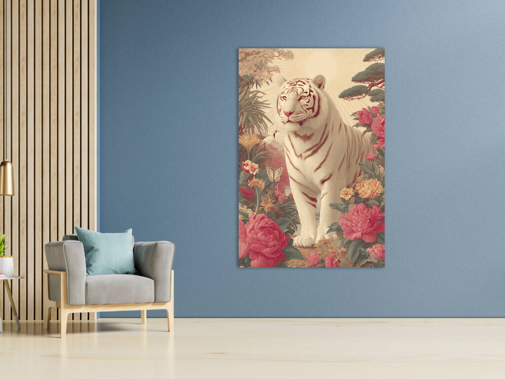 Floral White Tiger presenteert een majestueuze witte tijger in een weelderig paradijs van Oosterse elegantie. Omringd door bloeiende pioenrozen, exotische planten en delicate vlinders, straalt deze tijger koninklijke gratie uit. De warme zonnestralen op de achtergrond verlichten het tafereel als een goddelijke zegening. Dit luxueuze kunstwerk combineert de kracht van de natuur met botanische schoonheid in een verfijnde Aziatische kunststijl, perfect voor wie houdt van exotische elegantie en tijdloze schoonheid.