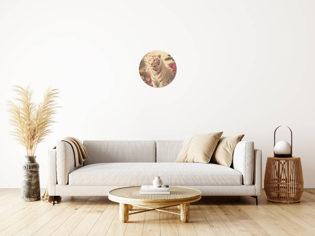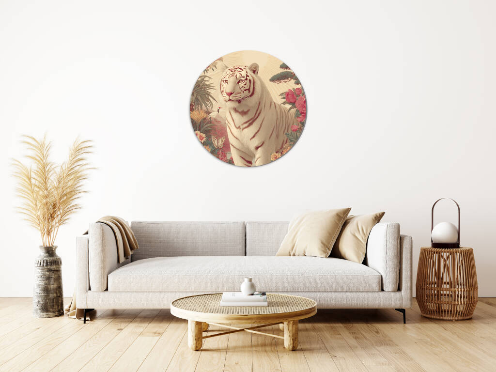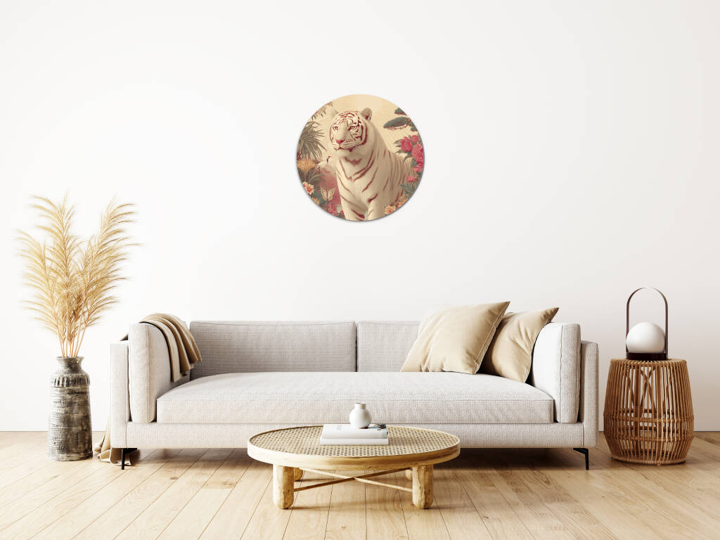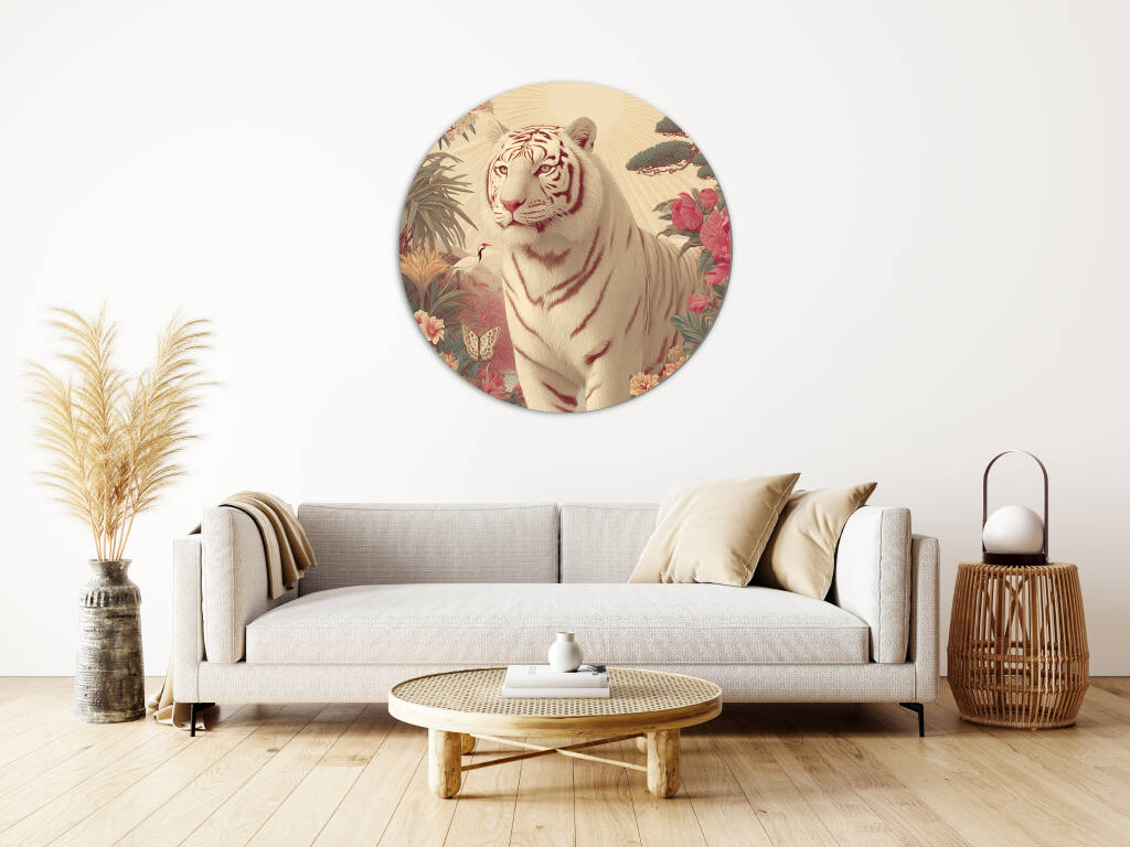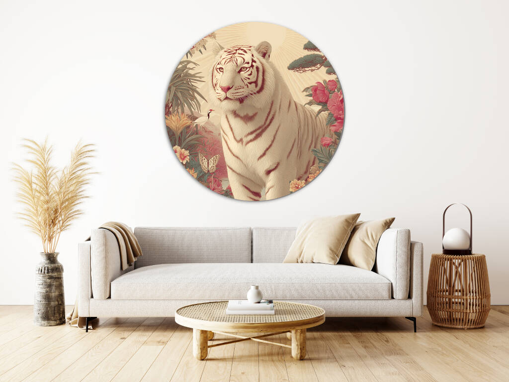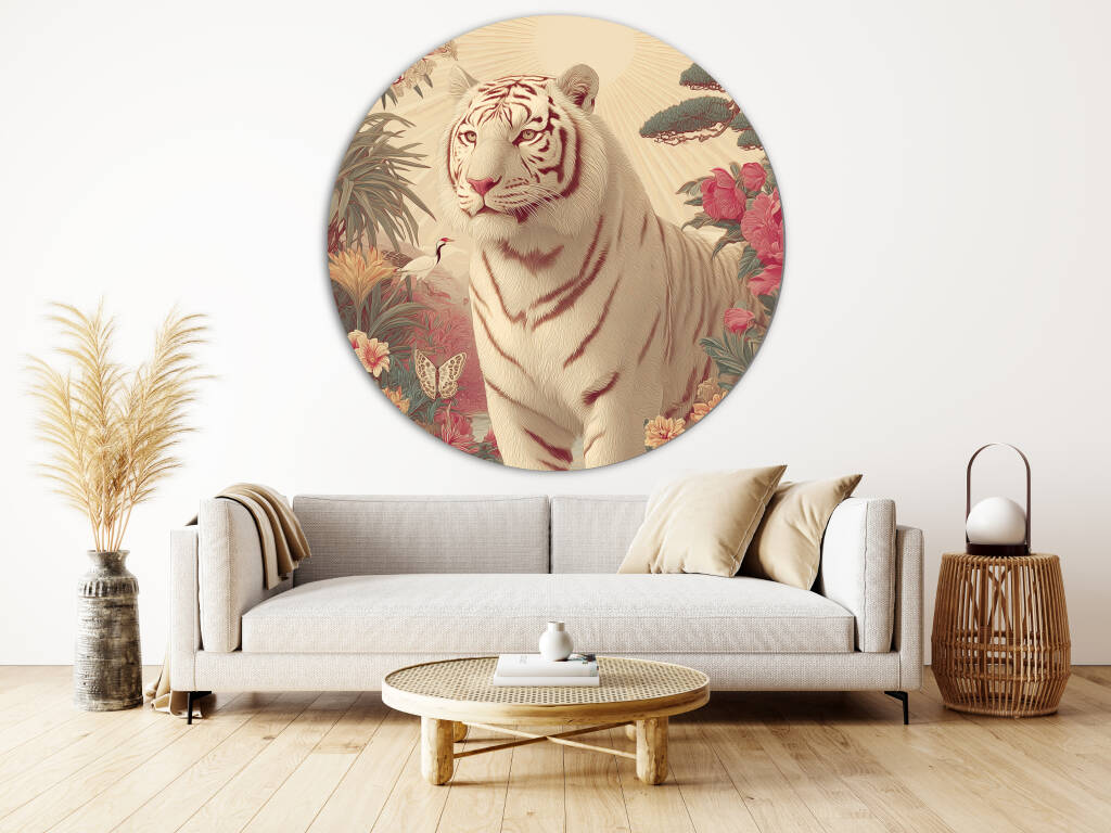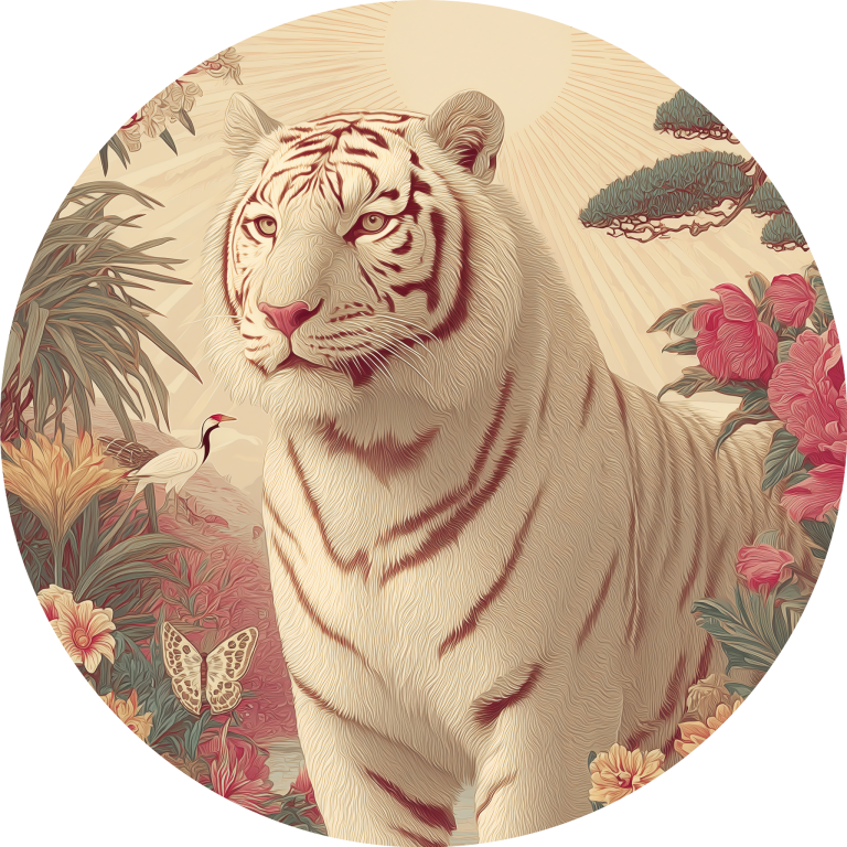 Floral White Tiger presenteert een majestueuze witte tijger in een weelderig paradijs van Oosterse elegantie. Omringd door bloeiende pioenrozen, exotische planten en delicate vlinders, straalt deze tijger koninklijke gratie uit. De warme zonnestralen op de achtergrond verlichten het tafereel als een goddelijke zegening. Dit luxueuze kunstwerk combineert de kracht van de natuur met botanische schoonheid in een verfijnde Aziatische kunststijl, perfect voor wie houdt van exotische elegantie en tijdloze schoonheid.