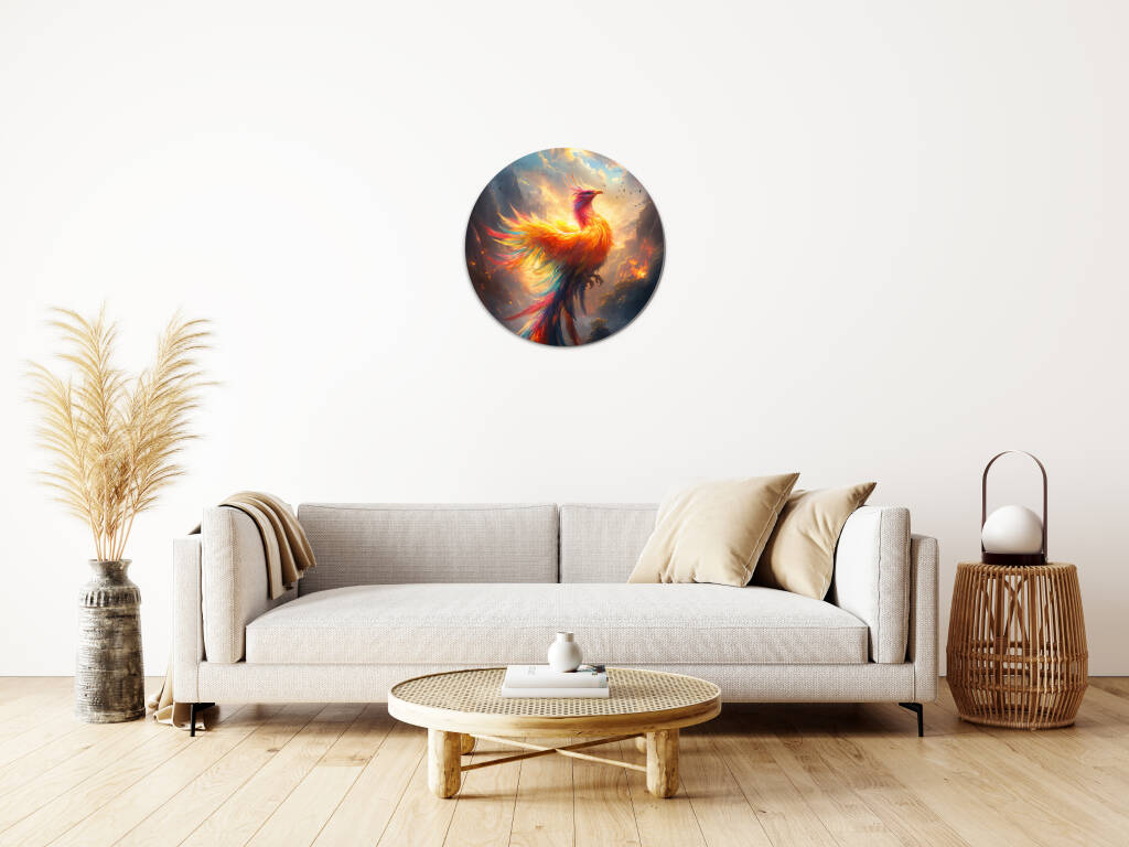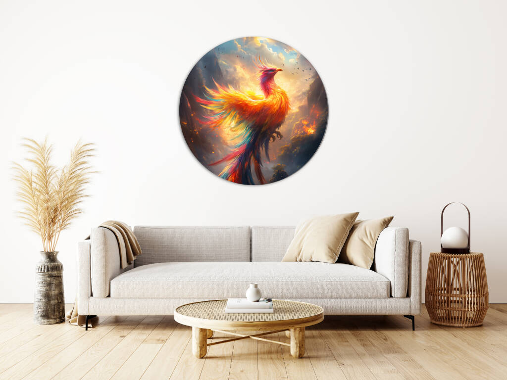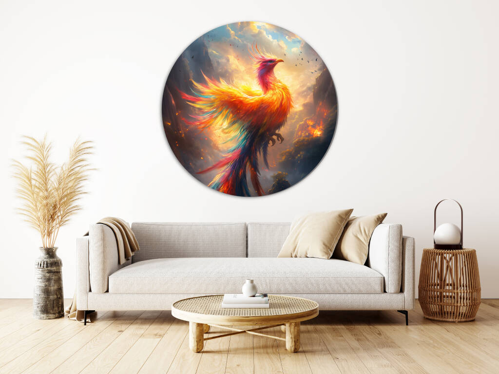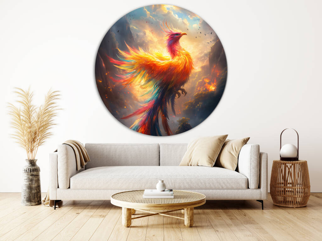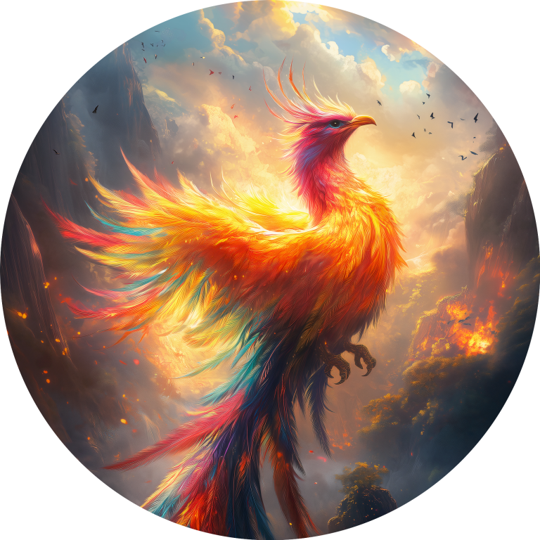 Mystical Phoenix rijst op uit vuur en as in een spectaculaire explosie van gouden en oranje vlammen tegen een dramatische hemelachtergrond. De majestueuze vogel straalt kracht en wedergeboorte uit, waarbij elke veer lijkt te dansen in het vuur van transformatie. Dit epische fantasiekunstwerk symboliseert hoop, vernieuwing en de onverwoestbare kracht van de geest. Perfect voor wie gelooft in tweede kansen en de magie van mythische wezens koestert.