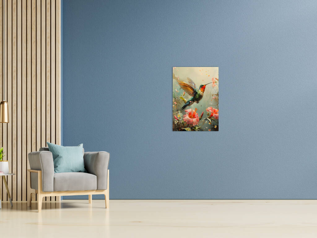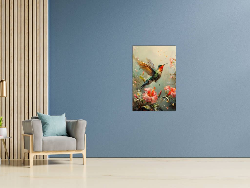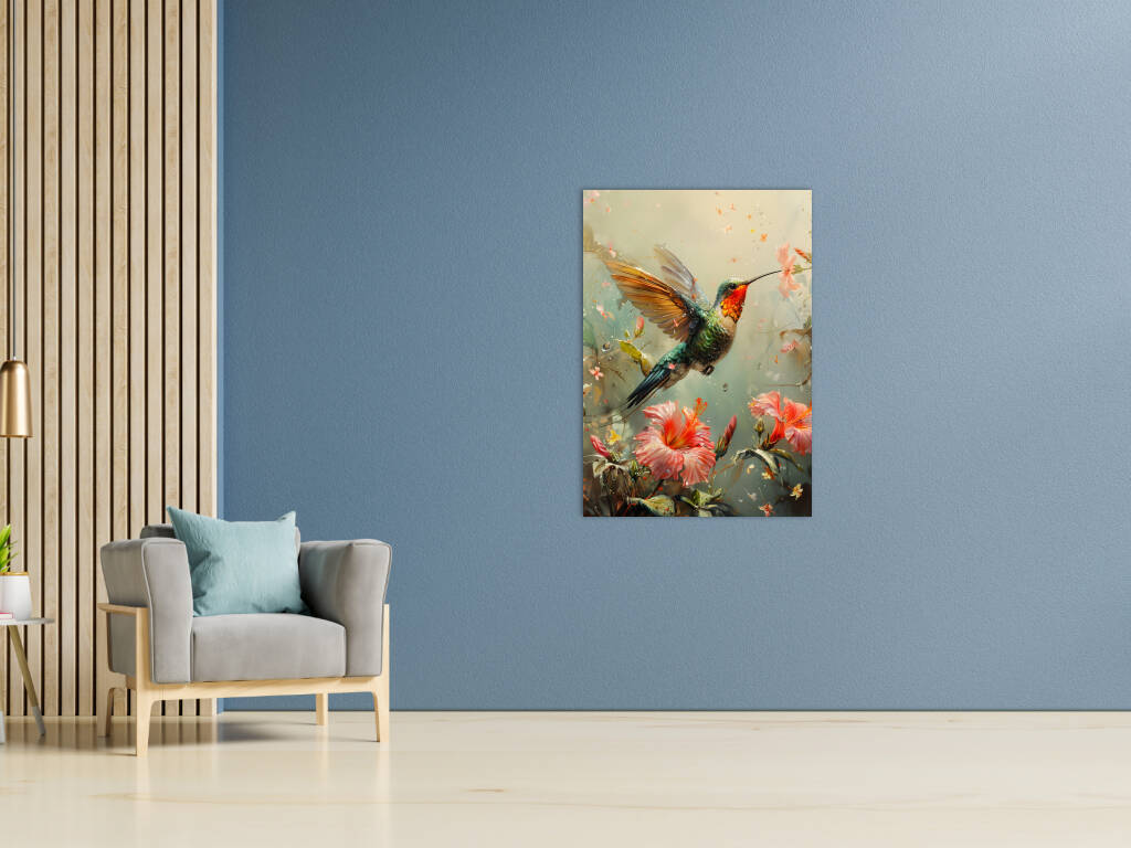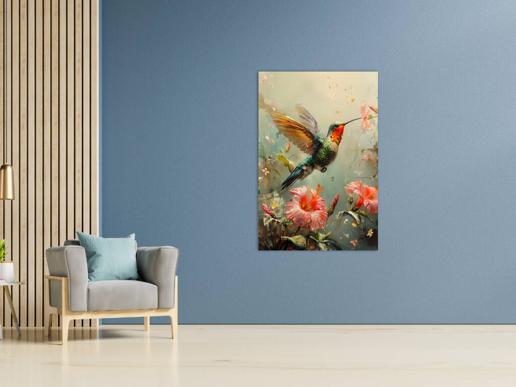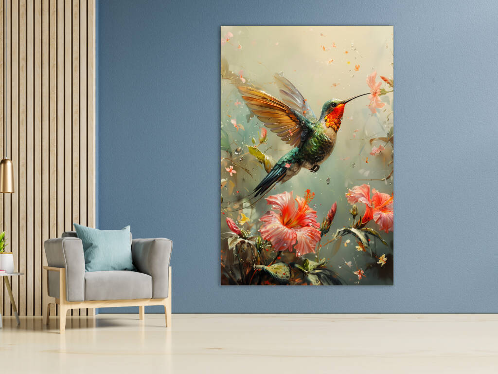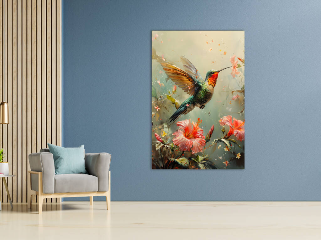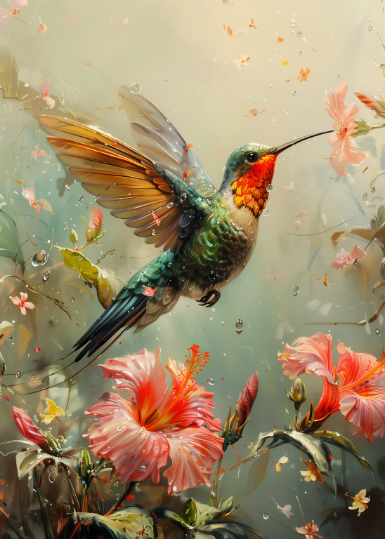 Hungry Hummingbird vangt het betoverende moment waarop een kolibrie, met zijn iriserende groene en oranje verenkleed, elegant in de lucht zweeft terwijl hij zich voedt met de nectar van felgekleurde hibiscusbloemen. De dynamiek van zijn gespreide vleugels en de vallende dauwdruppels versterken de levendigheid van het tafereel. De zachte, dromerige achtergrond contrasteert prachtig met de gedetailleerde bloemen en het delicate silhouet van de vogel, waardoor een harmonieuze compositie ontstaat die de schoonheid en fragiliteit van de natuur weerspiegelt.