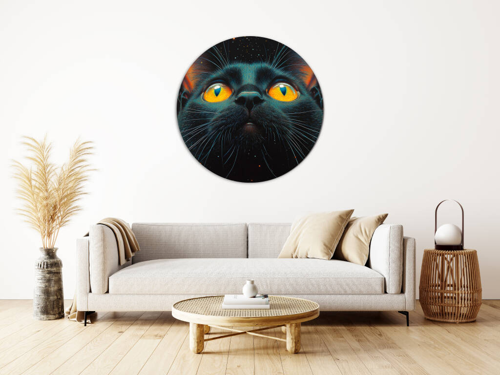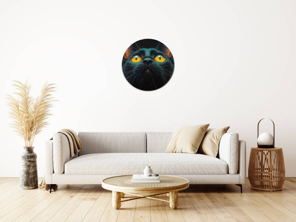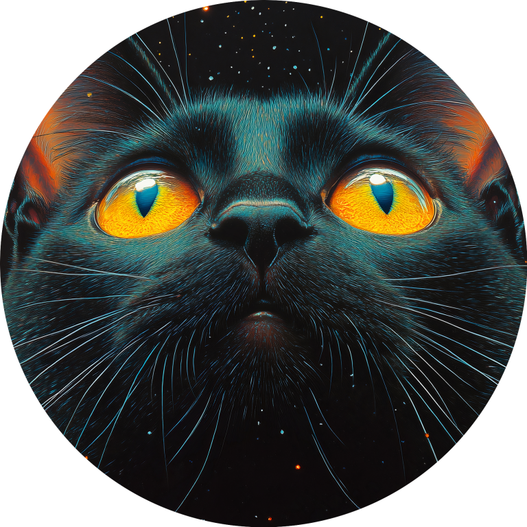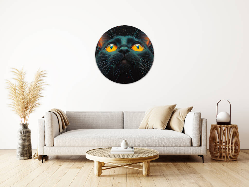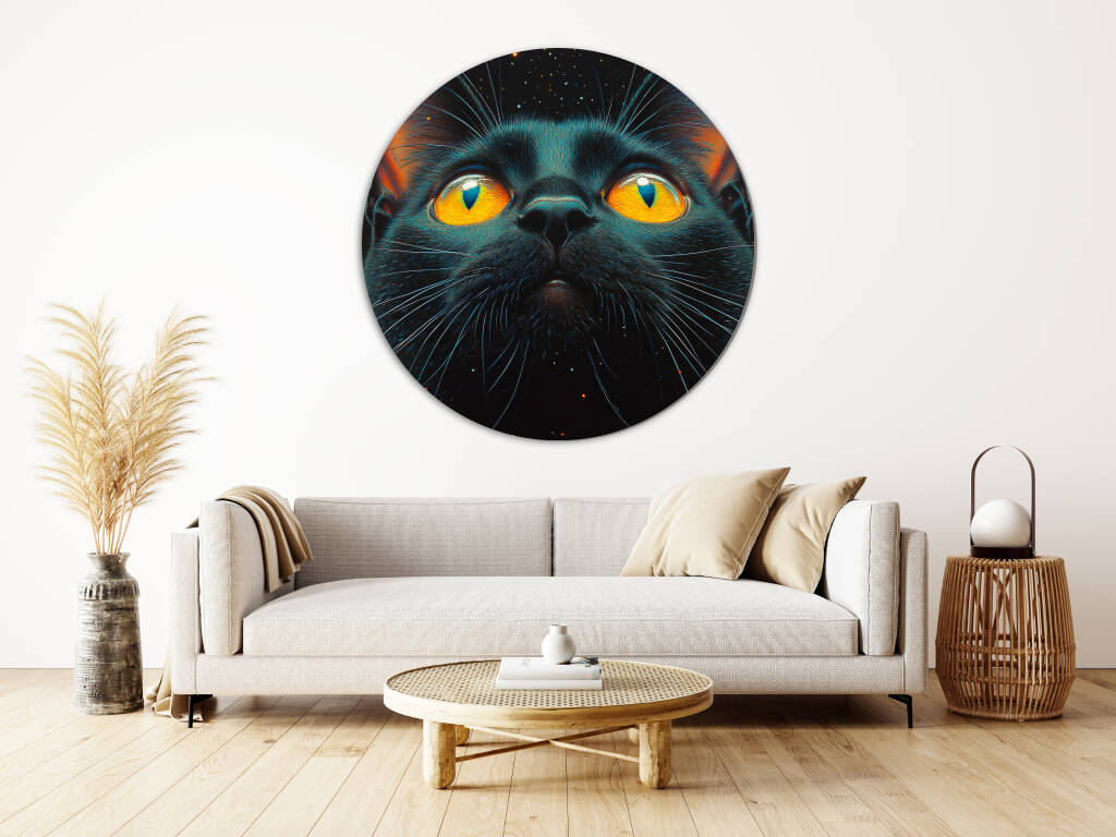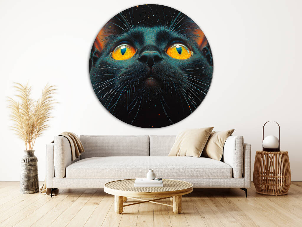 Space Cat toont een mysterieuze zwarte kat met hypnotiserende gouden ogen die rechtstreeks uit de diepten van het universum lijkt te kijken. De kosmische achtergrond vol sterren en planeten versterkt de buitenaardse aura van dit feline wezen, terwijl zijn doordringende blik een gevoel van intelligentie en mystiek uitstraalt. De rijke contrasten tussen het diepe zwart van de vacht en de warme gouden accenten creëren een dramatische en betoverende compositie. Dit fascinerende kunstwerk combineert de mystiek van katten met de oneindige wonderen van de ruimte.